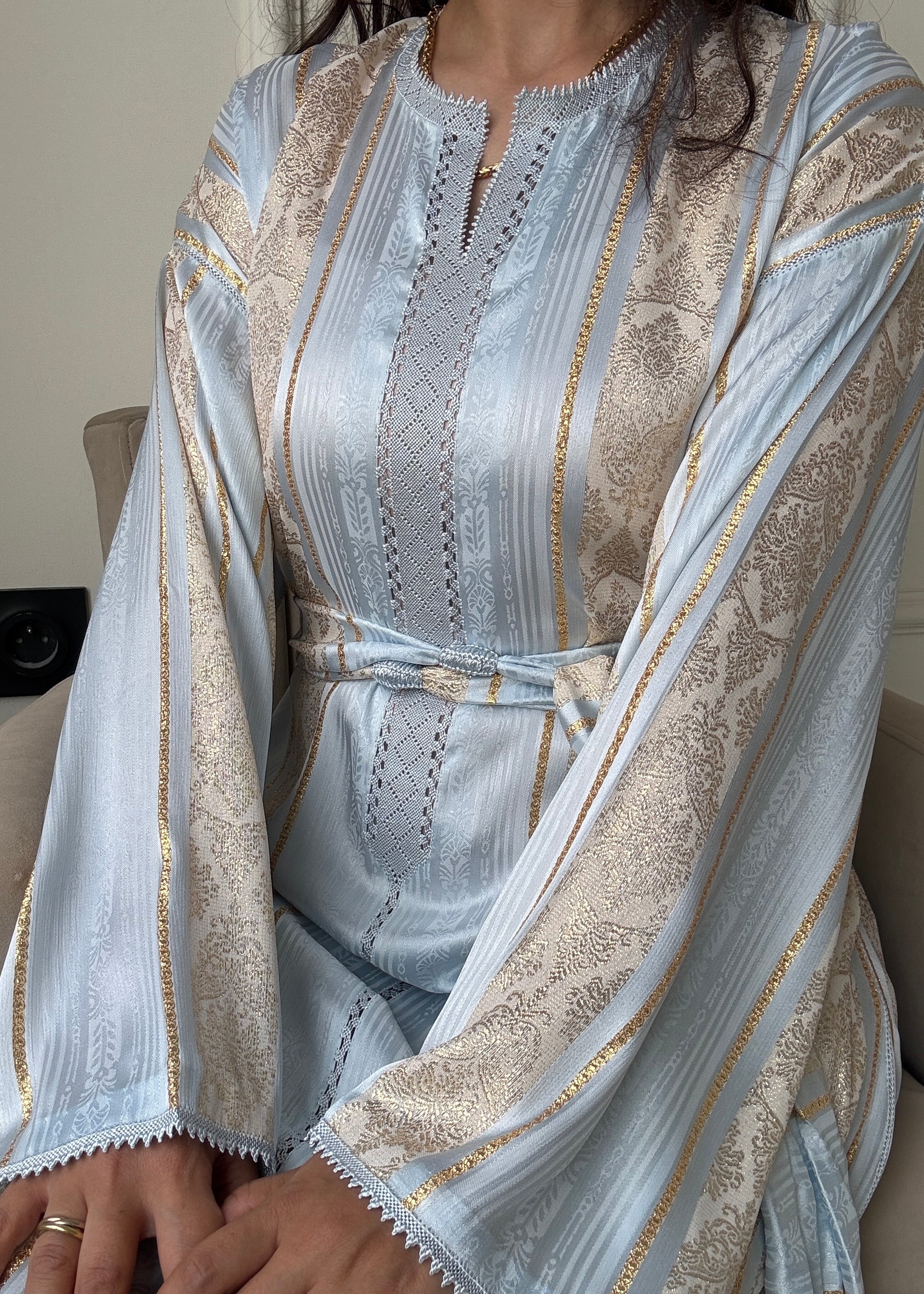 Ce caftan est disponible dans 2 tailles convenant aux tailles S/M et L/XL avec une coupe makhzania et longueur de 145 cm.