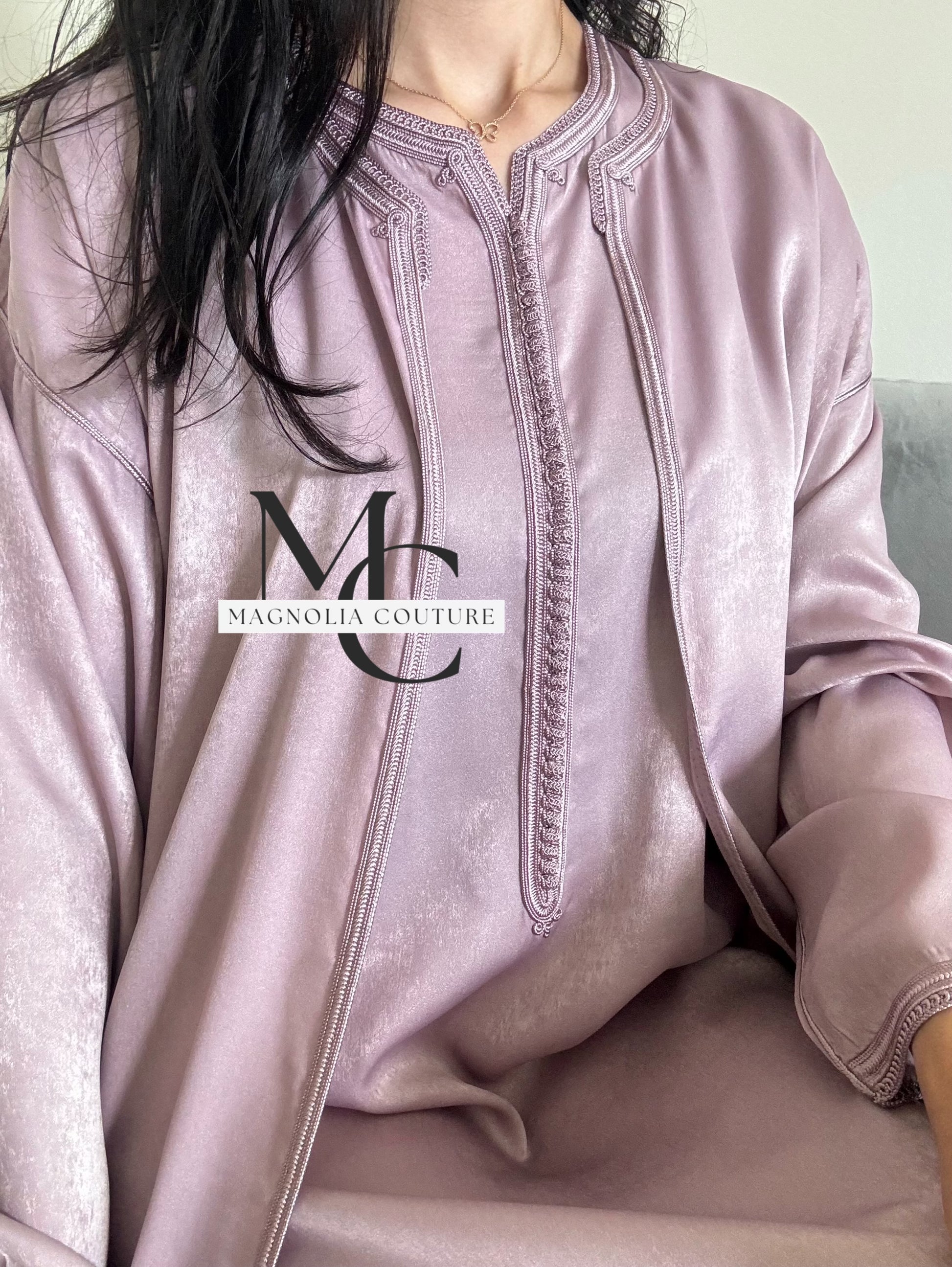 Caftan en tissu satiné allie élégance et modernité. Son travail de mallam finement réalisé et sa ceinture nouée ajoutent une touche raffinée. Idéale pour les occasions spéciales, elle incarne la simplicité chic et le savoir-faire artisanal de Magnolia Couture.