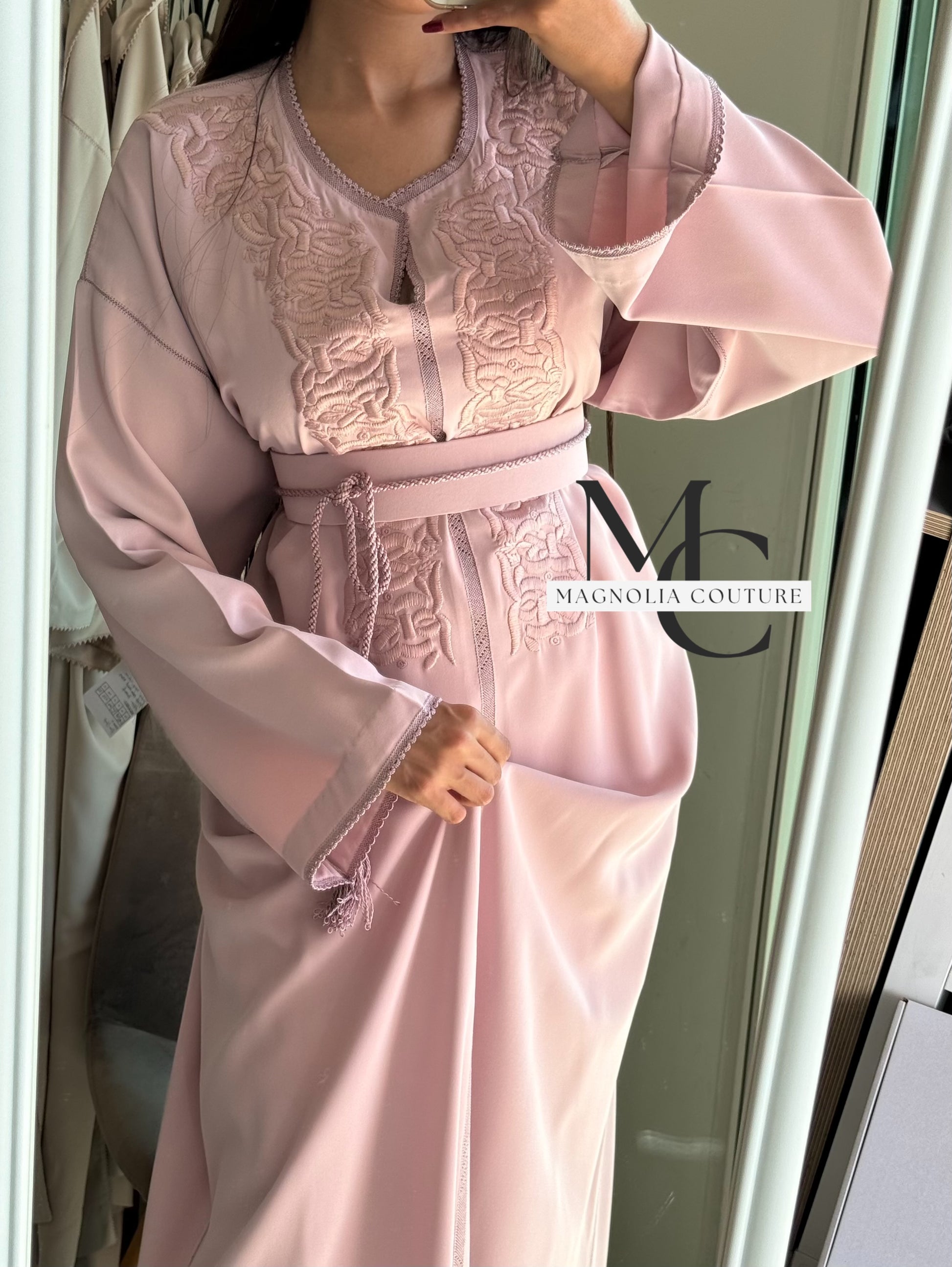 Description : Le caftan est brodé avec tarz rbati, et cousue à la main avec randa.