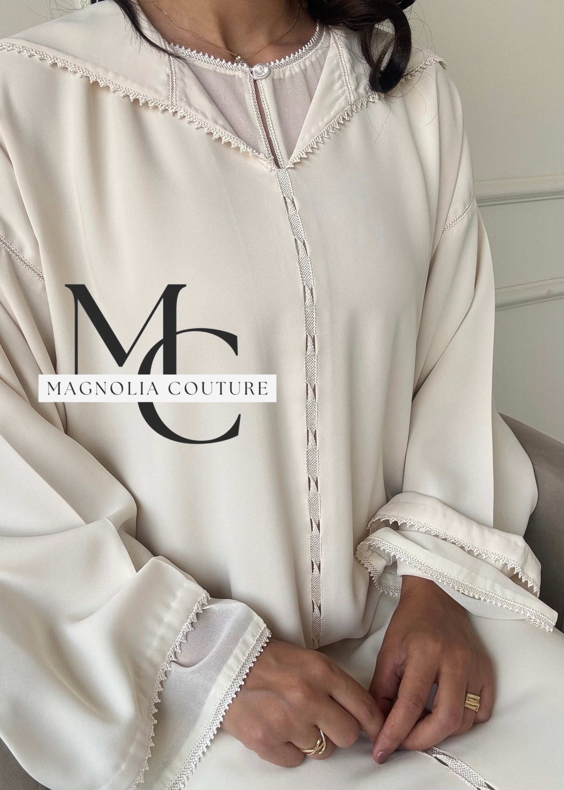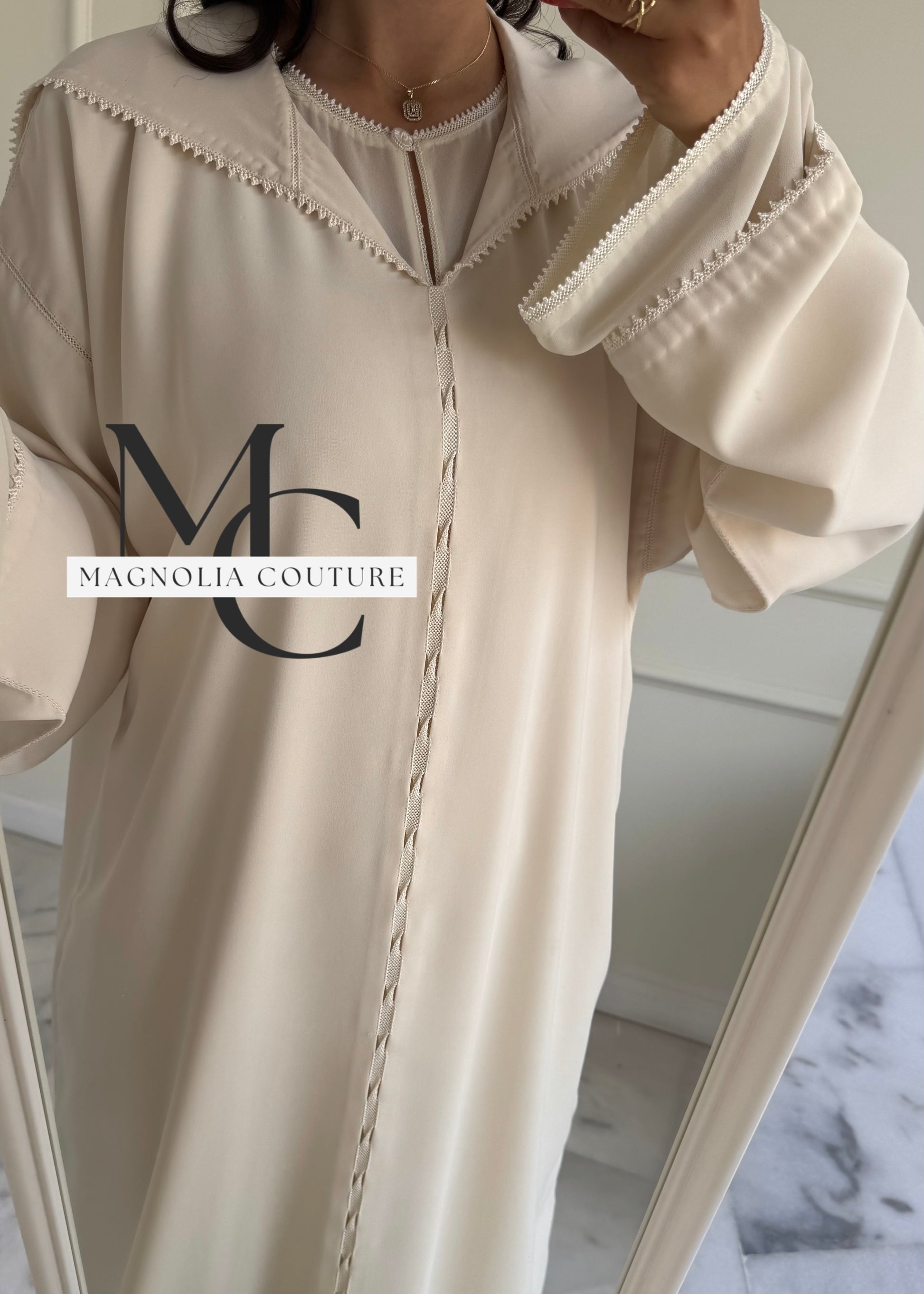 Description :Elégante djellaba blanche, travaillée avec randa , parfaitement adaptée pour les moments sacrés tels que l'omra, le hajj, ou les cérémonies de mariage, alliant simplicité et sophistication