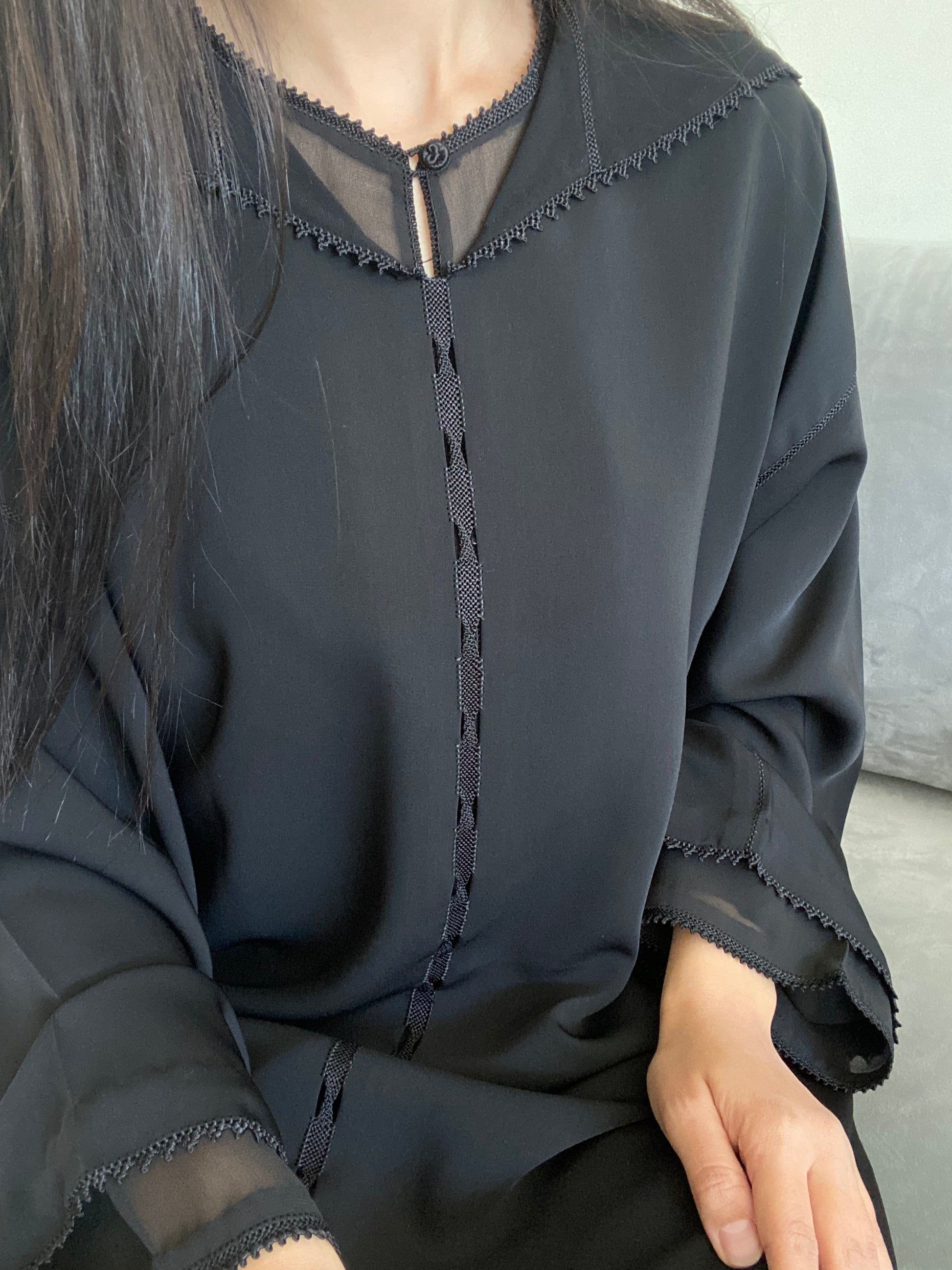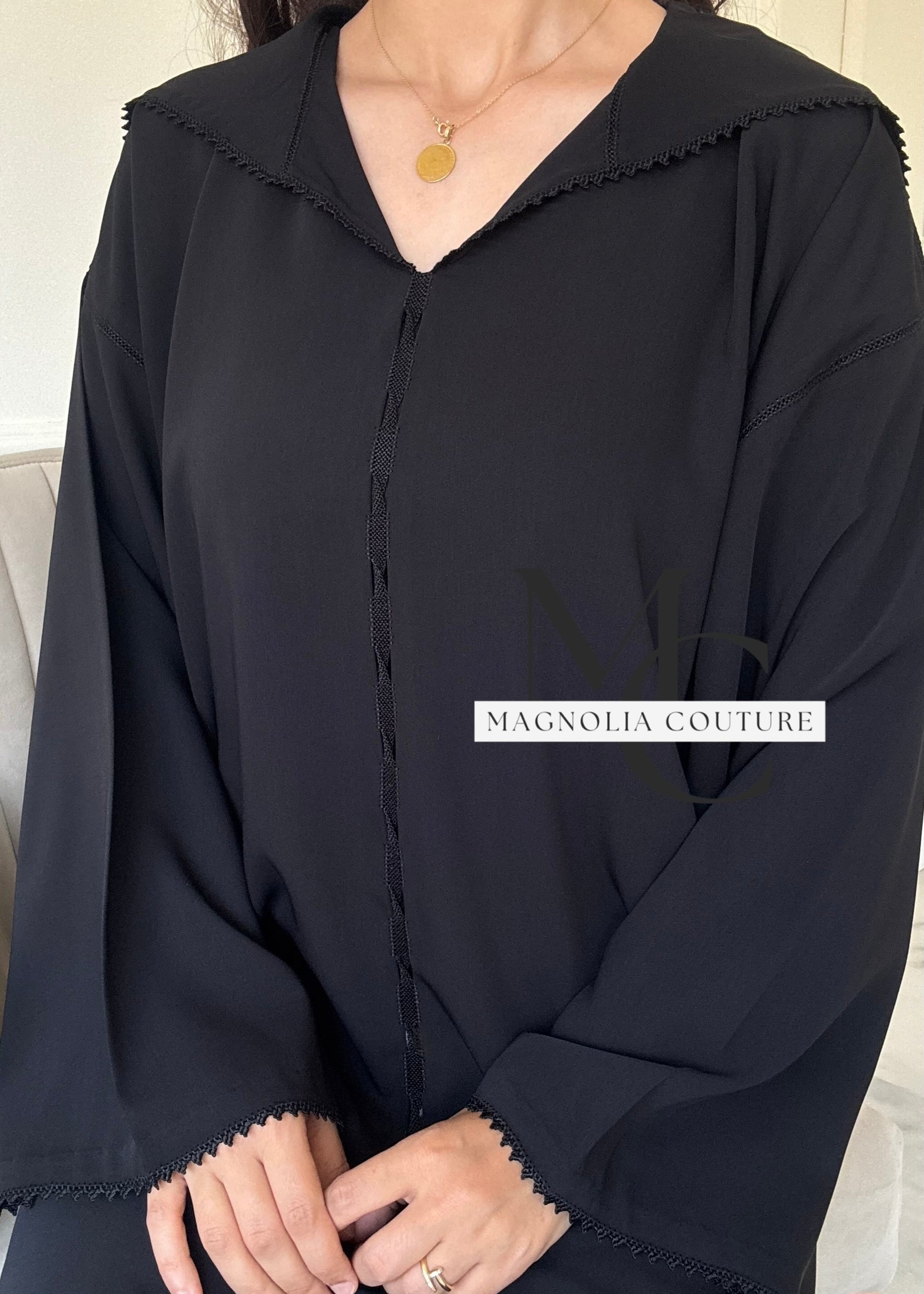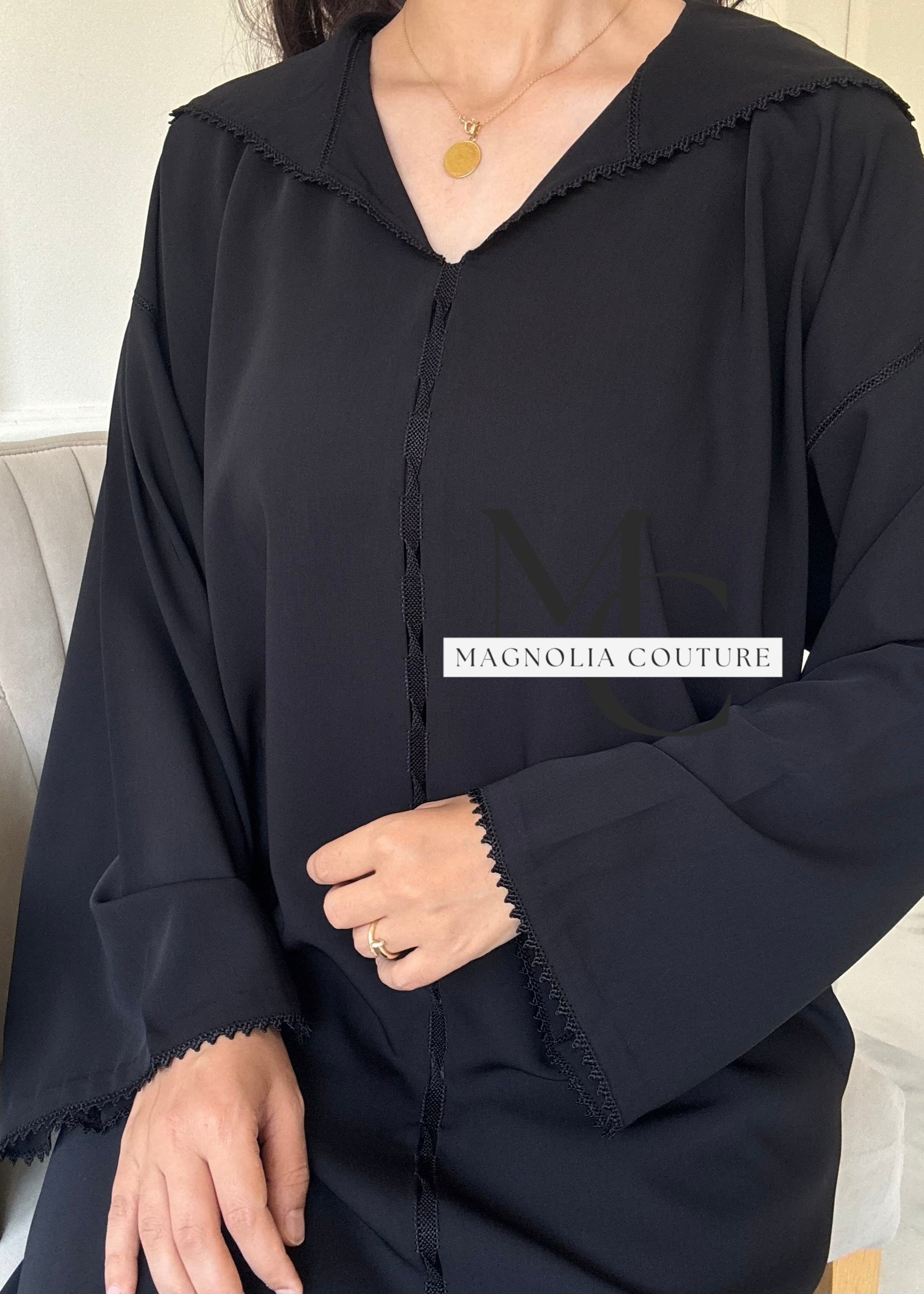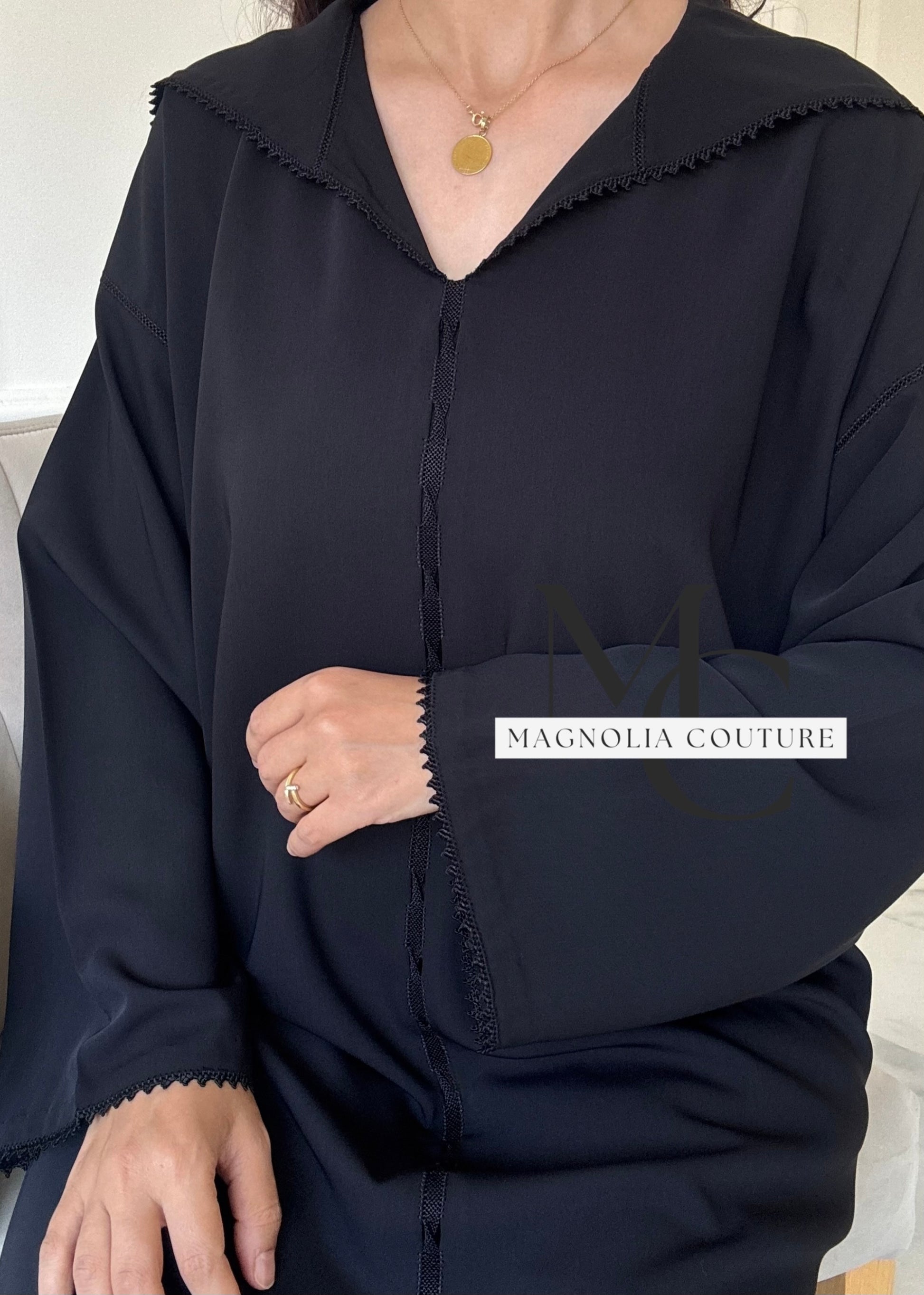 Description : Élégante djellaba noire, travaillée avec randa, alliant simplicité et sophistication.