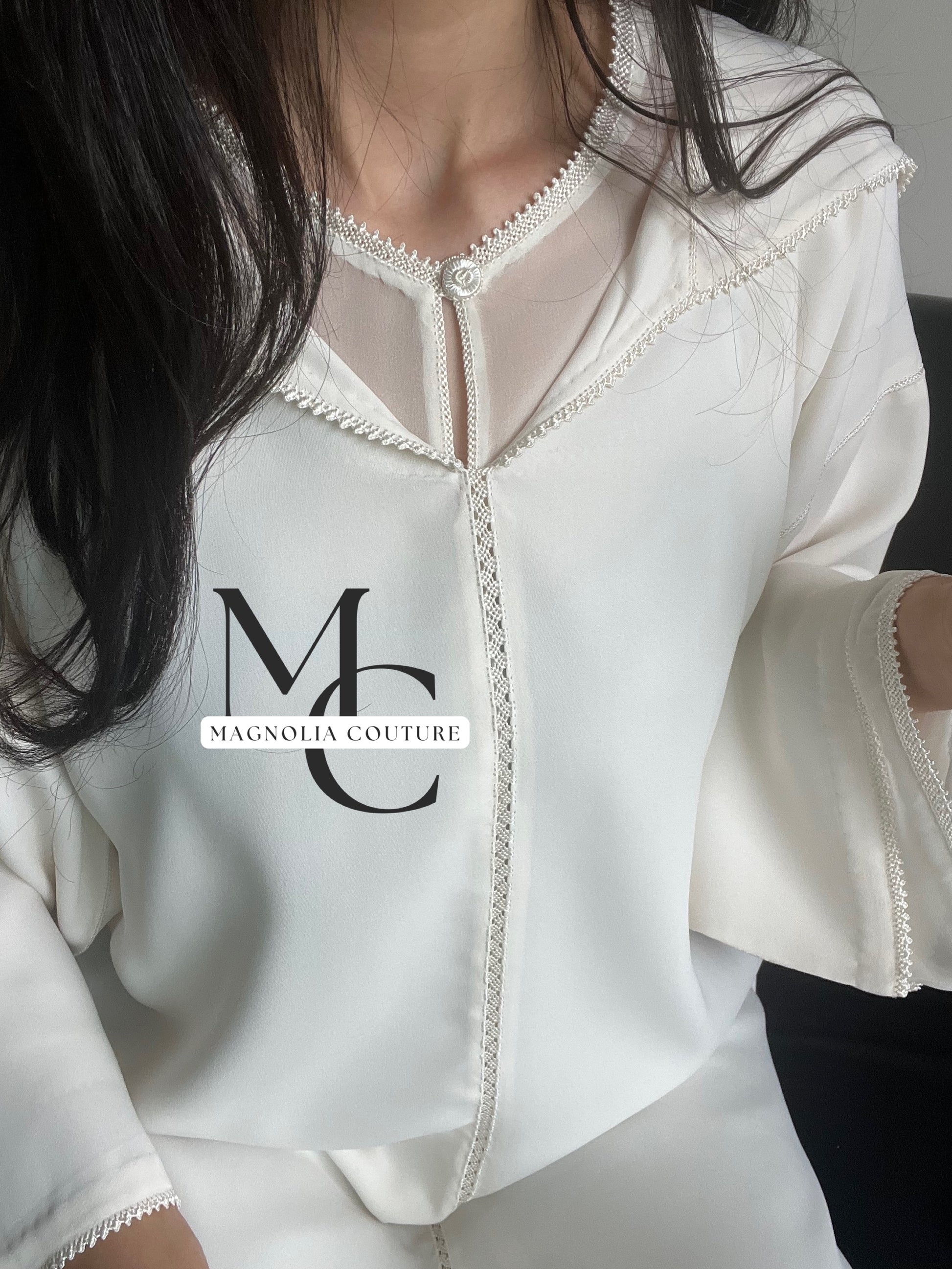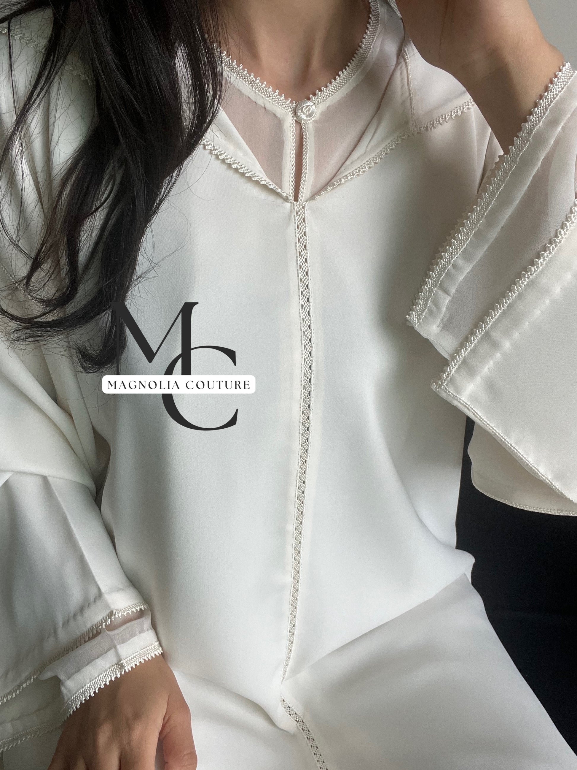 Description :Elégante djellaba blanche, travaillée avec randa , parfaitement adaptée pour les moments sacrés tels que l'omra, le hajj, ou les cérémonies de mariage, alliant simplicité et sophistication