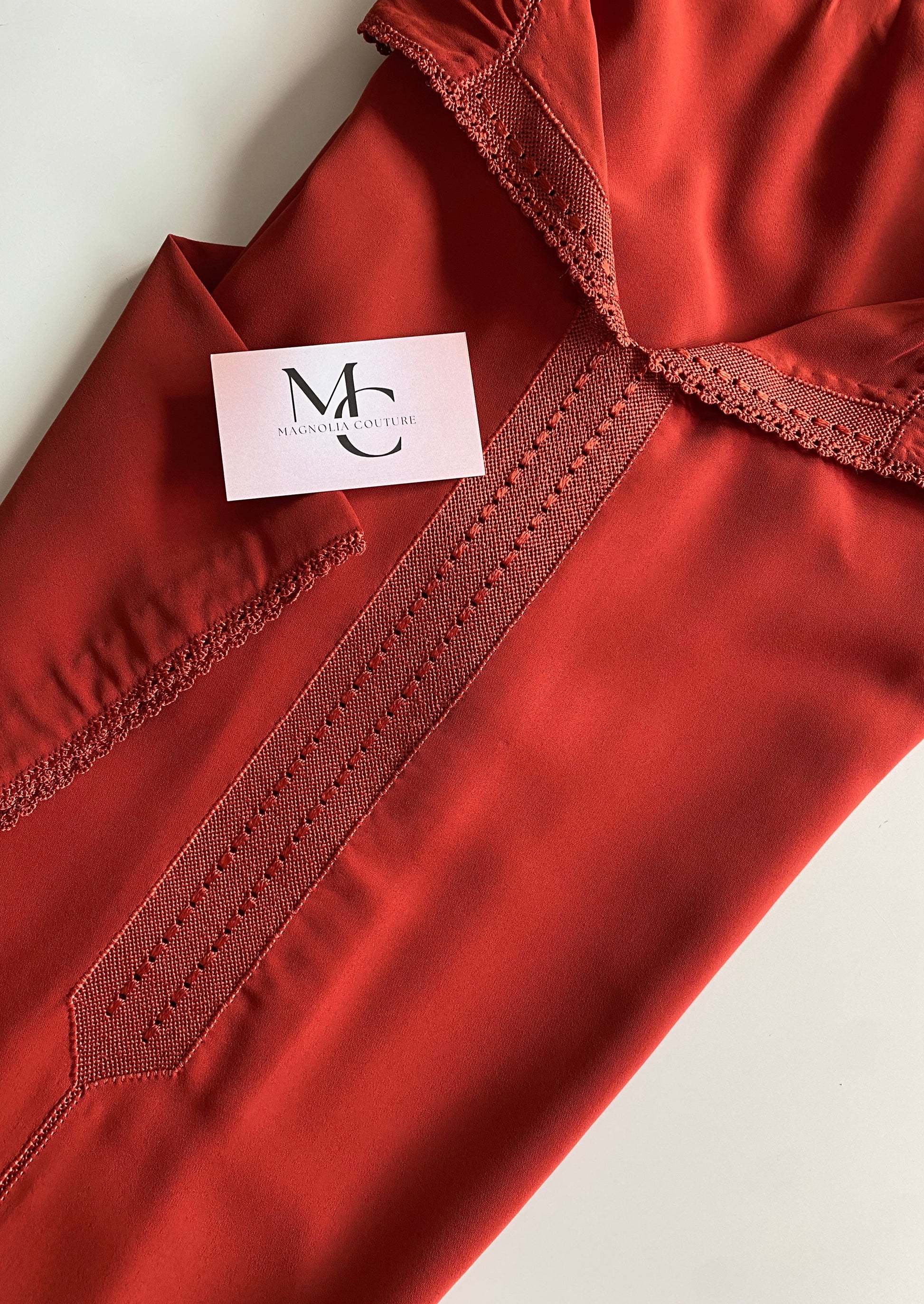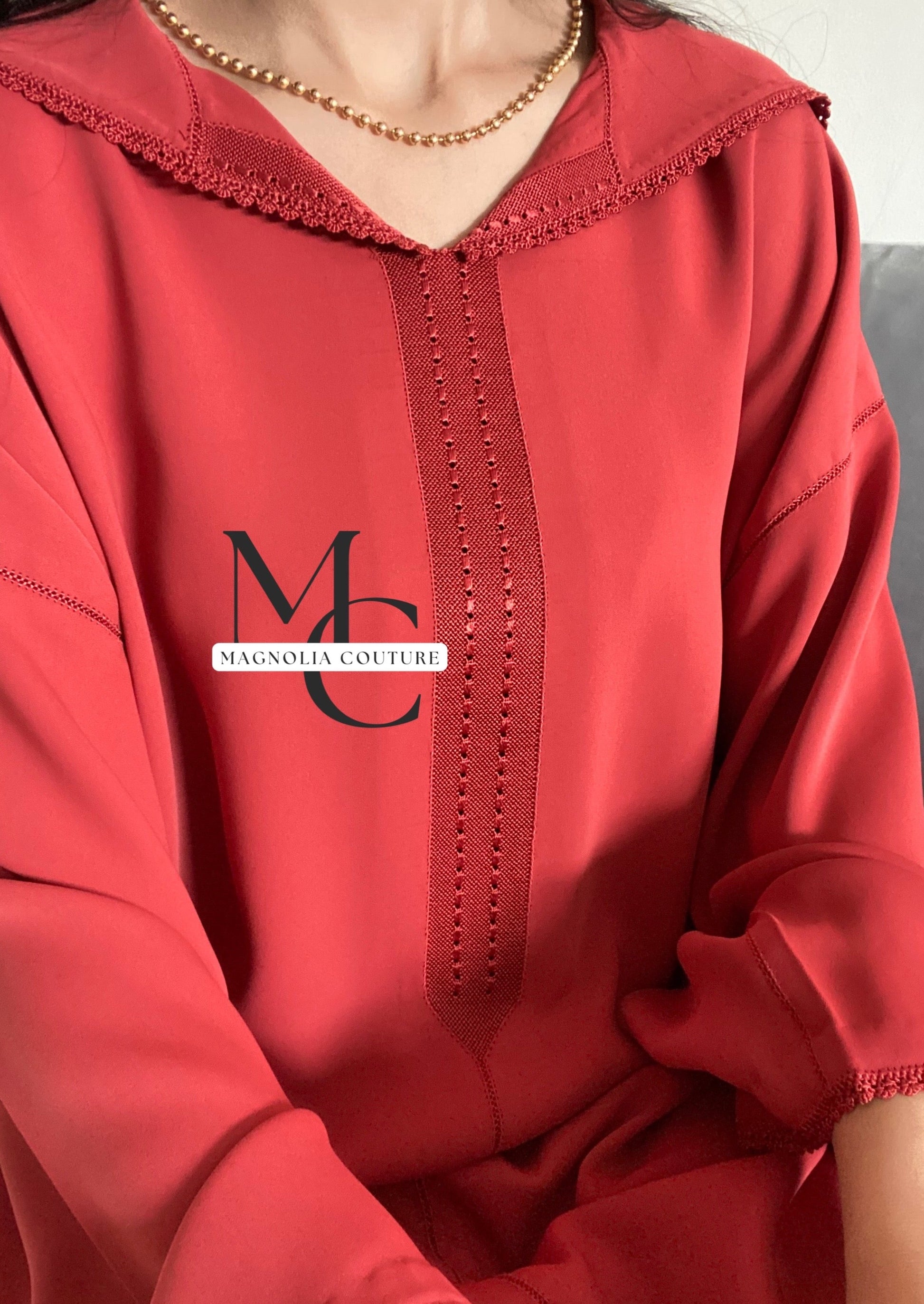 Description : La djellaba est confectionnée avec randa à la main et dotée de deux chaînettes, cette pièce incarne l'artisanat raffiné et le charme traditionnel marocain.
