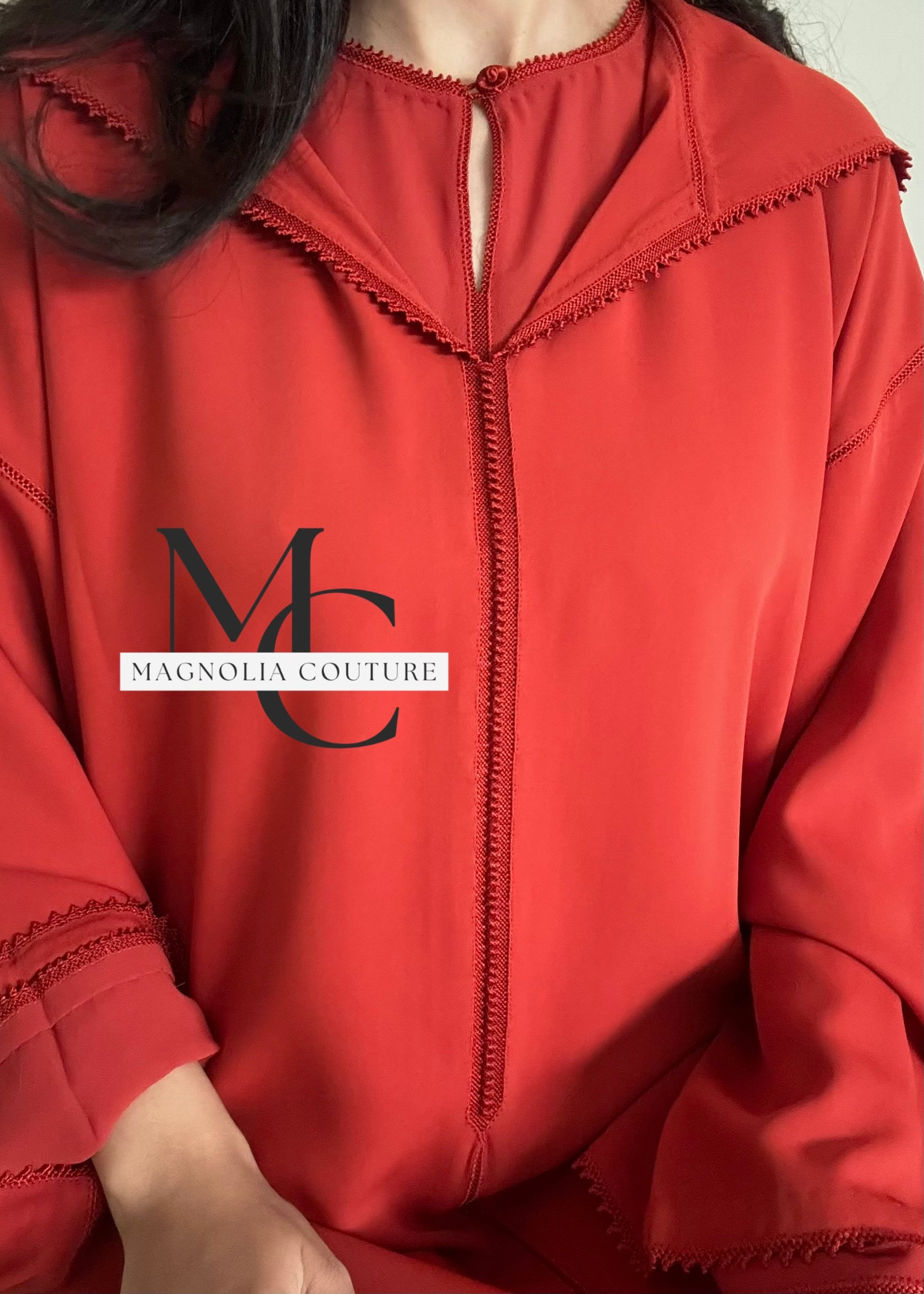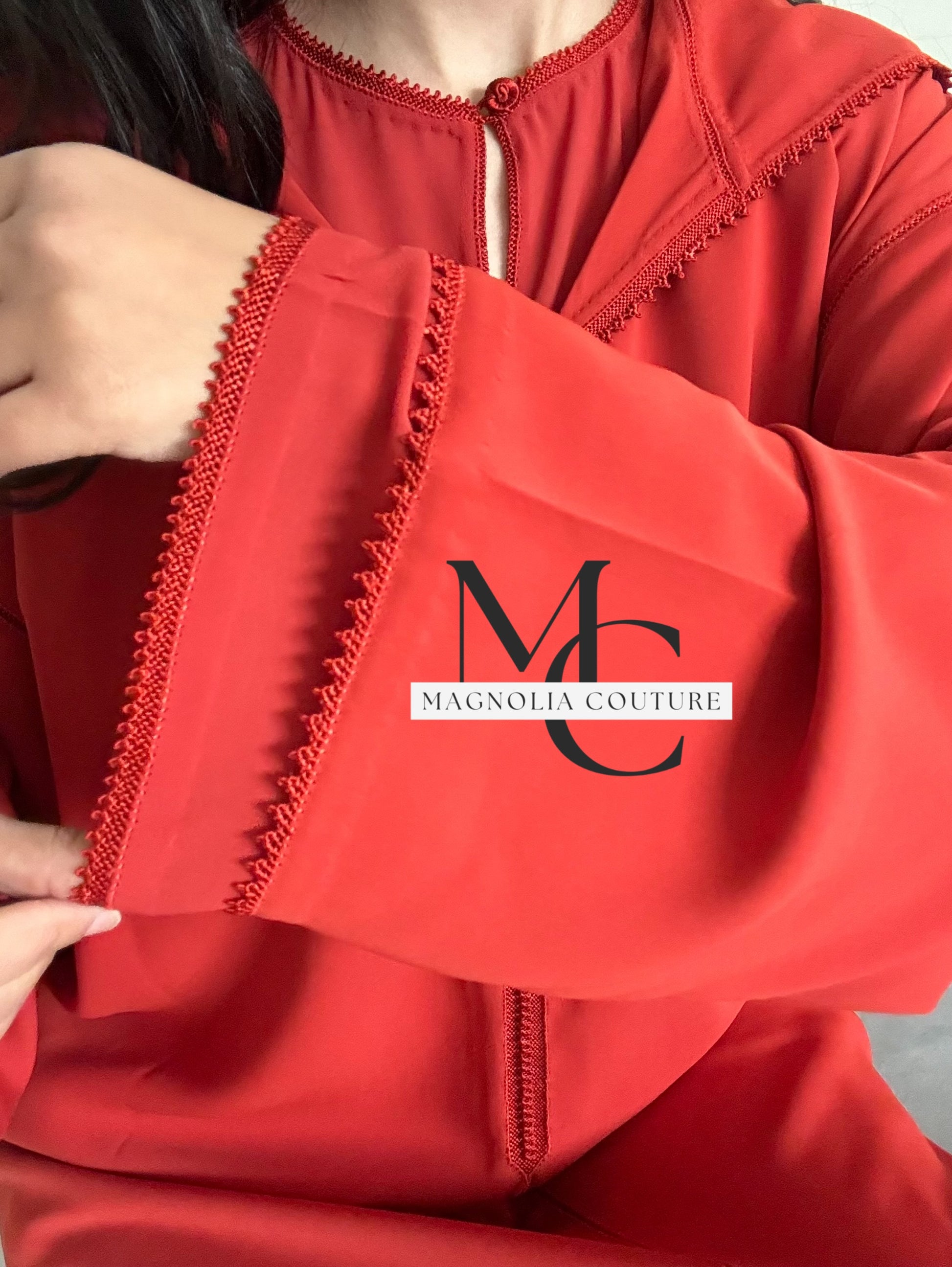 Description : Élégance et simplicité se rencontrent dans cette magnifique jellaba confectionnée en tissu crêpe de soie, doux et fluide. Ce modèle est sublimé par un travail minutieux de randa, réalisé à la main par nos artisans.
