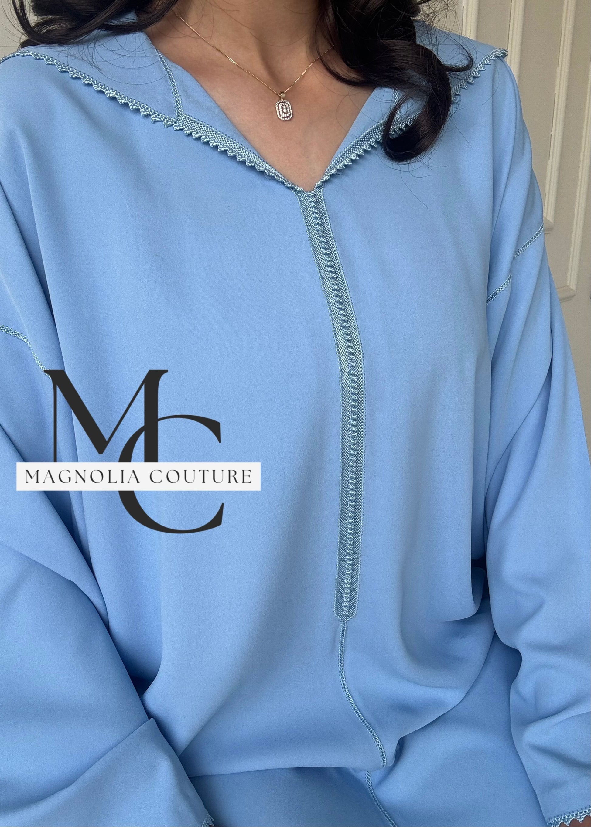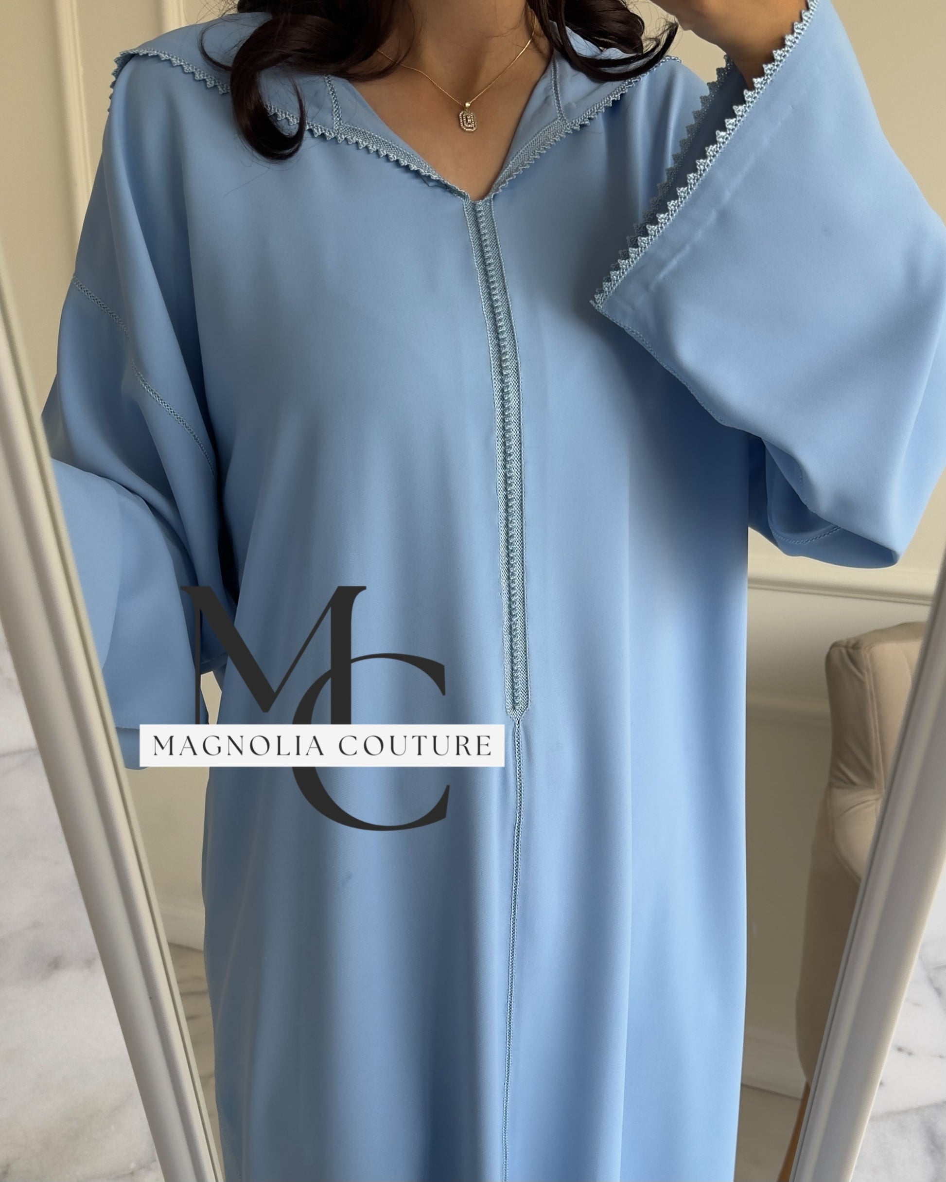 Description : Élégance et simplicité se rencontrent dans cette magnifique jellaba confectionnée en tissu crêpe de soie, doux et fluide. Ce modèle est sublimé par un travail minutieux de randa, réalisé à la main par nos artisans.