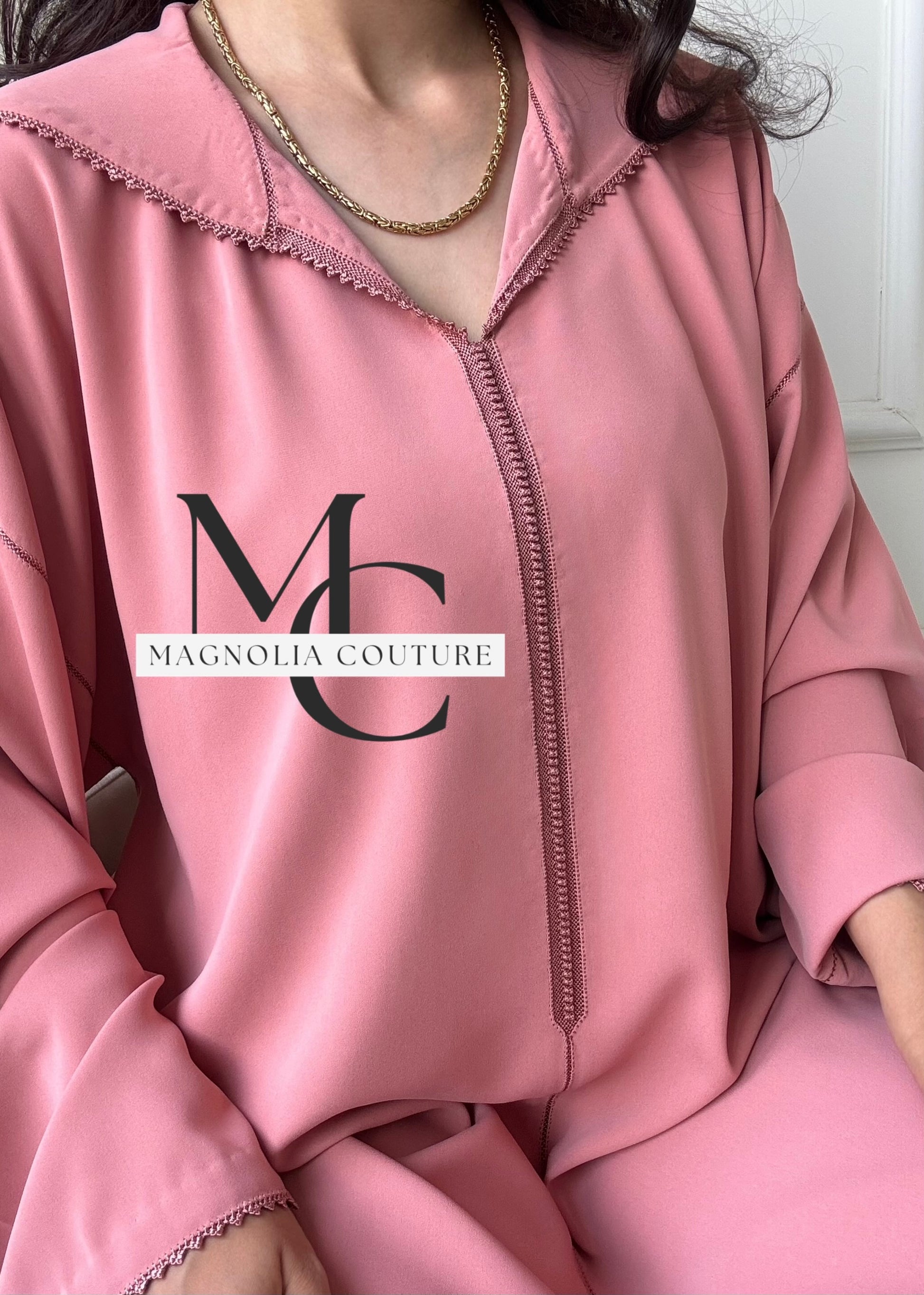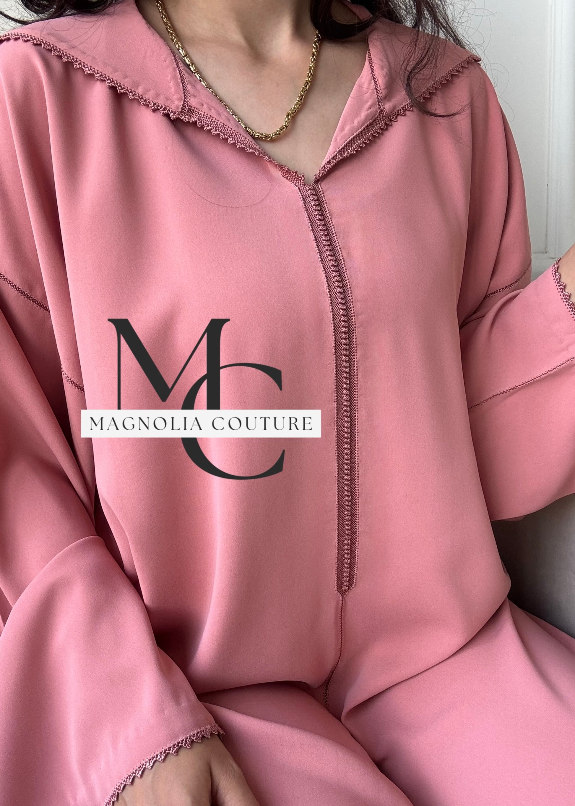 Description : Élégance et simplicité se rencontrent dans cette magnifique jellaba confectionnée en tissu crêpe de soie, doux et fluide. Ce modèle est sublimé par un travail minutieux de randa, réalisé à la main par nos artisans.