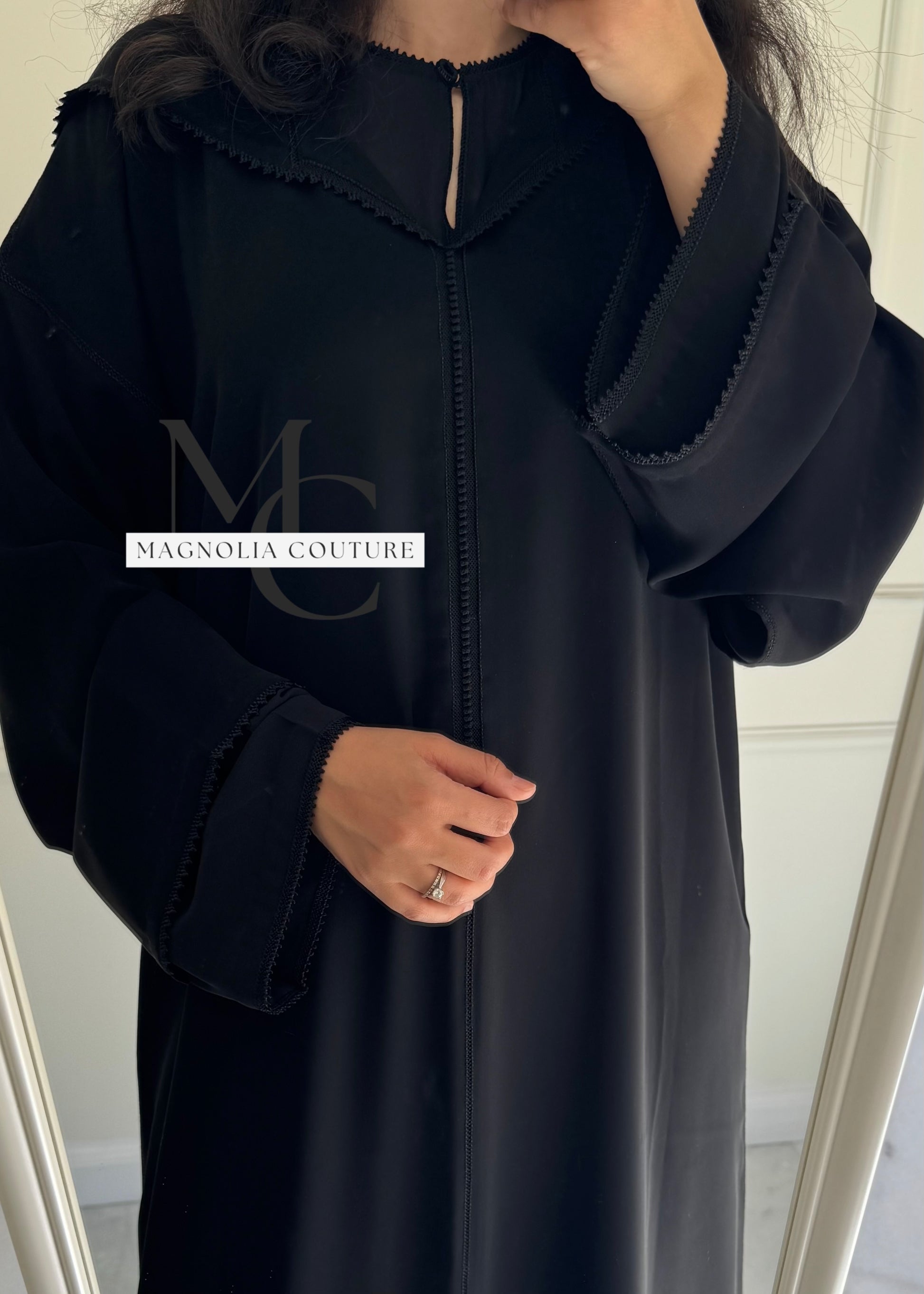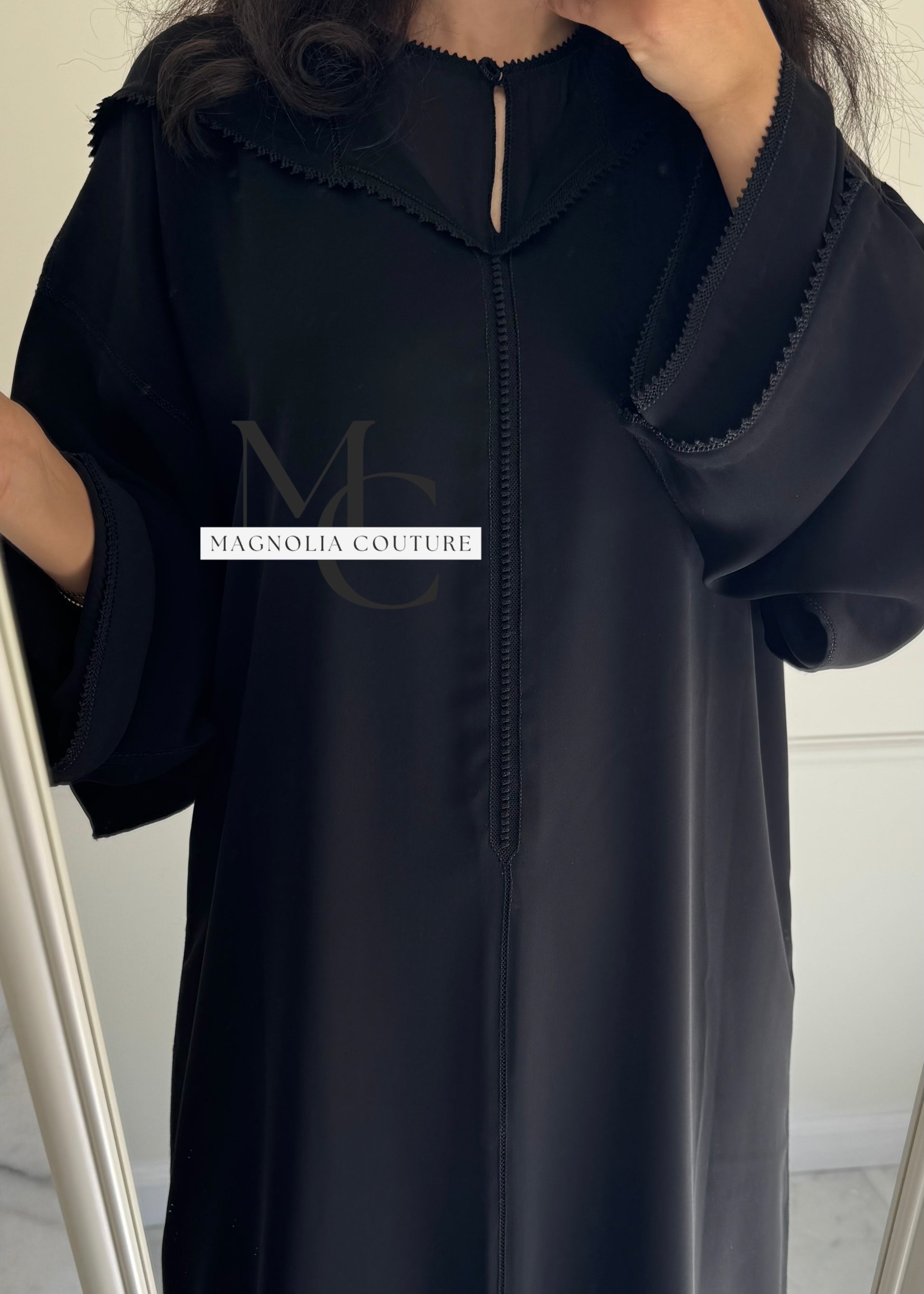 Description : Élégance et simplicité se rencontrent dans cette magnifique jellaba confectionnée en tissu crêpe de soie, doux et fluide. Ce modèle est sublimé par un travail minutieux de randa, réalisé à la main par nos artisans.