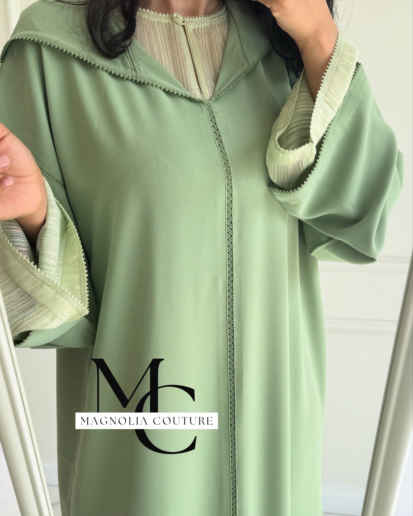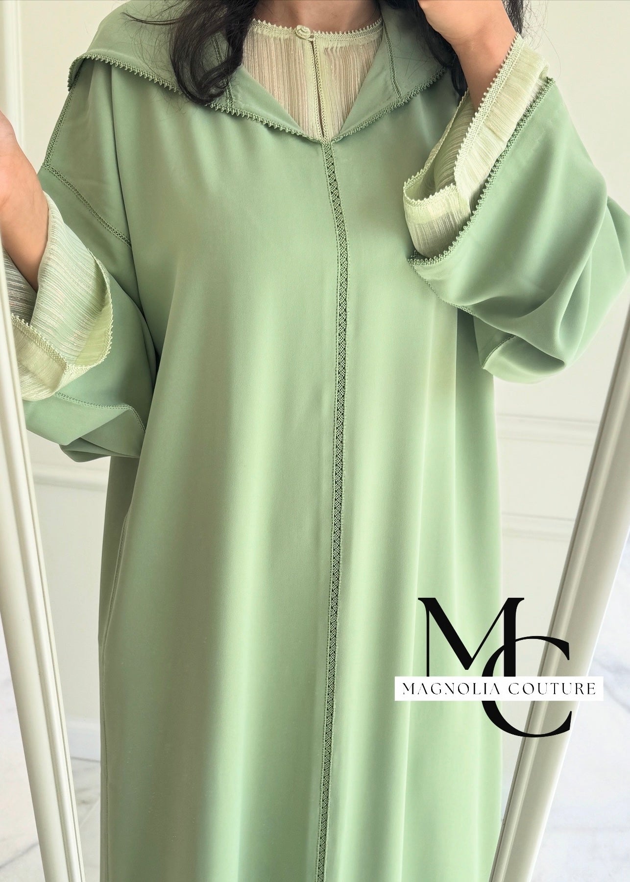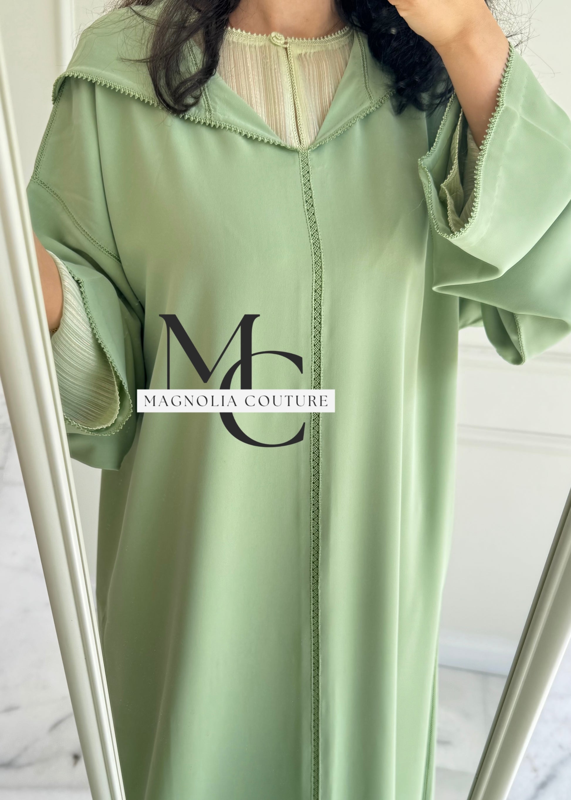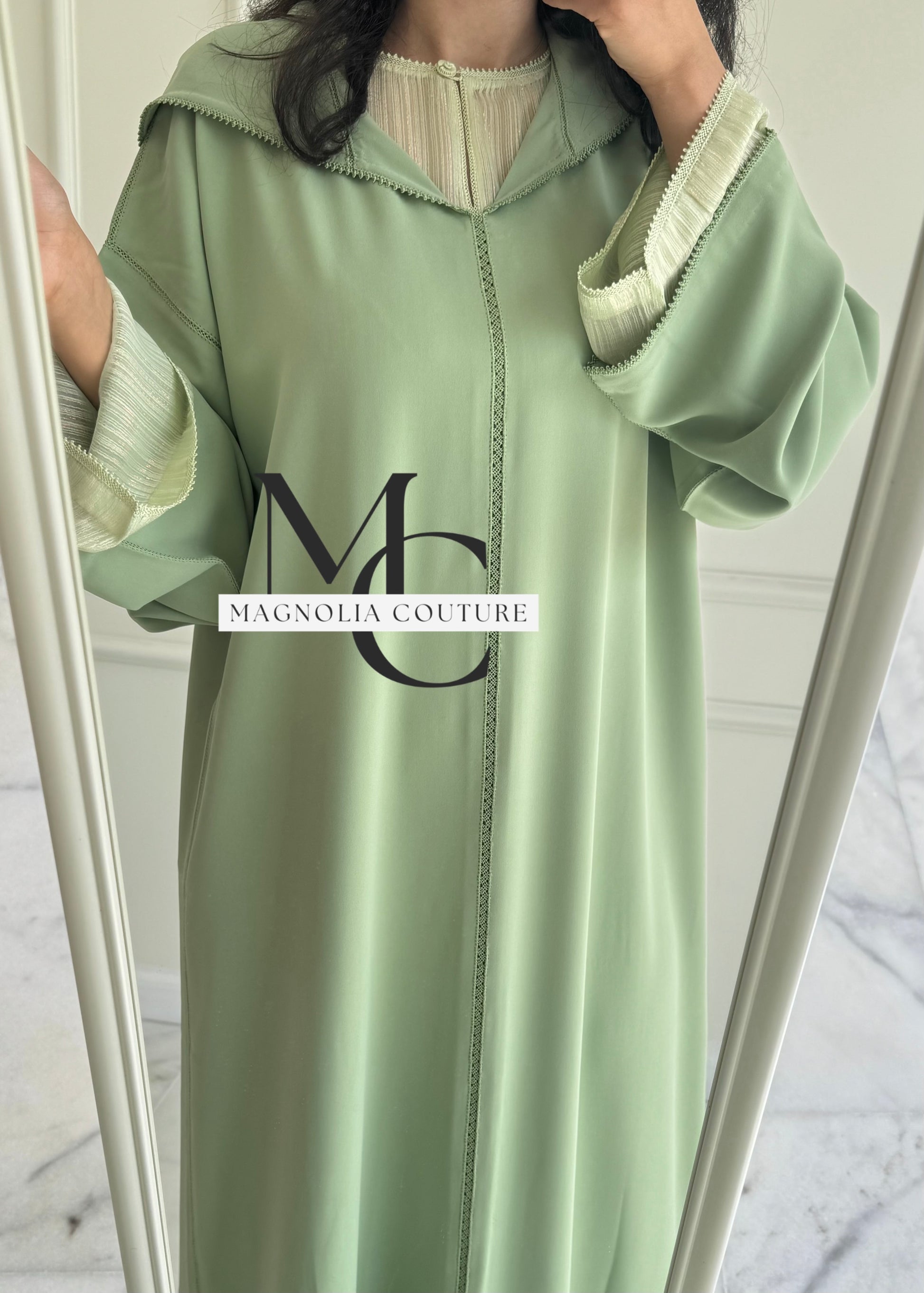 Description : La jellaba se compose de deux pièces, ornée d'une randa simple. Le qmiss en mousseline en dessous apporte légèreté et confort, fusionnant tradition et élégance dans cette tenue raffinée.