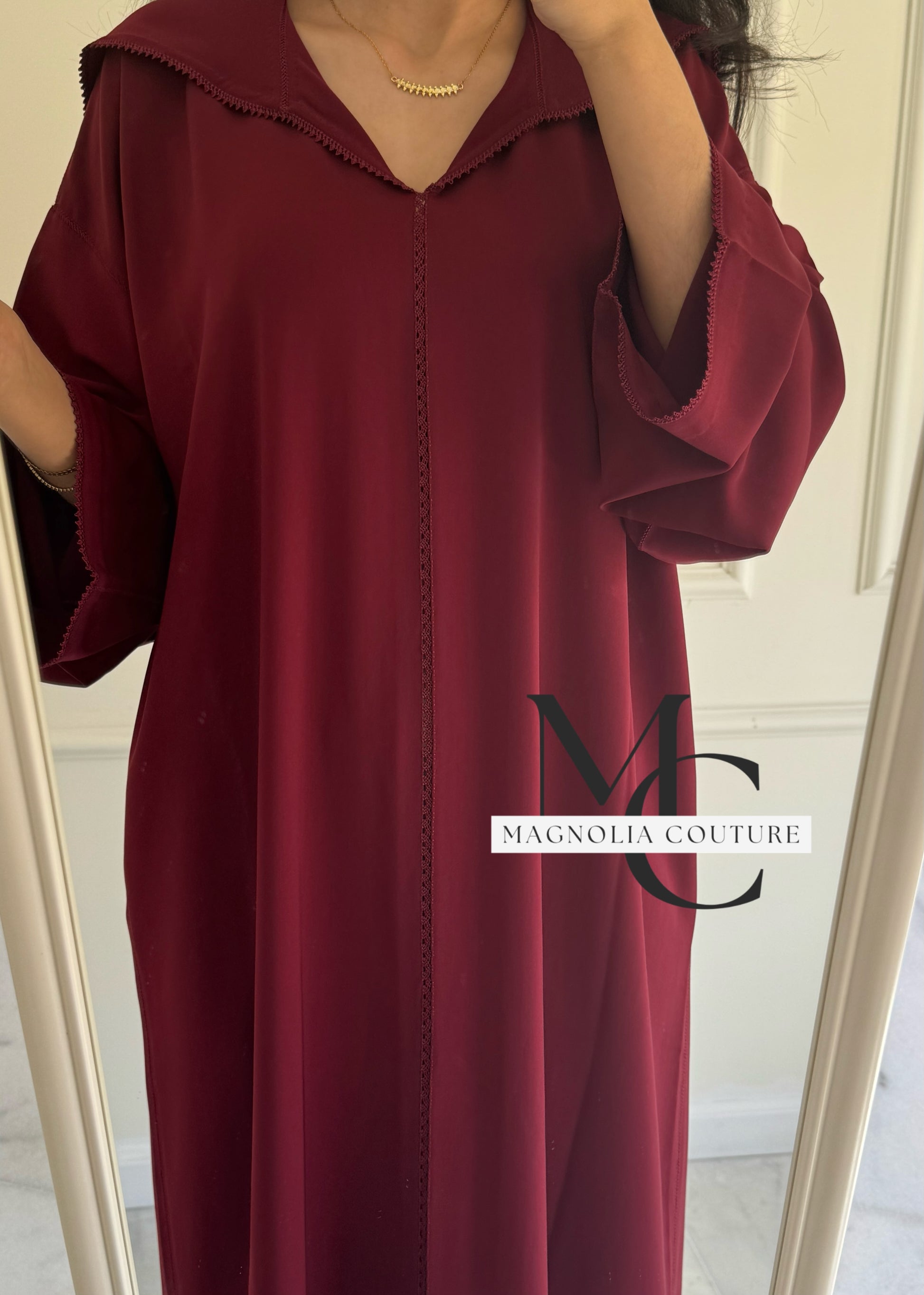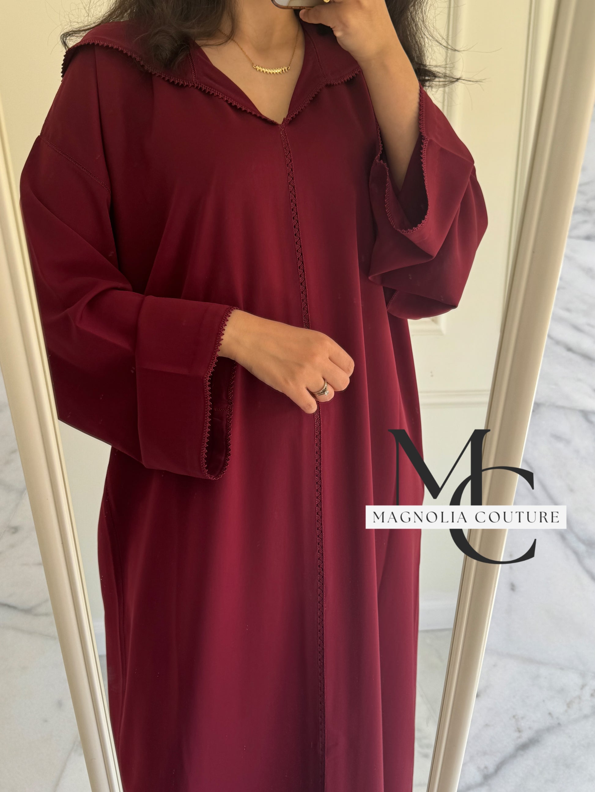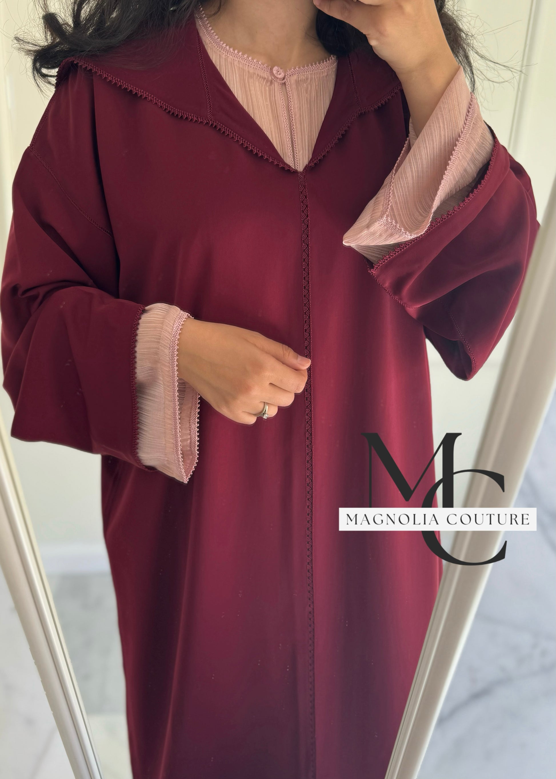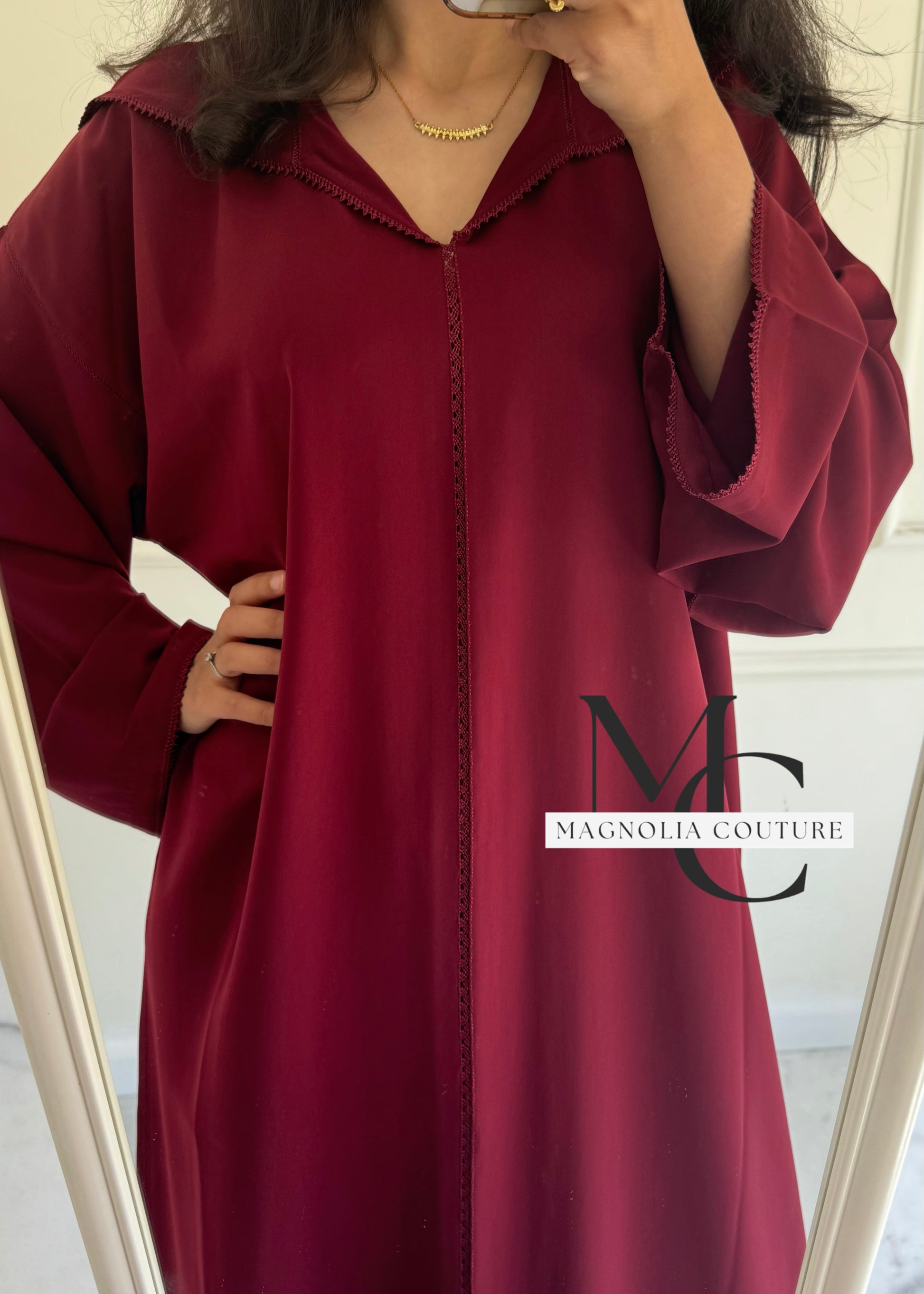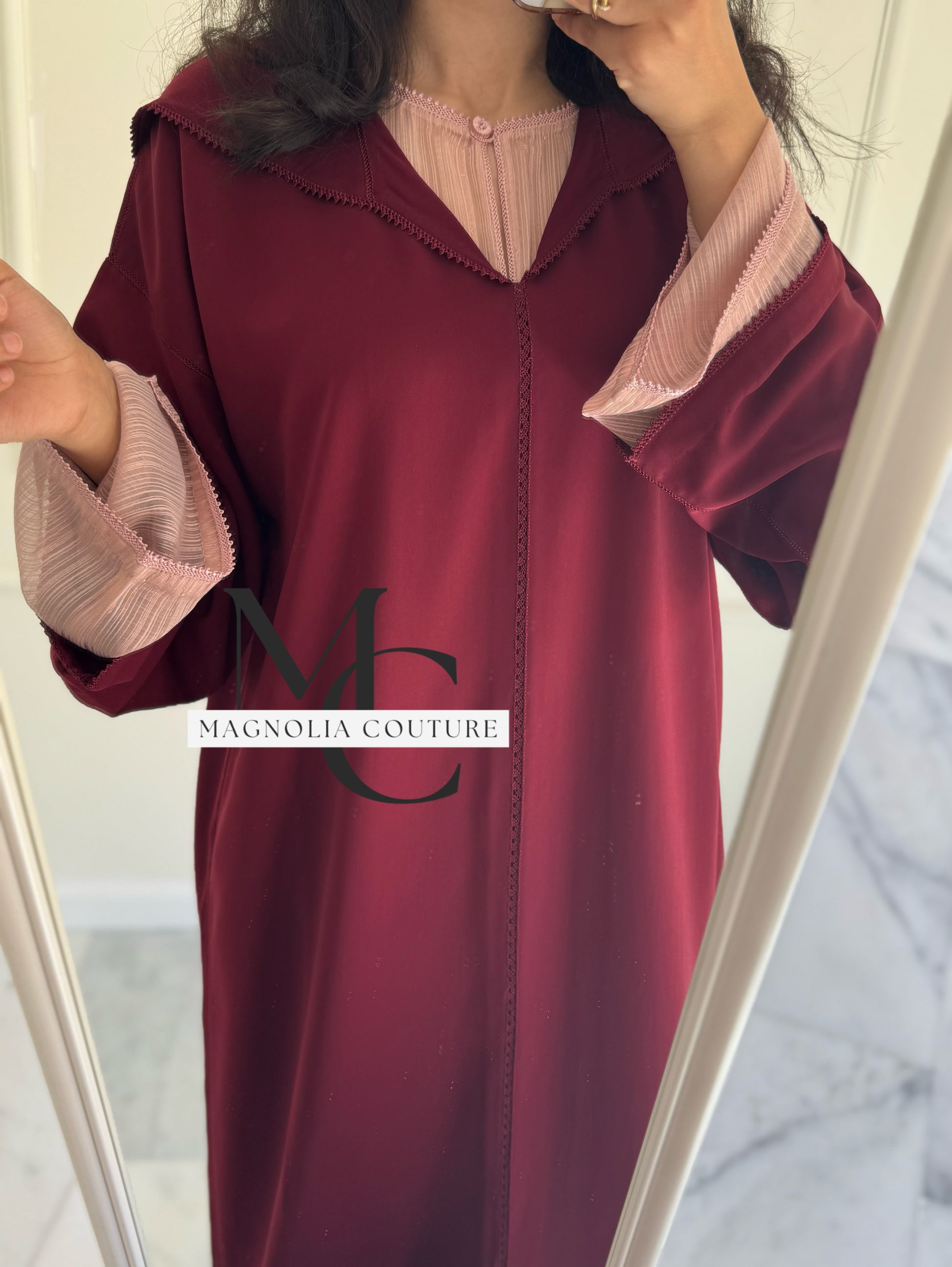 Description : La jellaba se compose de deux pièces, ornée d'une randa simple. Le qmiss en mousseline en dessous apporte légèreté et confort, fusionnant tradition et élégance dans cette tenue raffinée.
