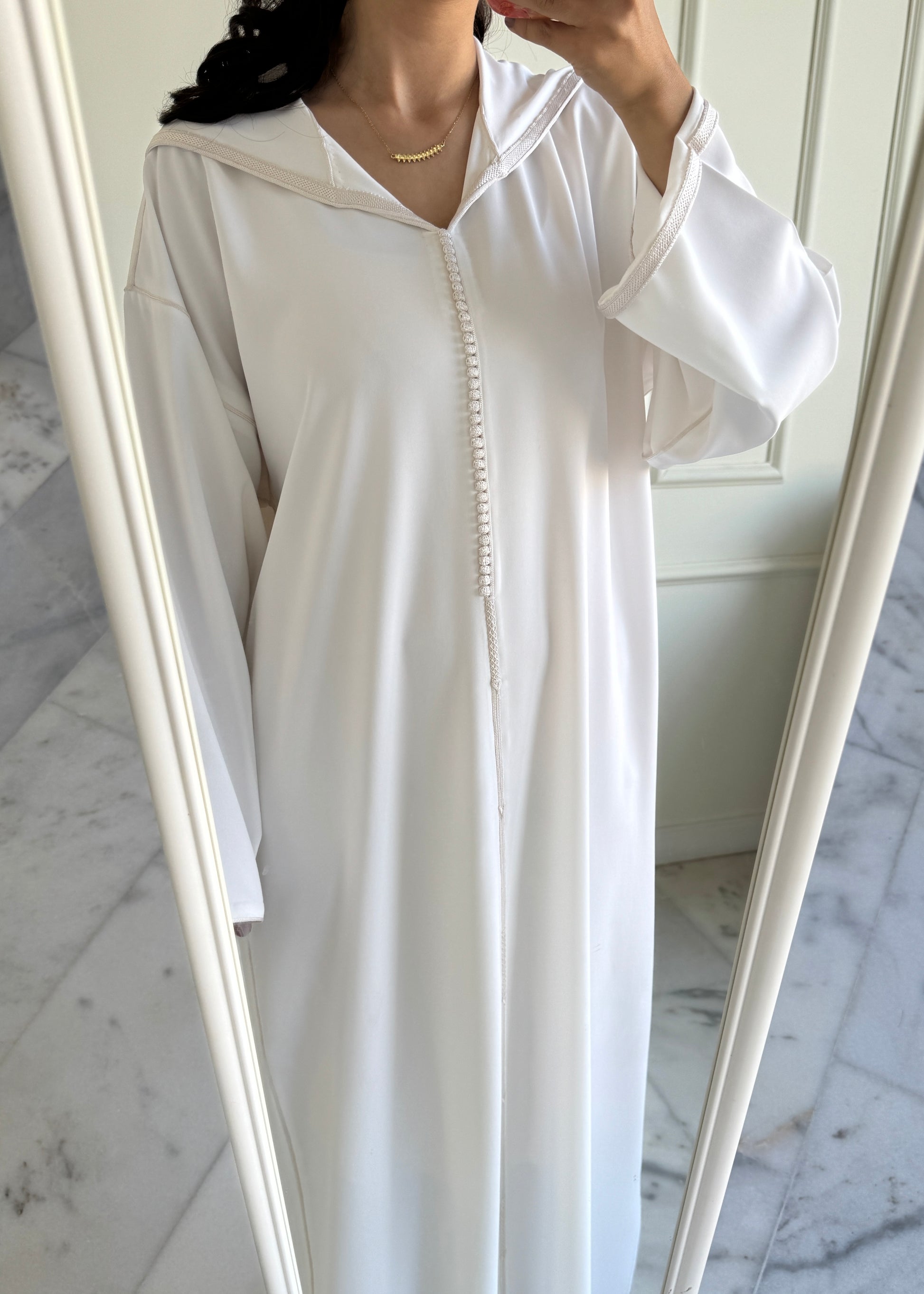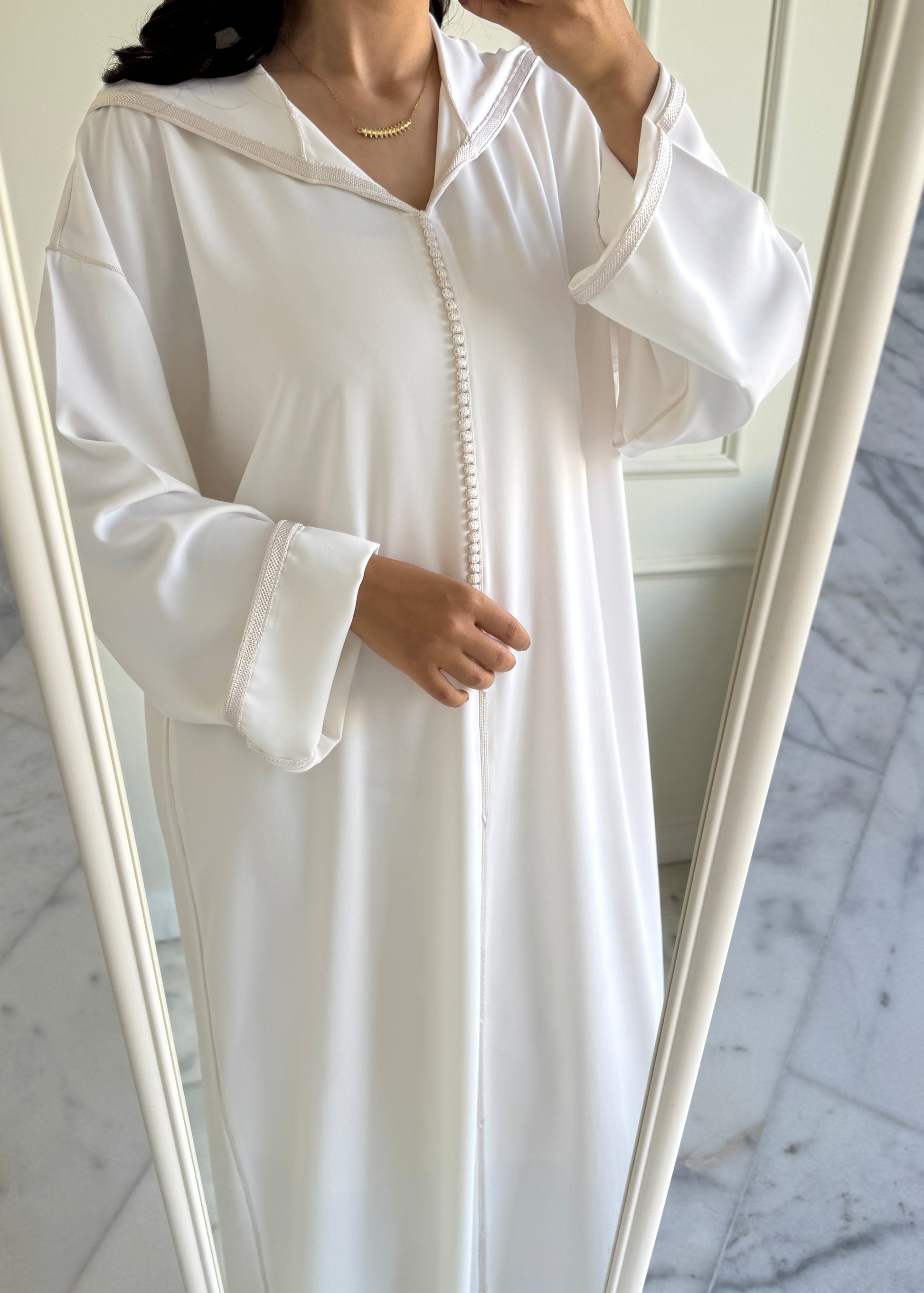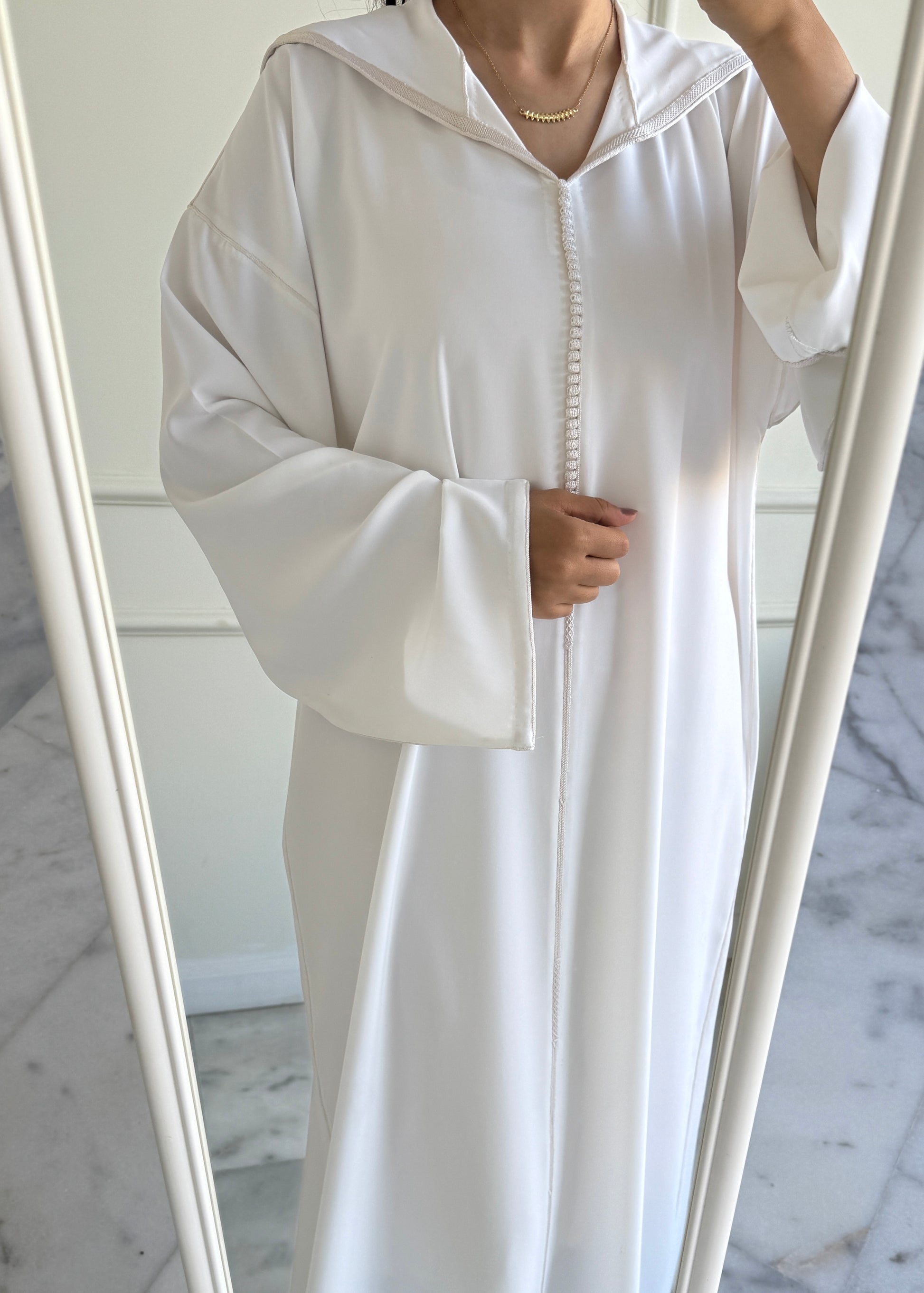 Description : Djellaba confectionnée à la main avec berchmane, idéale pour Omra.