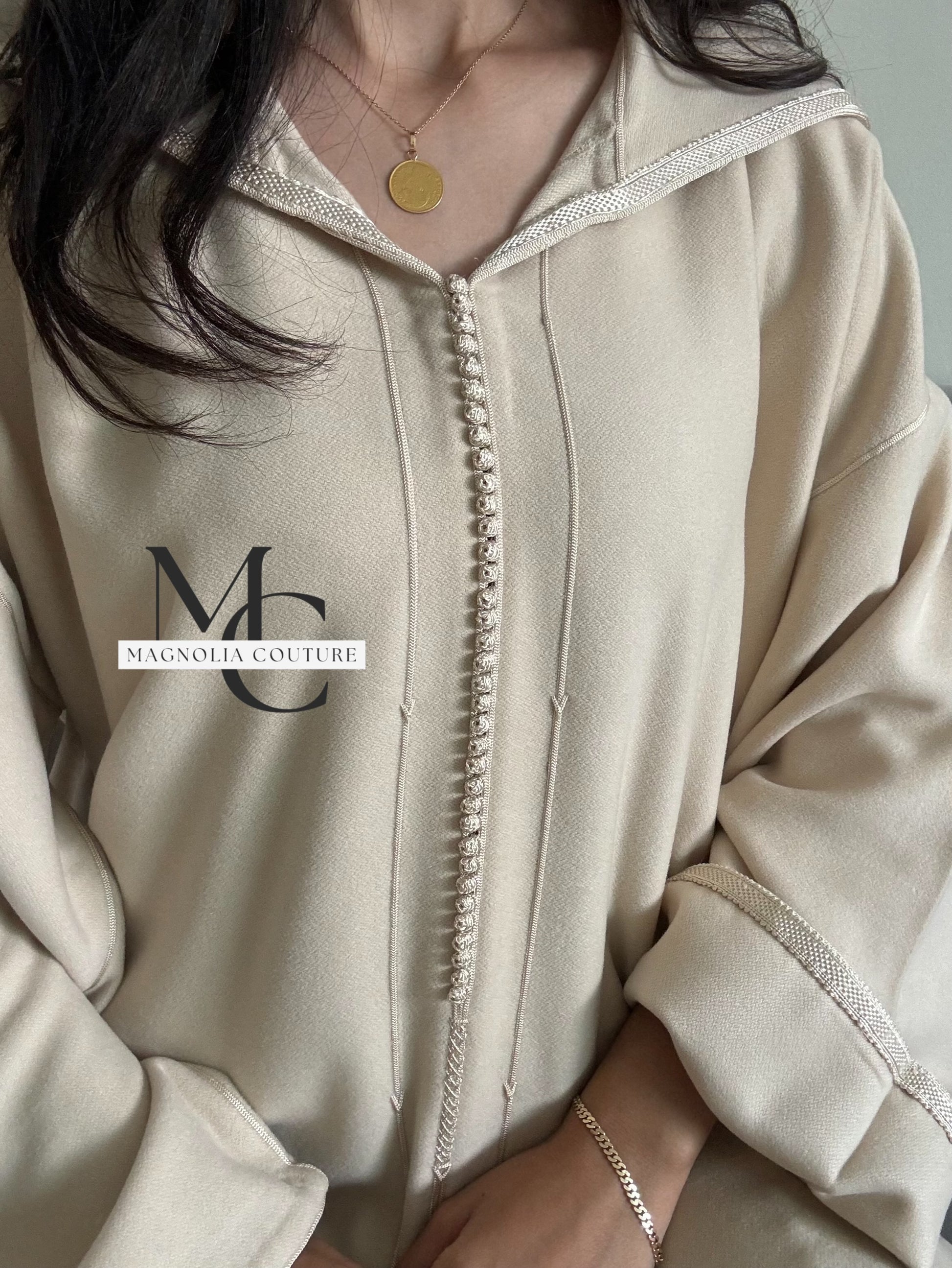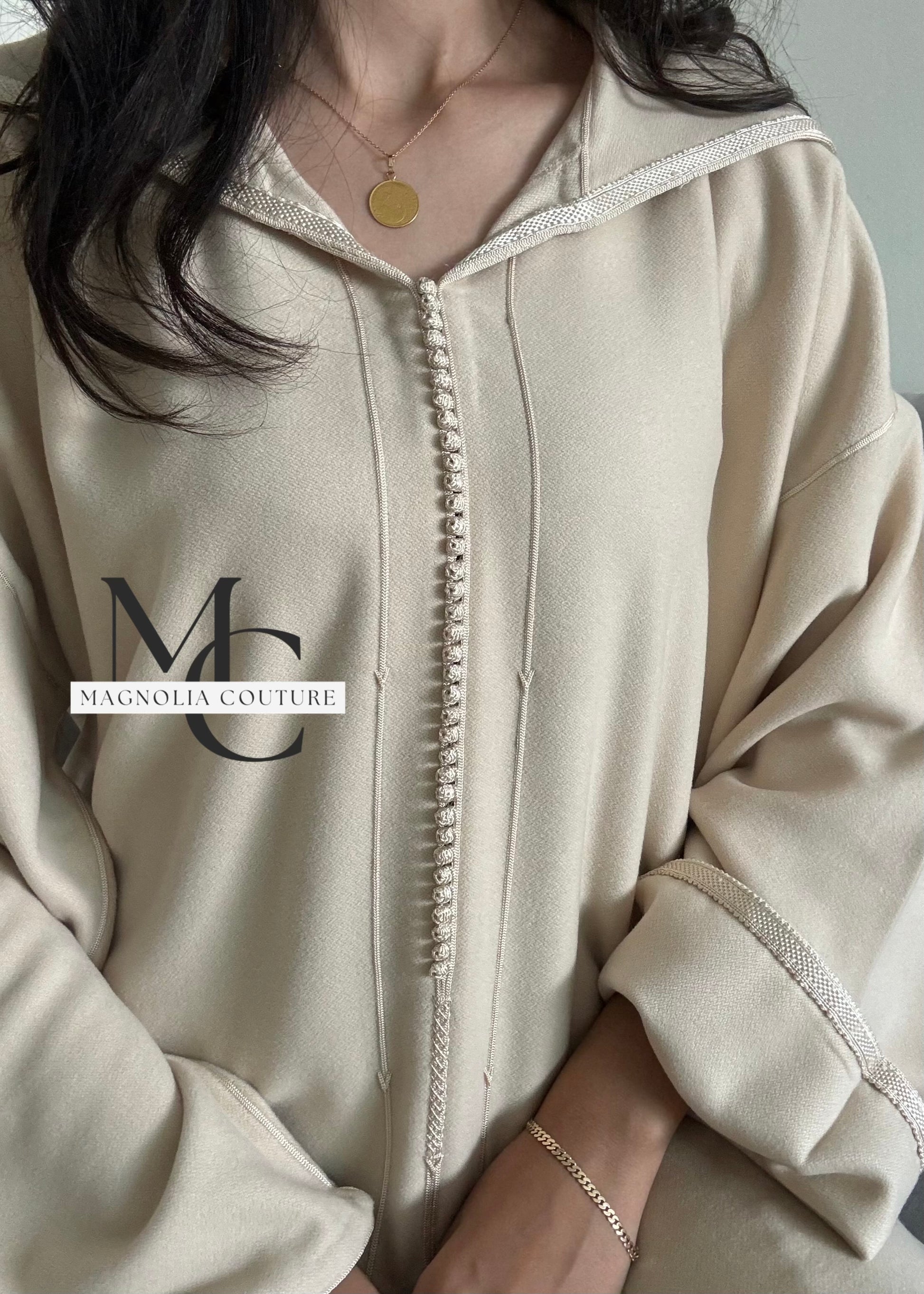 Description : Djellaba en tissu mlifa cachemire, minutieusement confectionnée à la main avec berchmane. Un must-have pour l’hiver.