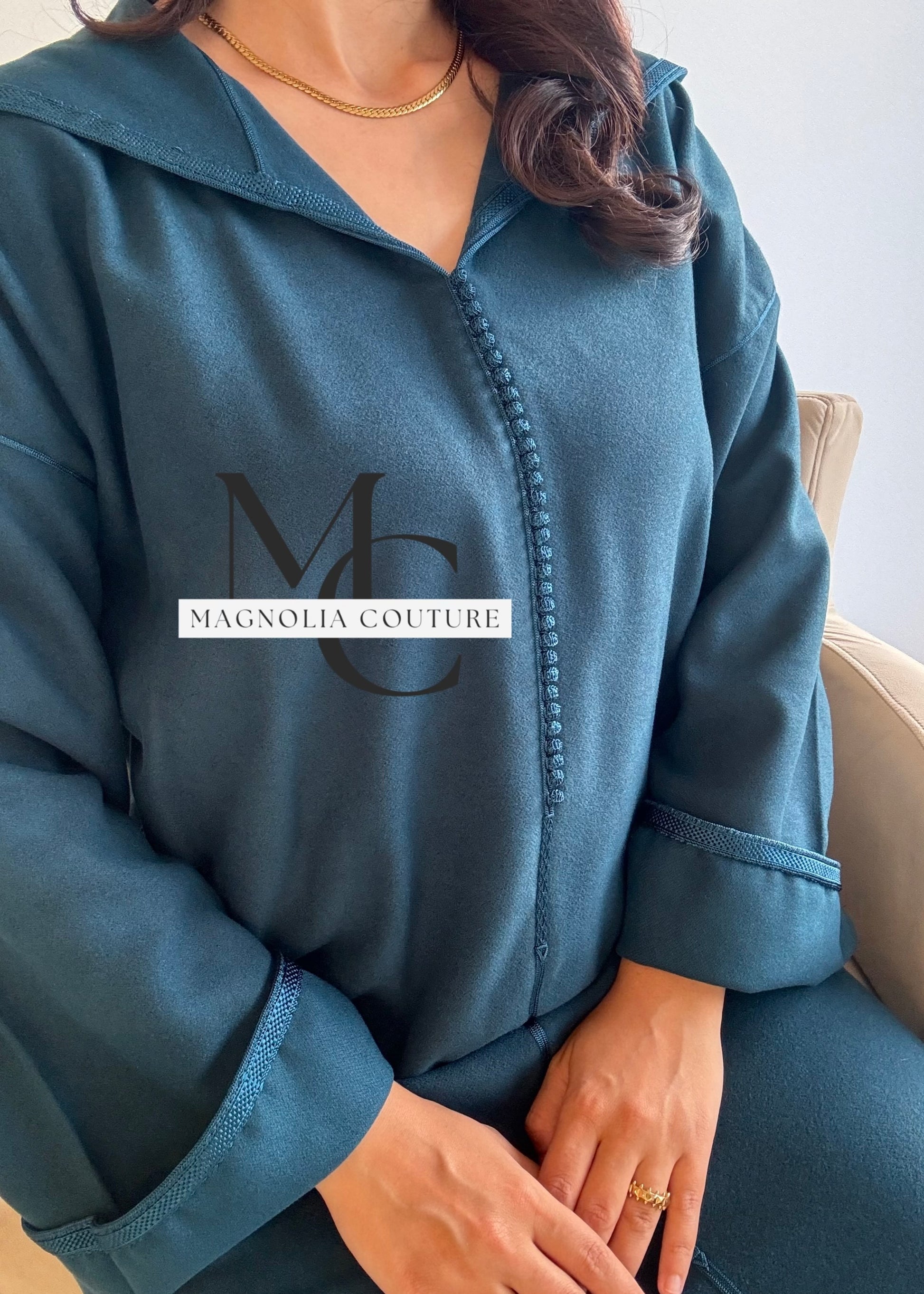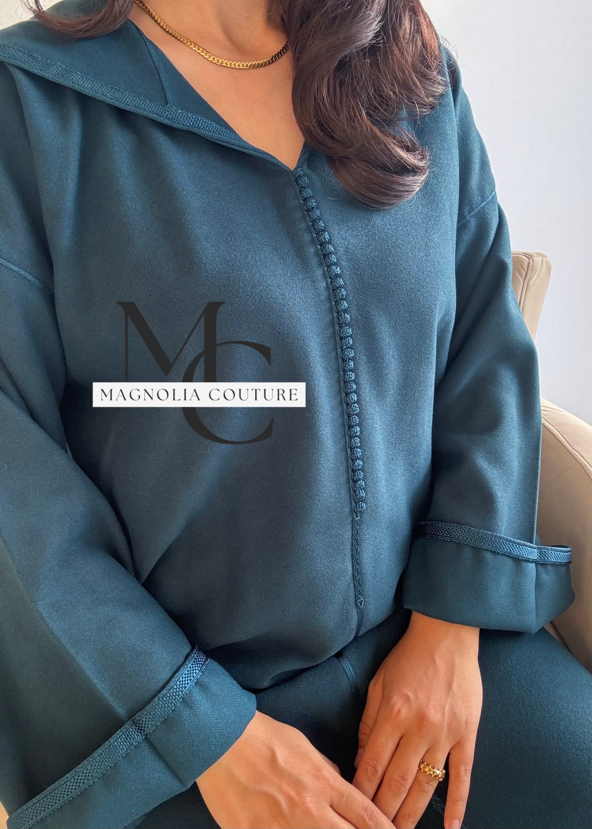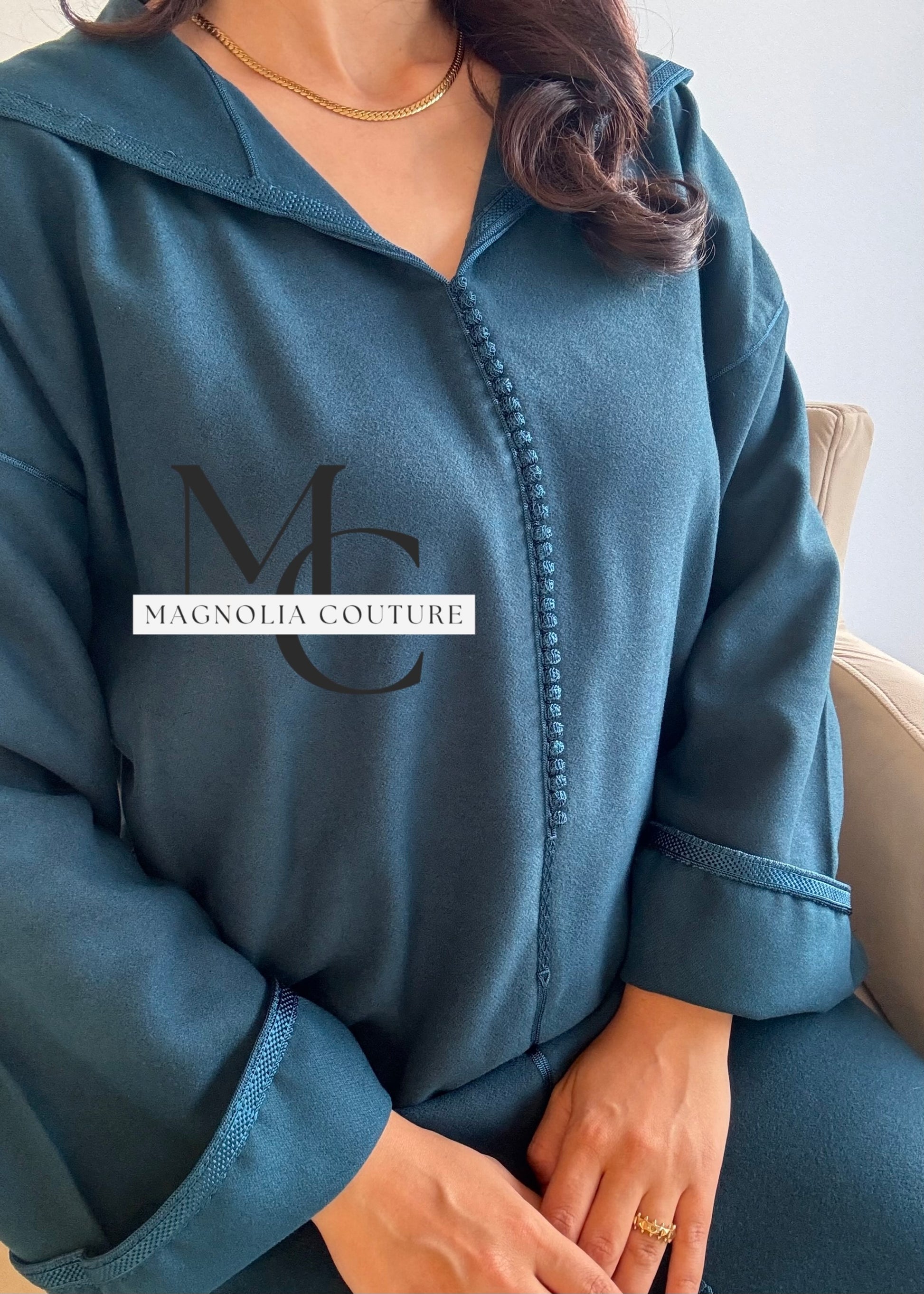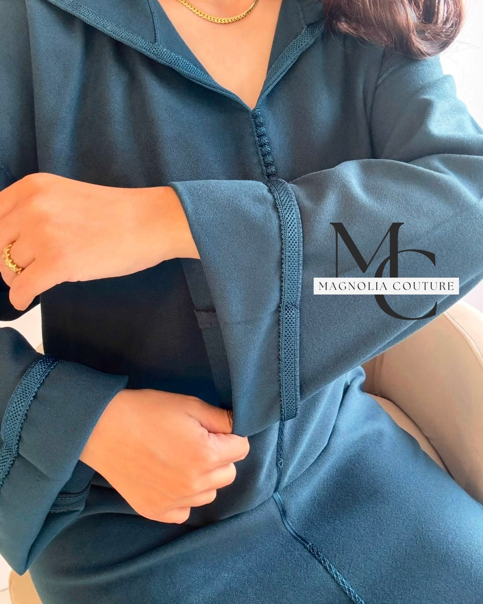 Description : Jellaba en tissu mlifa cachemire, minutieusement confectionnée à la main avec berchmane (Qtib).