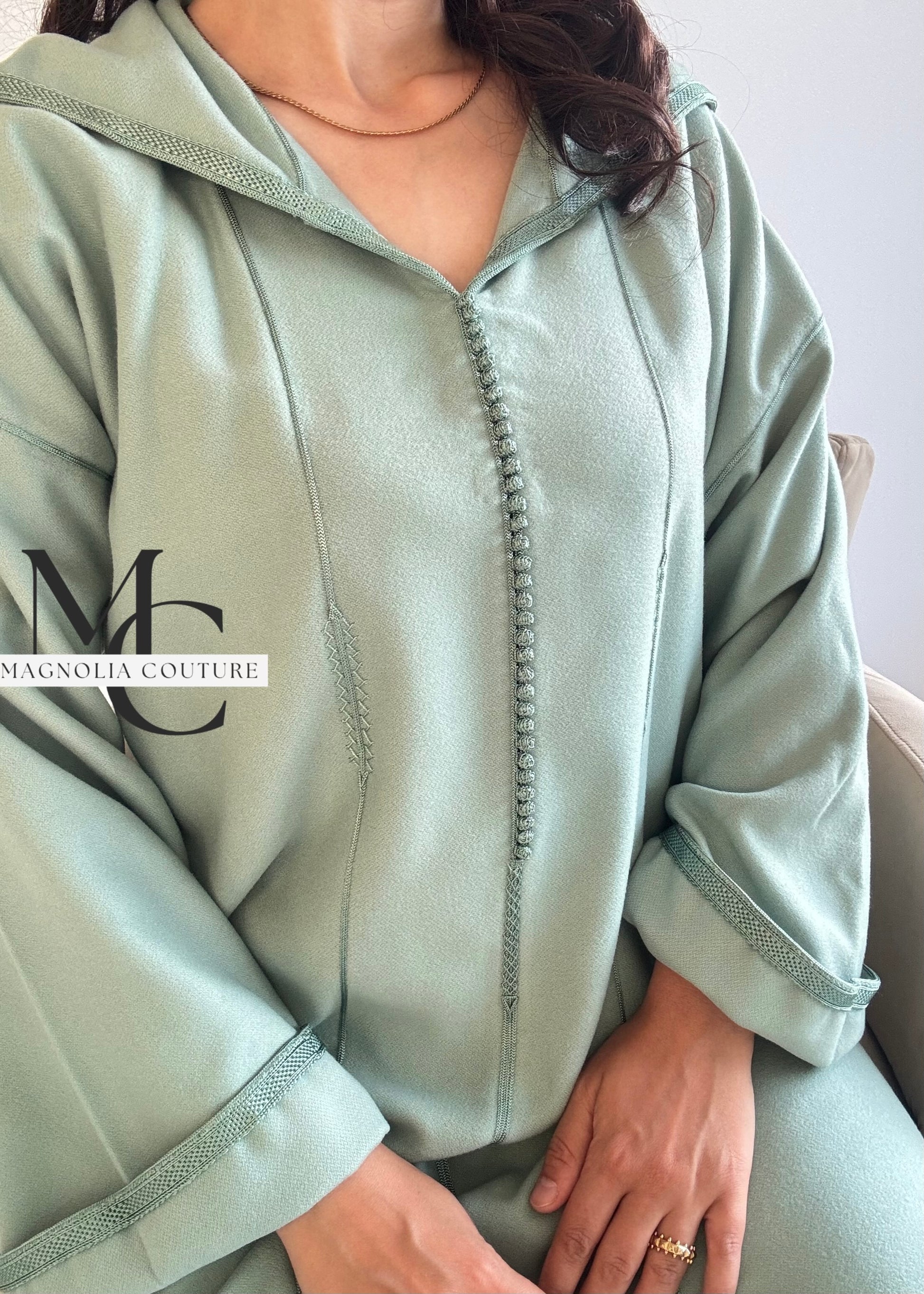 Description : Jellaba en tissu mlifa cachemire, minutieusement confectionnée à la main avec berchmane (Qtib).