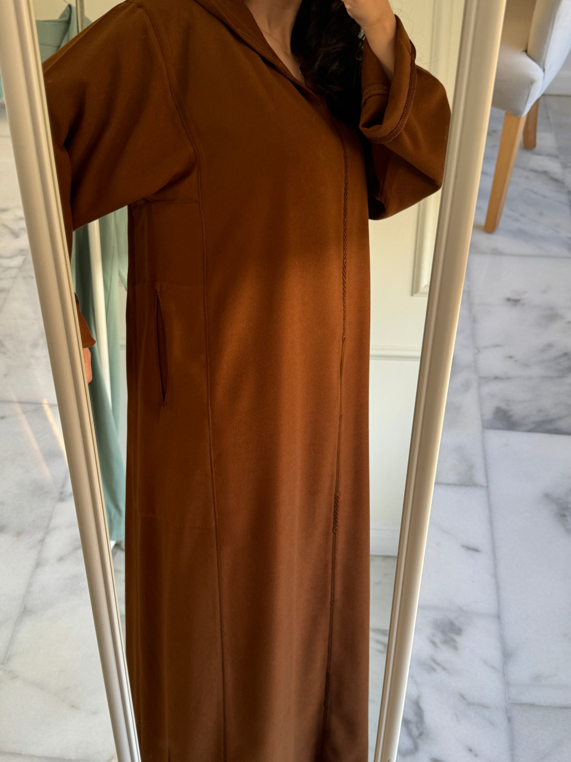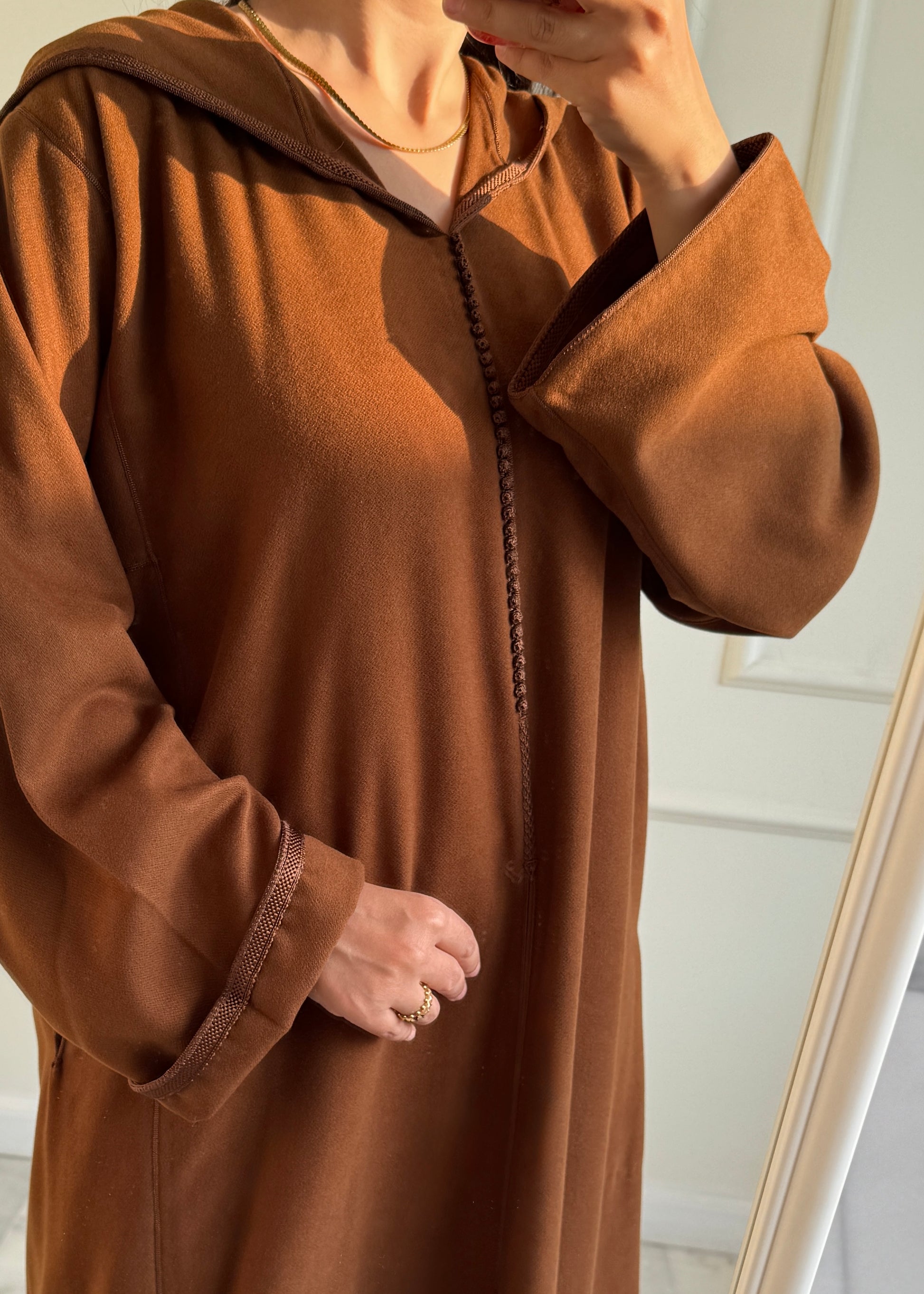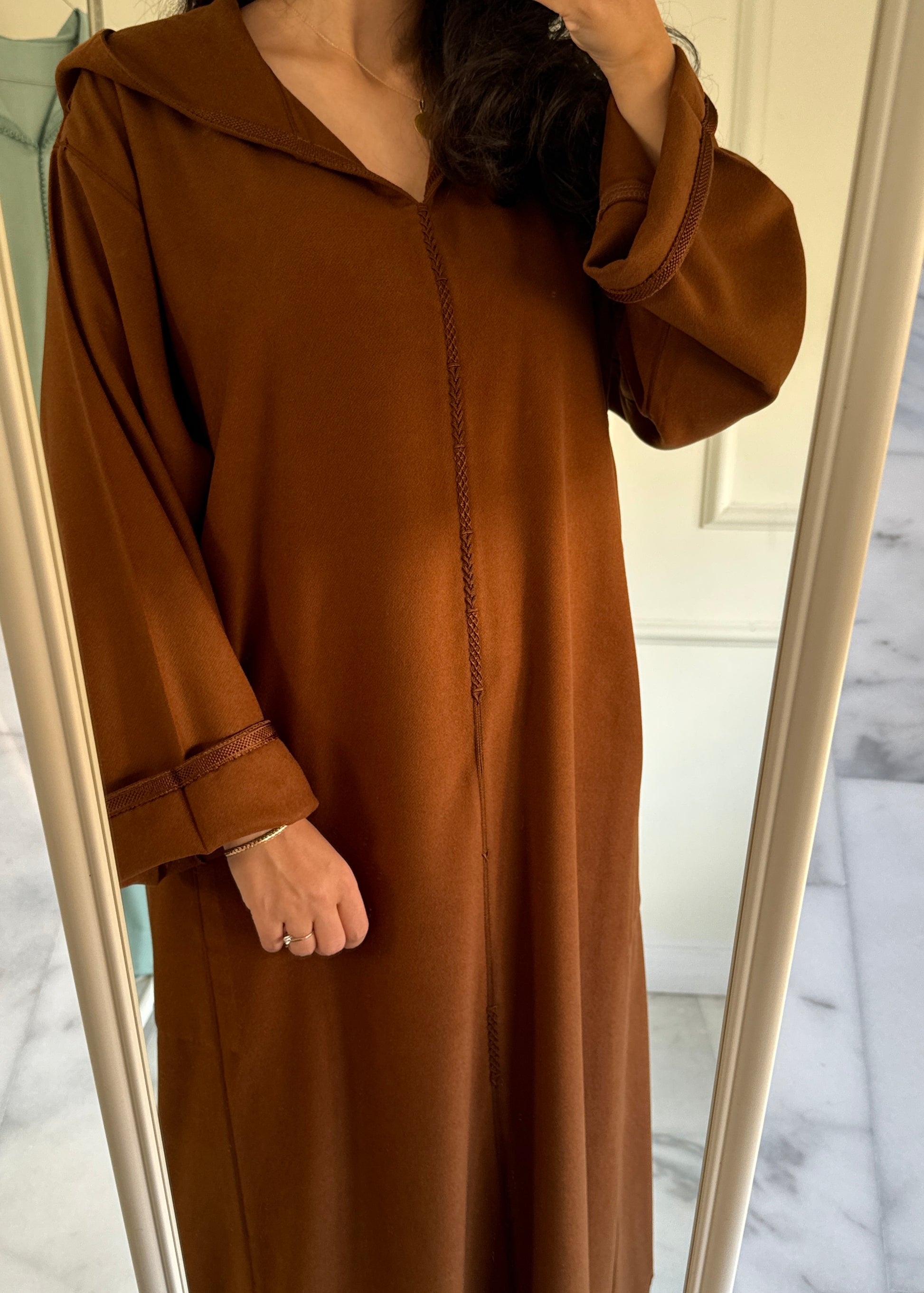 Description : Jellaba en tissu mlifa cachemire, minutieusement confectionnée à la main avec berchmane (Qtib).
