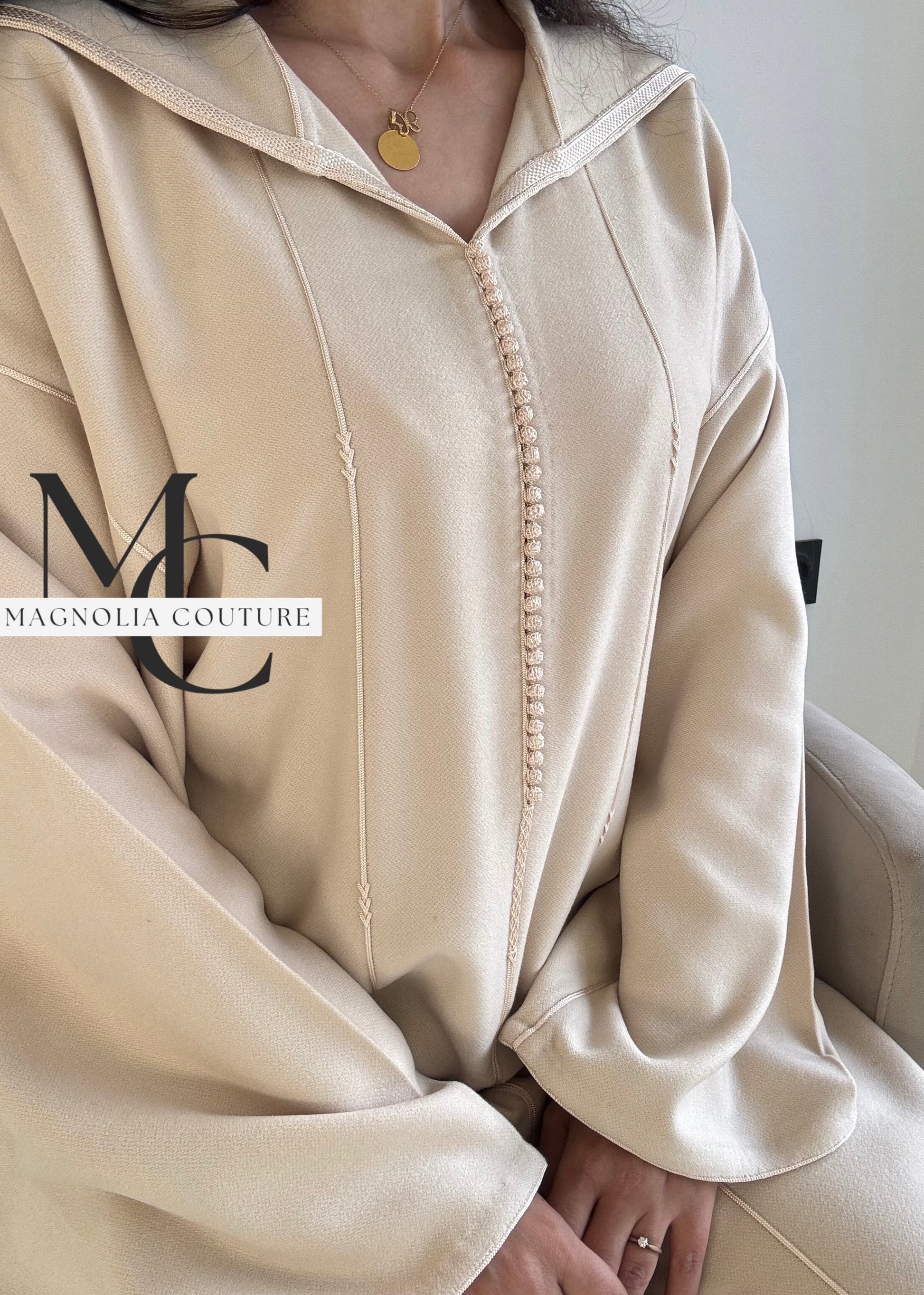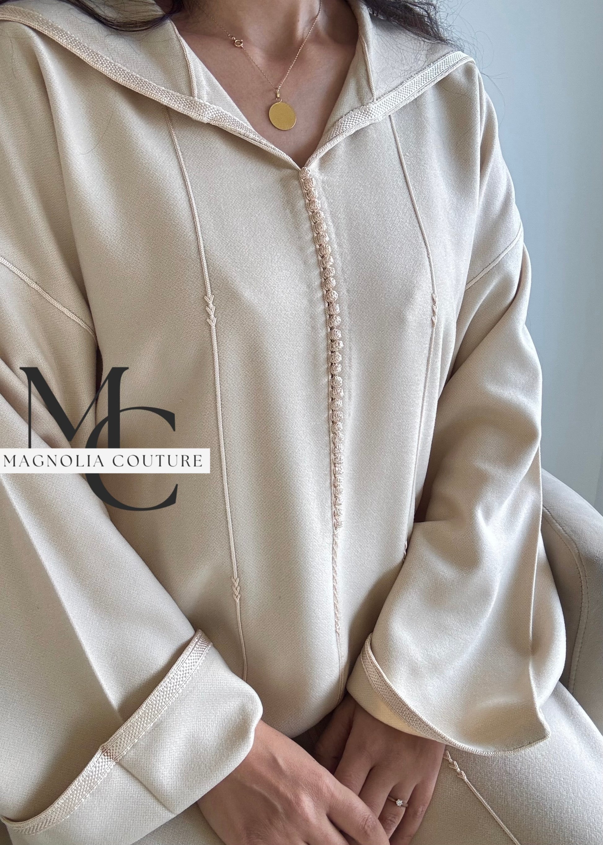 Description : Jellaba en tissu mlifa cachemire, minutieusement confectionnée à la main avec berchmane (Qtib).