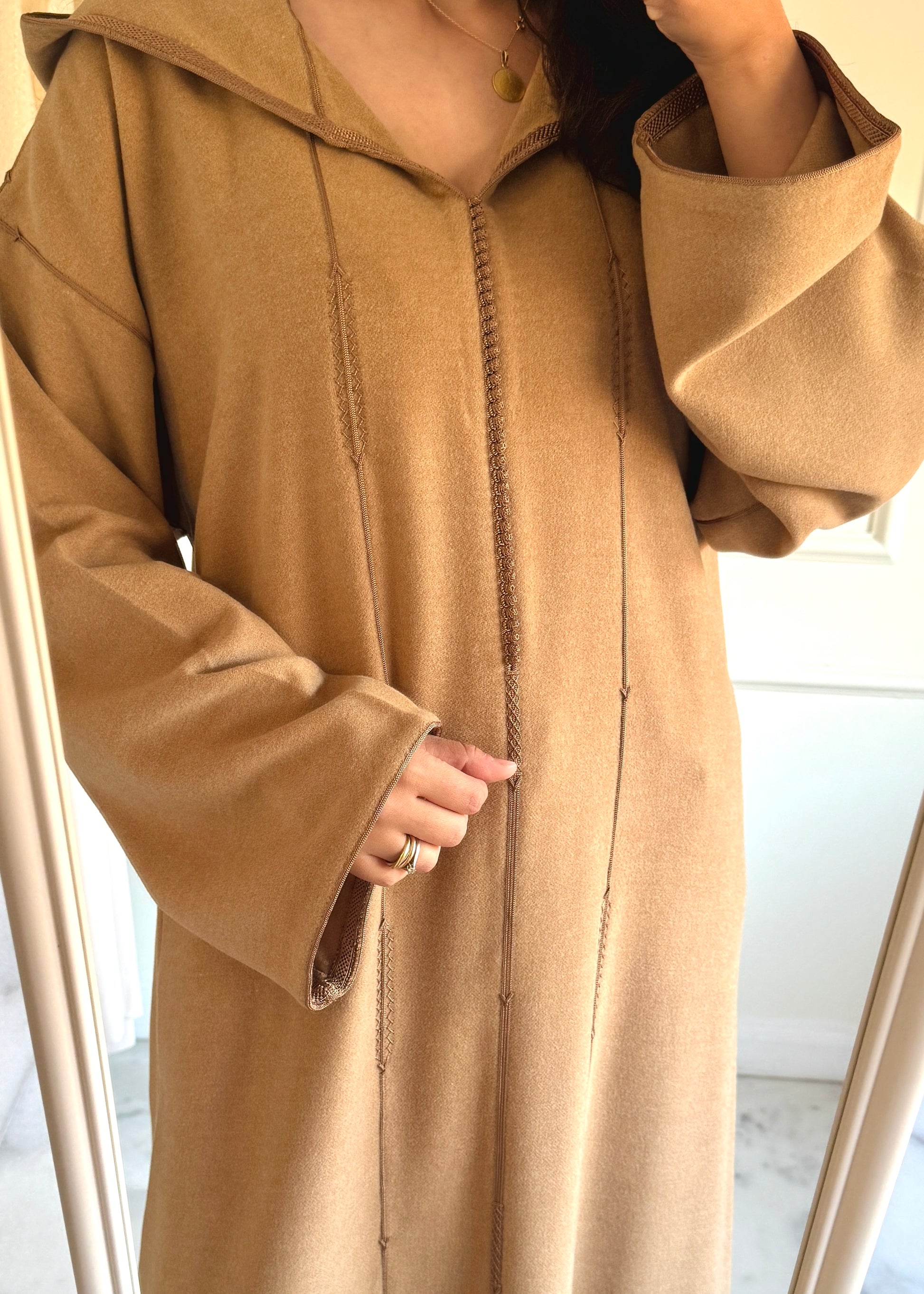 Description : Jellaba en tissu mlifa cachemire, minutieusement confectionnée à la main avec berchmane (Qtib).