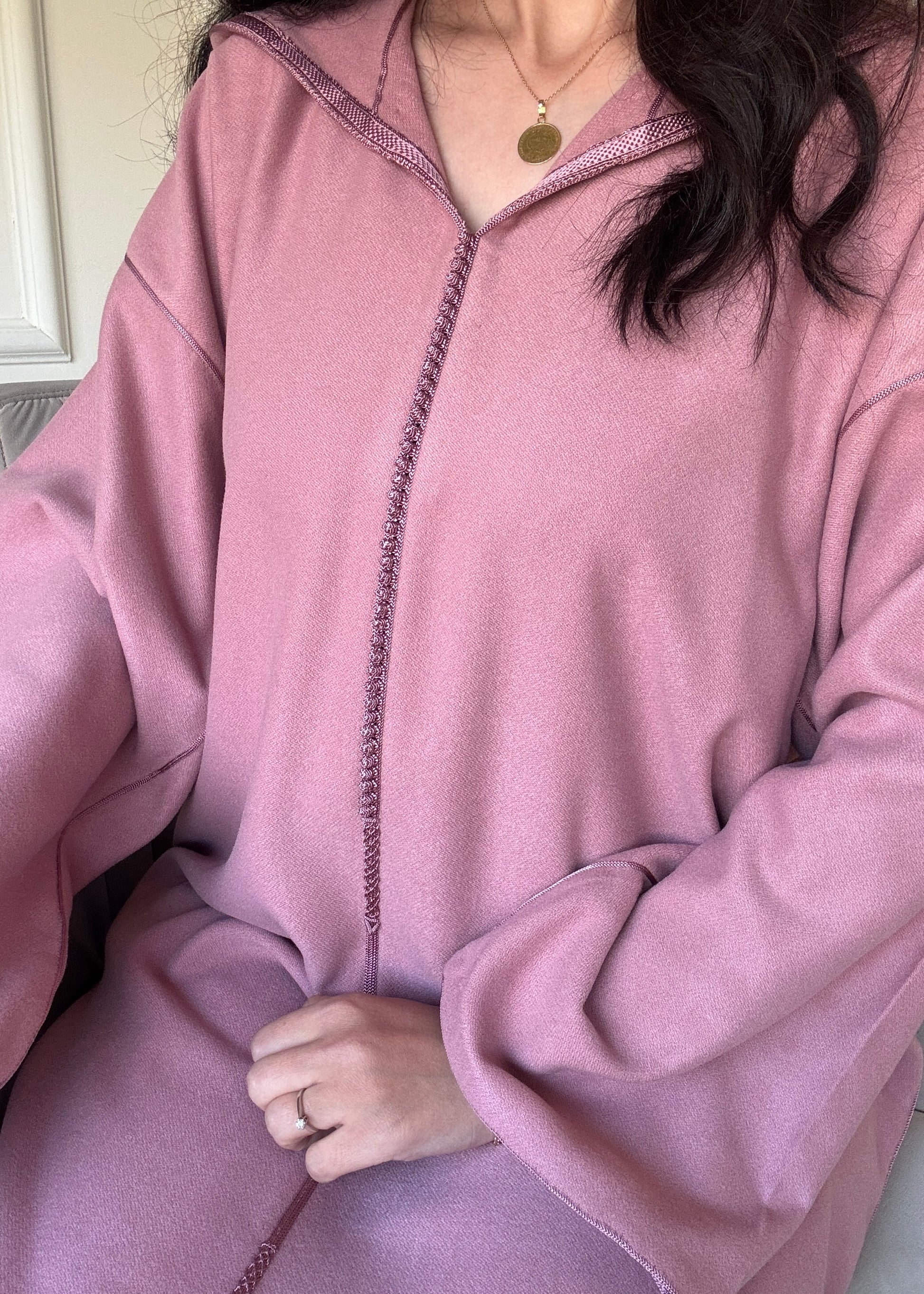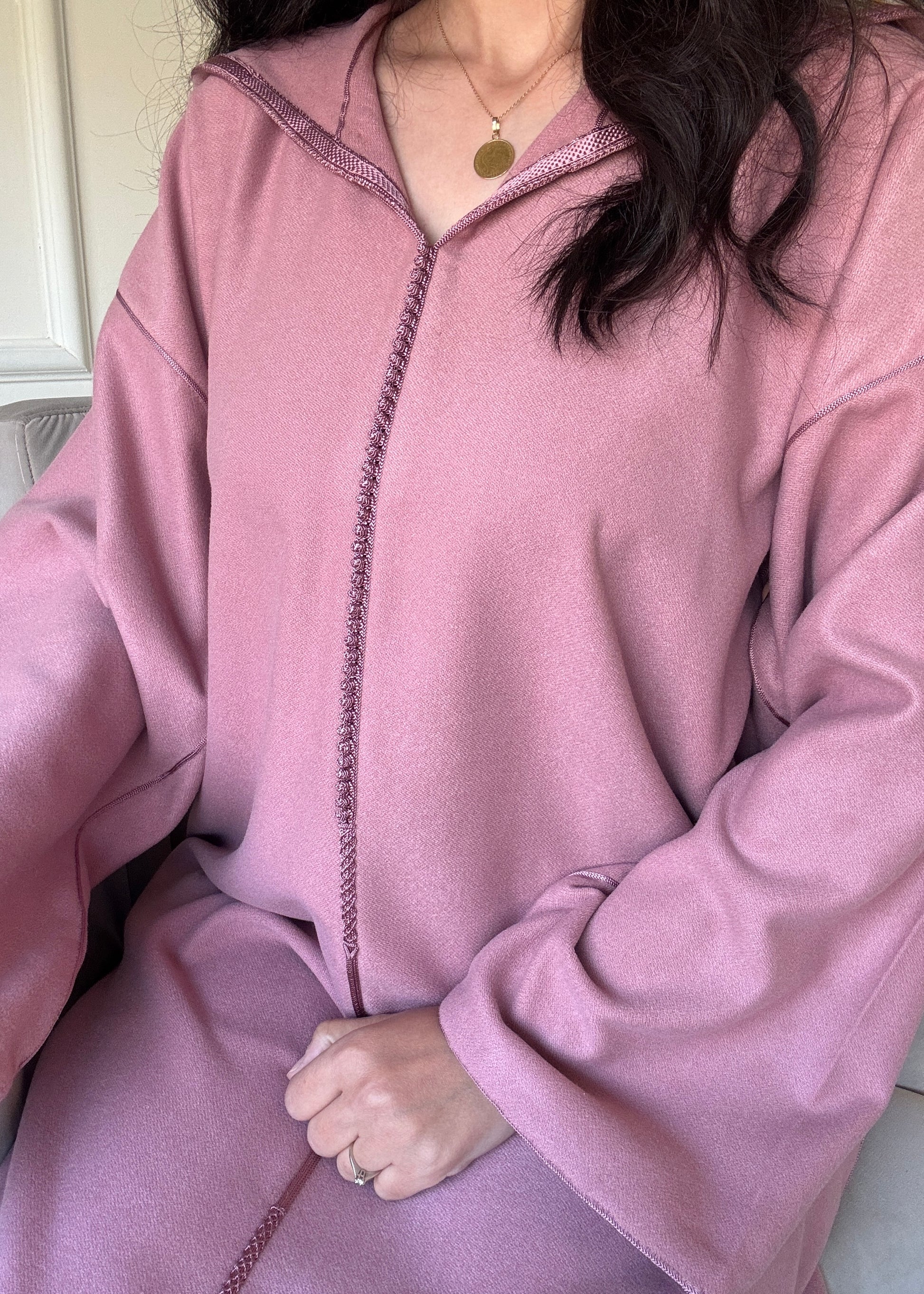 Description : Jellaba en tissu mlifa cachemire, minutieusement confectionnée à la main avec berchmane (Qtib).