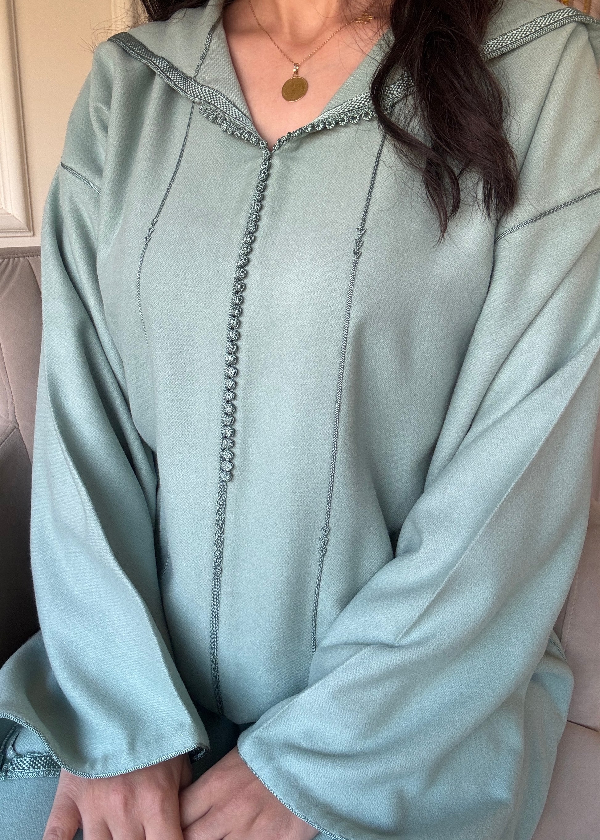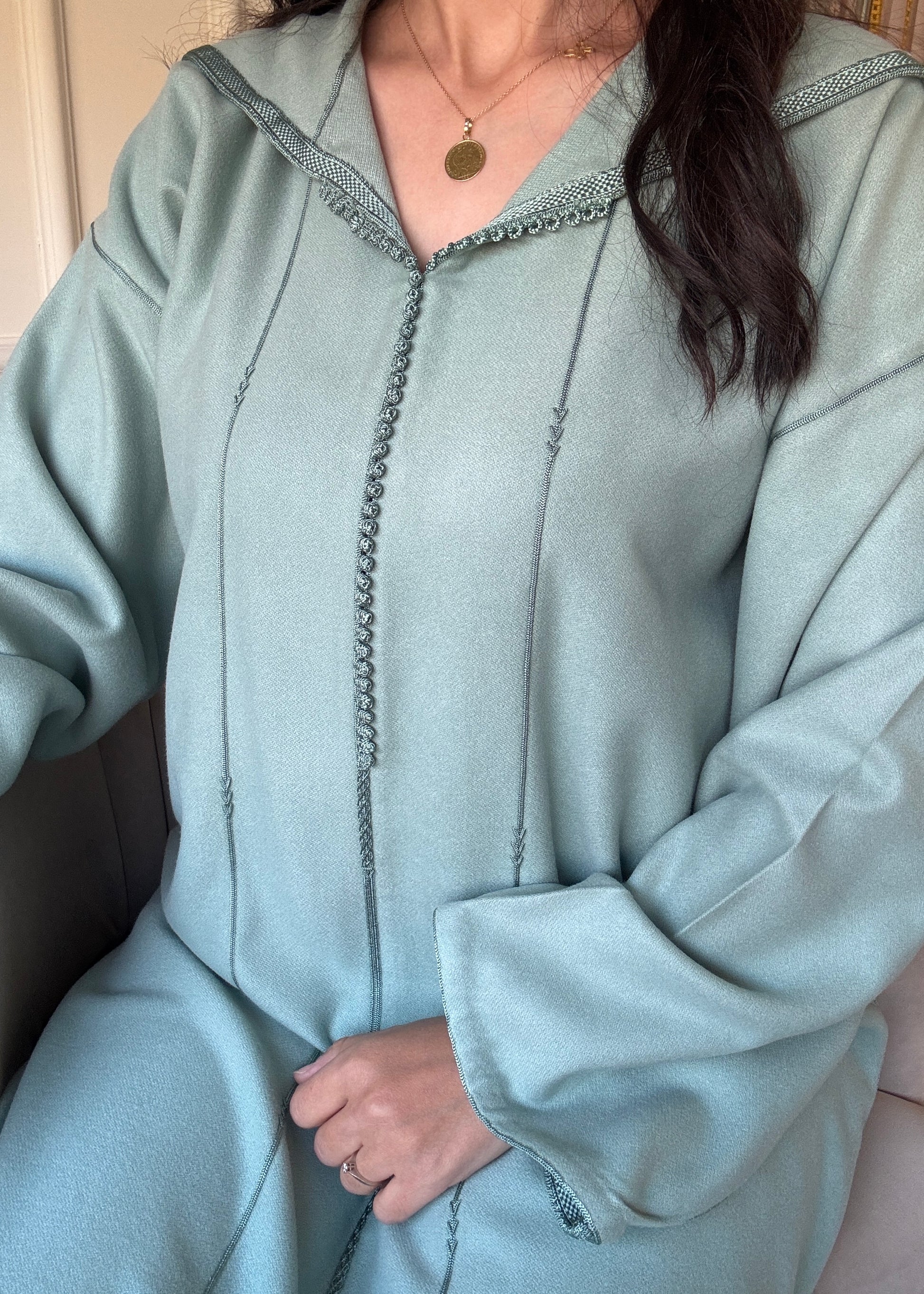 Description : Jellaba en tissu mlifa cachemire, minutieusement confectionnée à la main avec berchmane (Qtib).