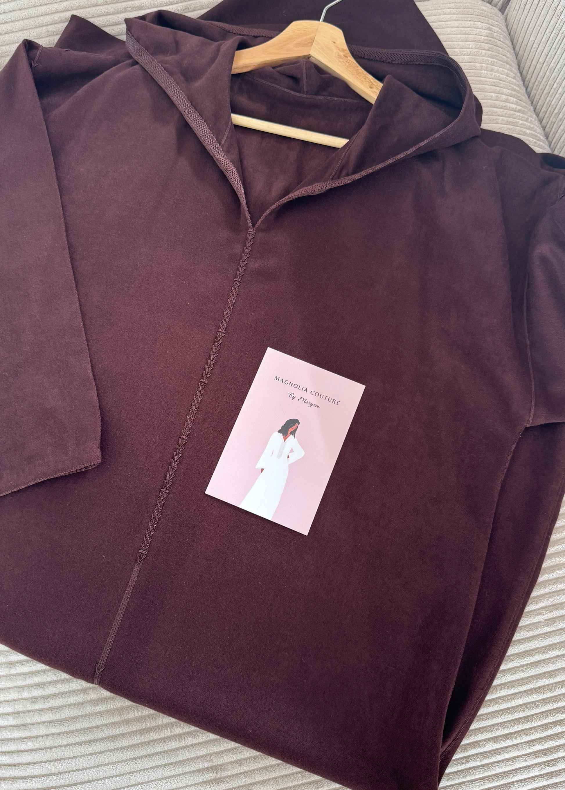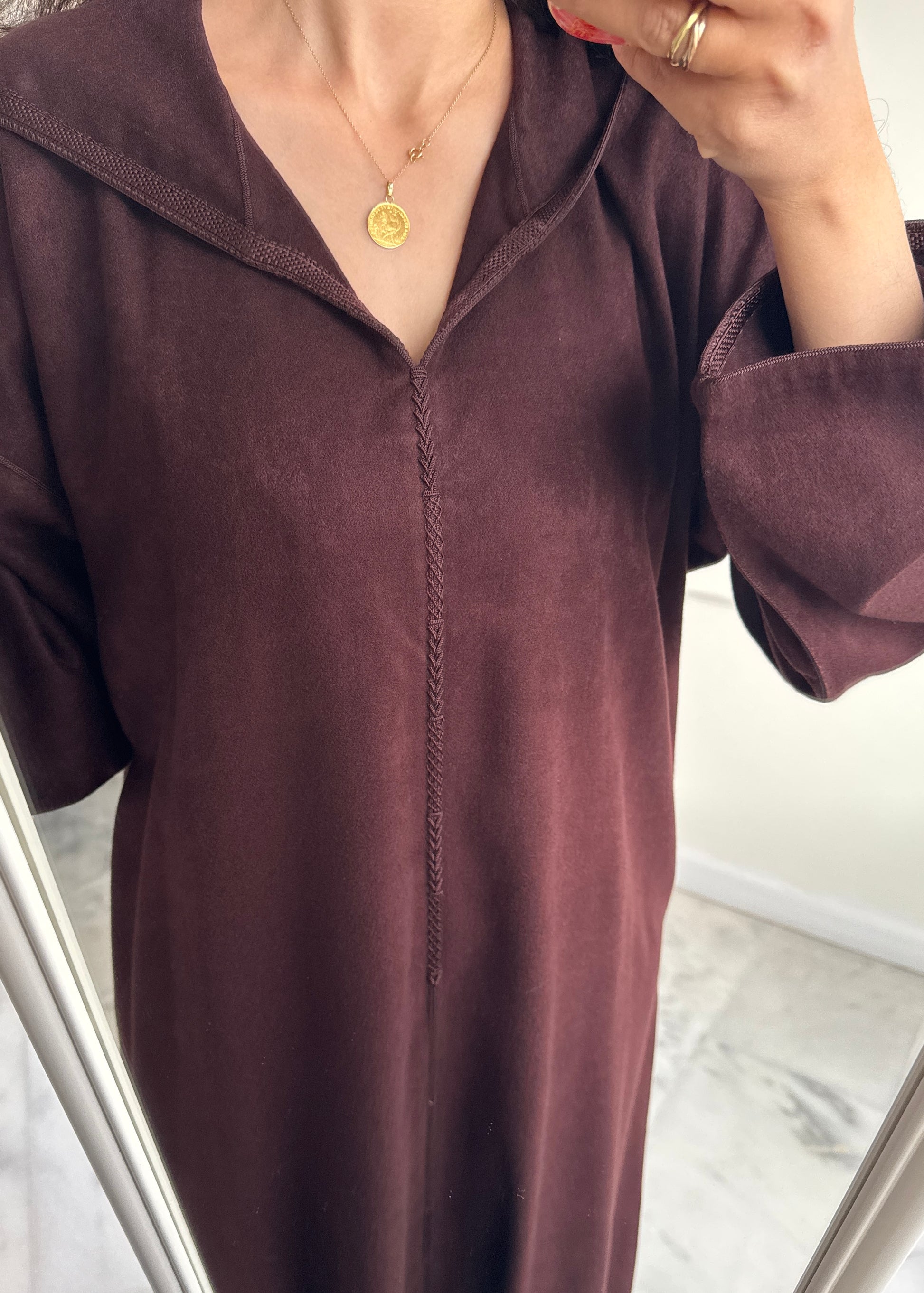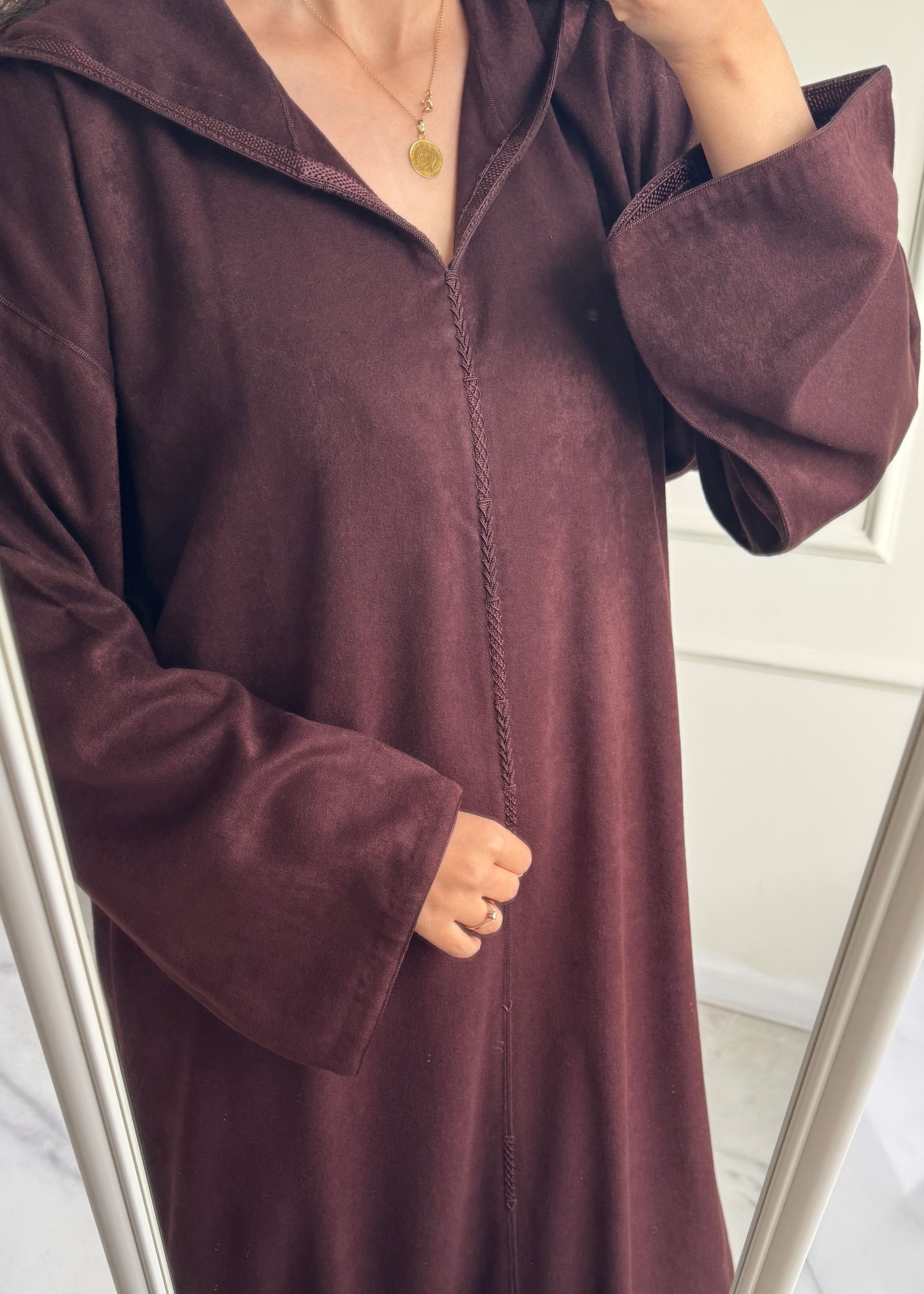Description : Jellaba en tissu mlifa cachemire, minutieusement confectionnée à la main avec berchmane (Qtib).