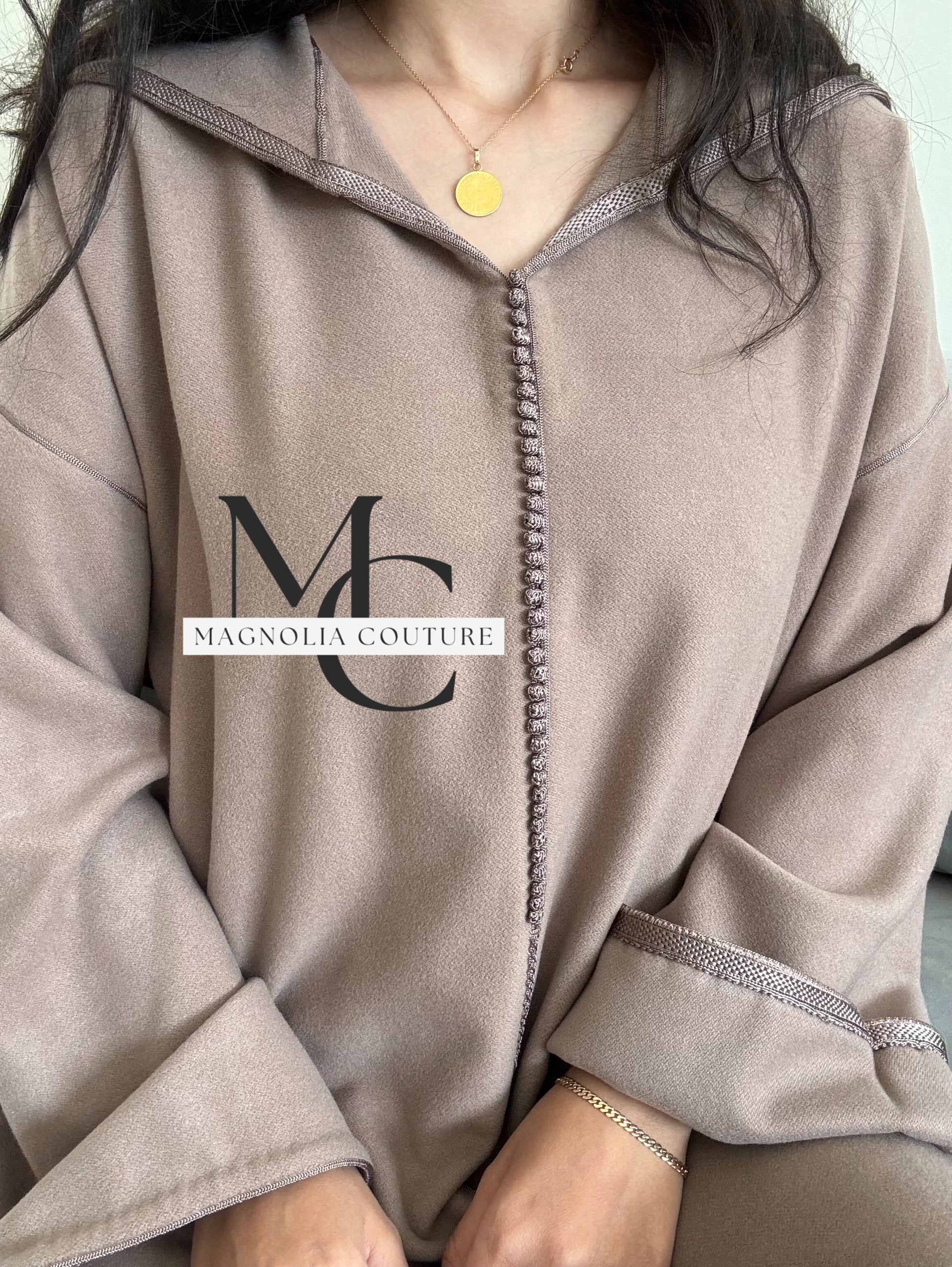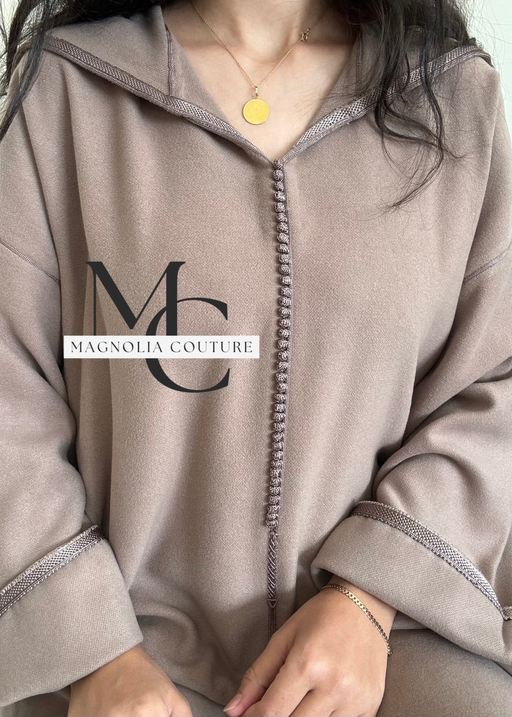 Description : Djellaba en tissu mlifa cachemire, minutieusement confectionnée à la main avec berchmane. Un must-have pour l’hiver.