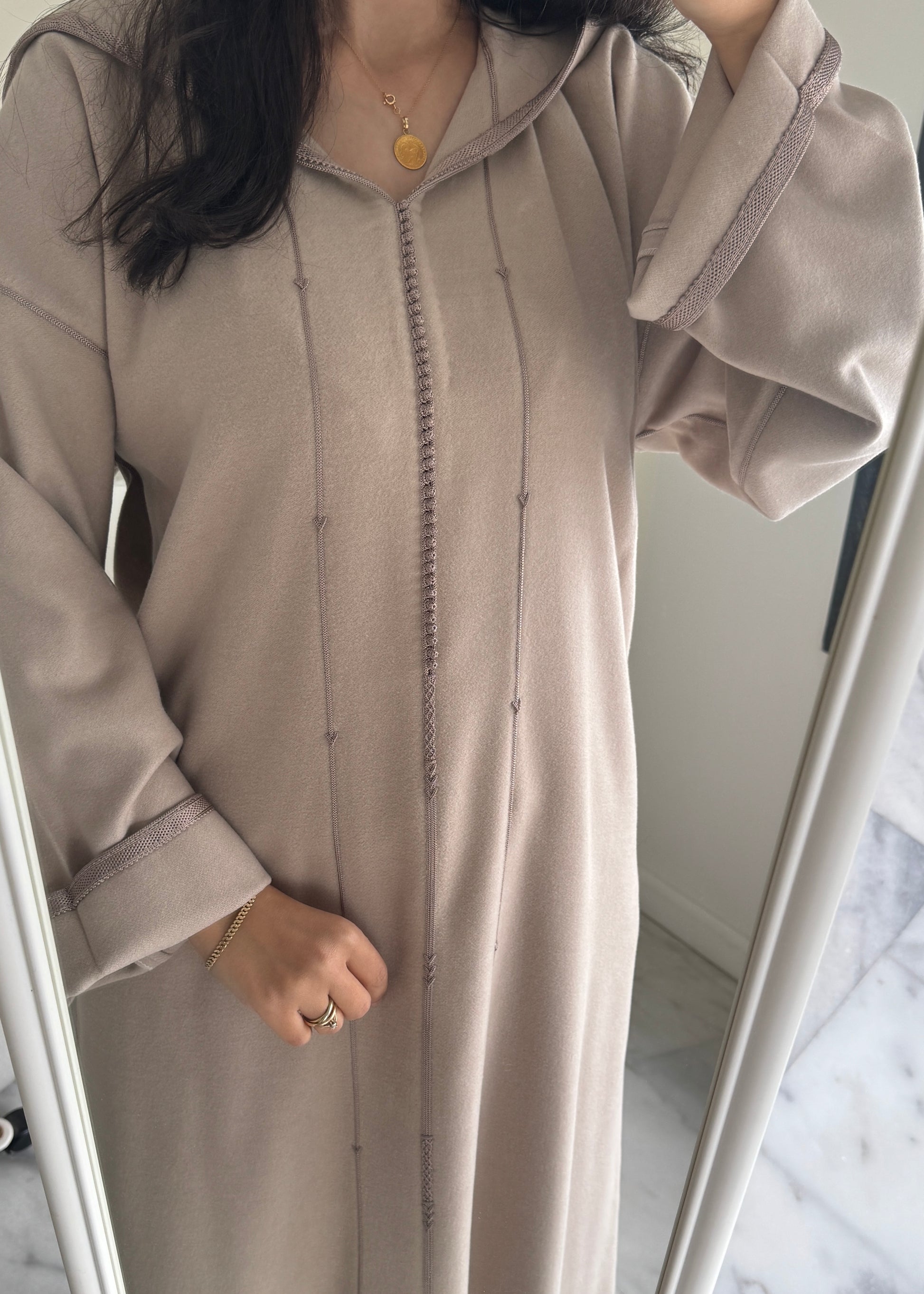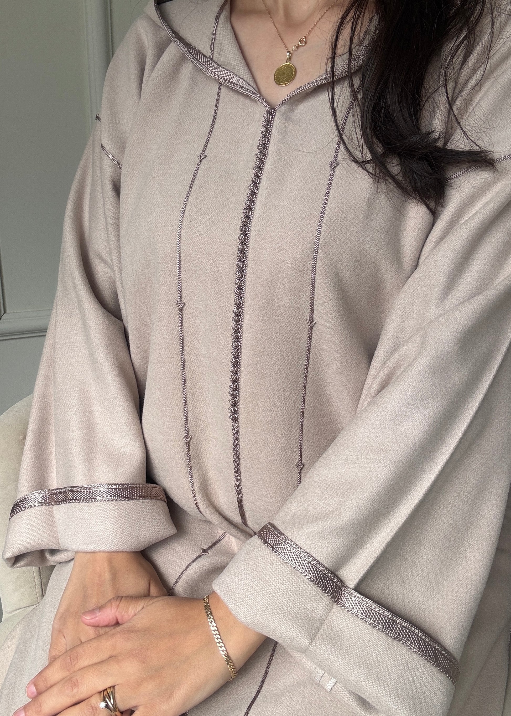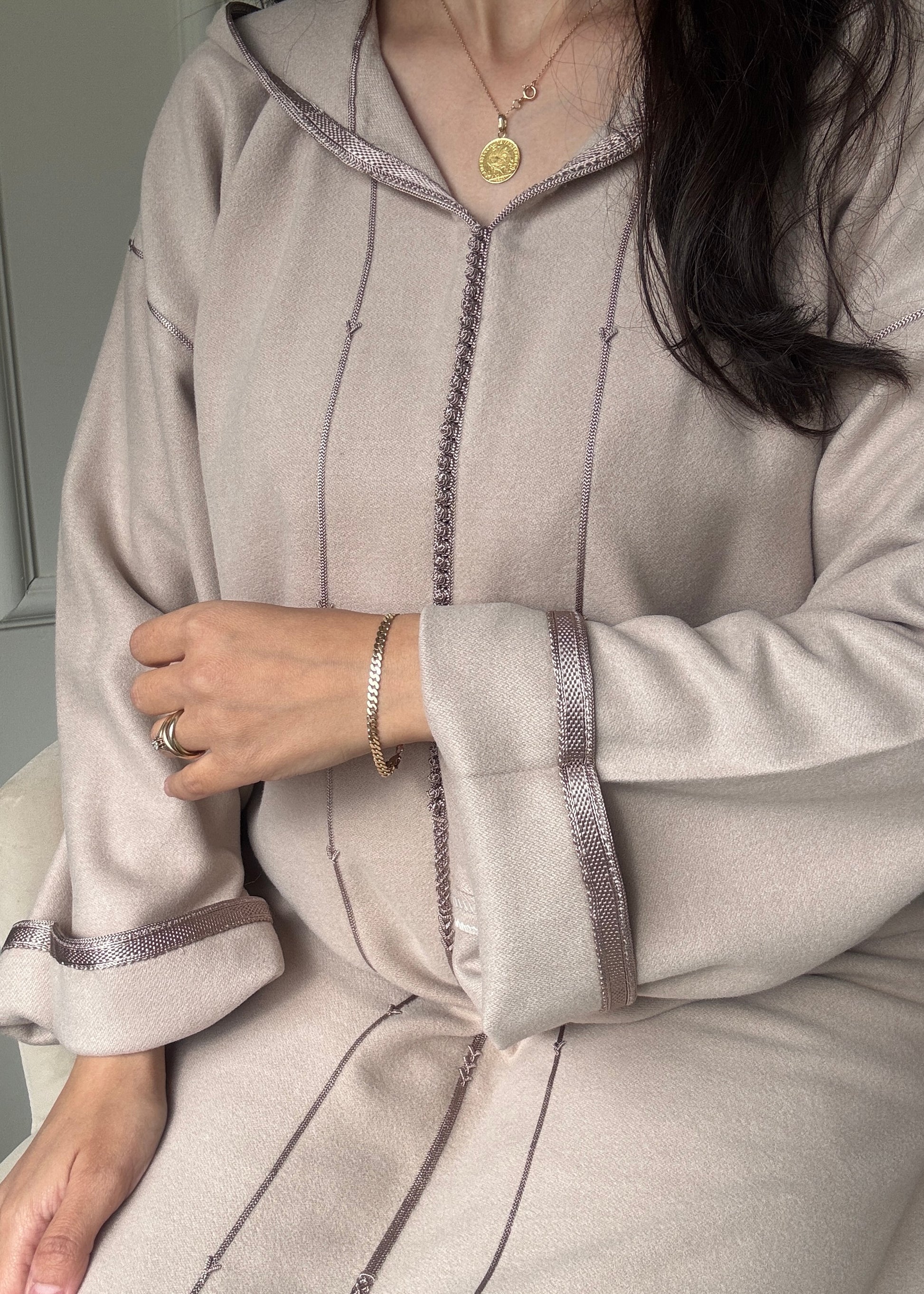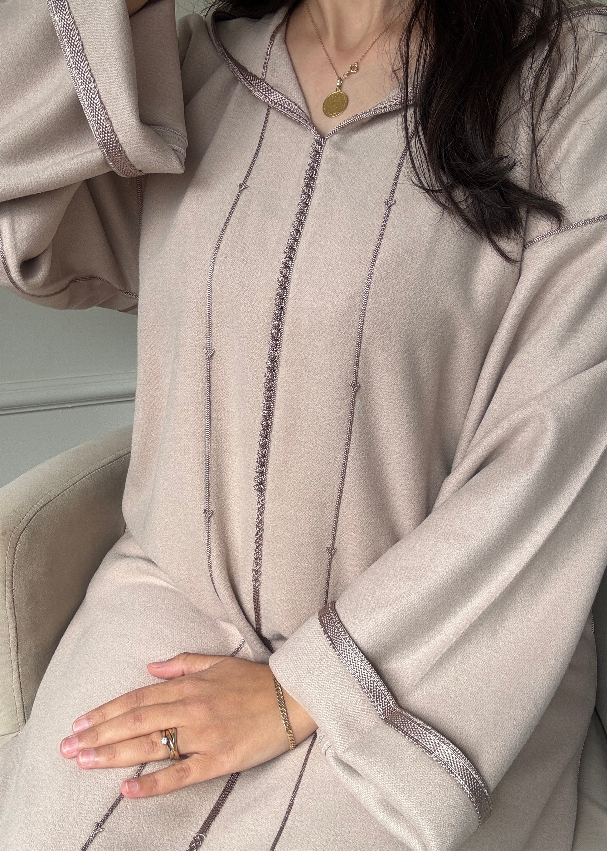 Description : Jellaba en tissu mlifa cachemire, minutieusement confectionnée à la main avec berchmane (Qtib).