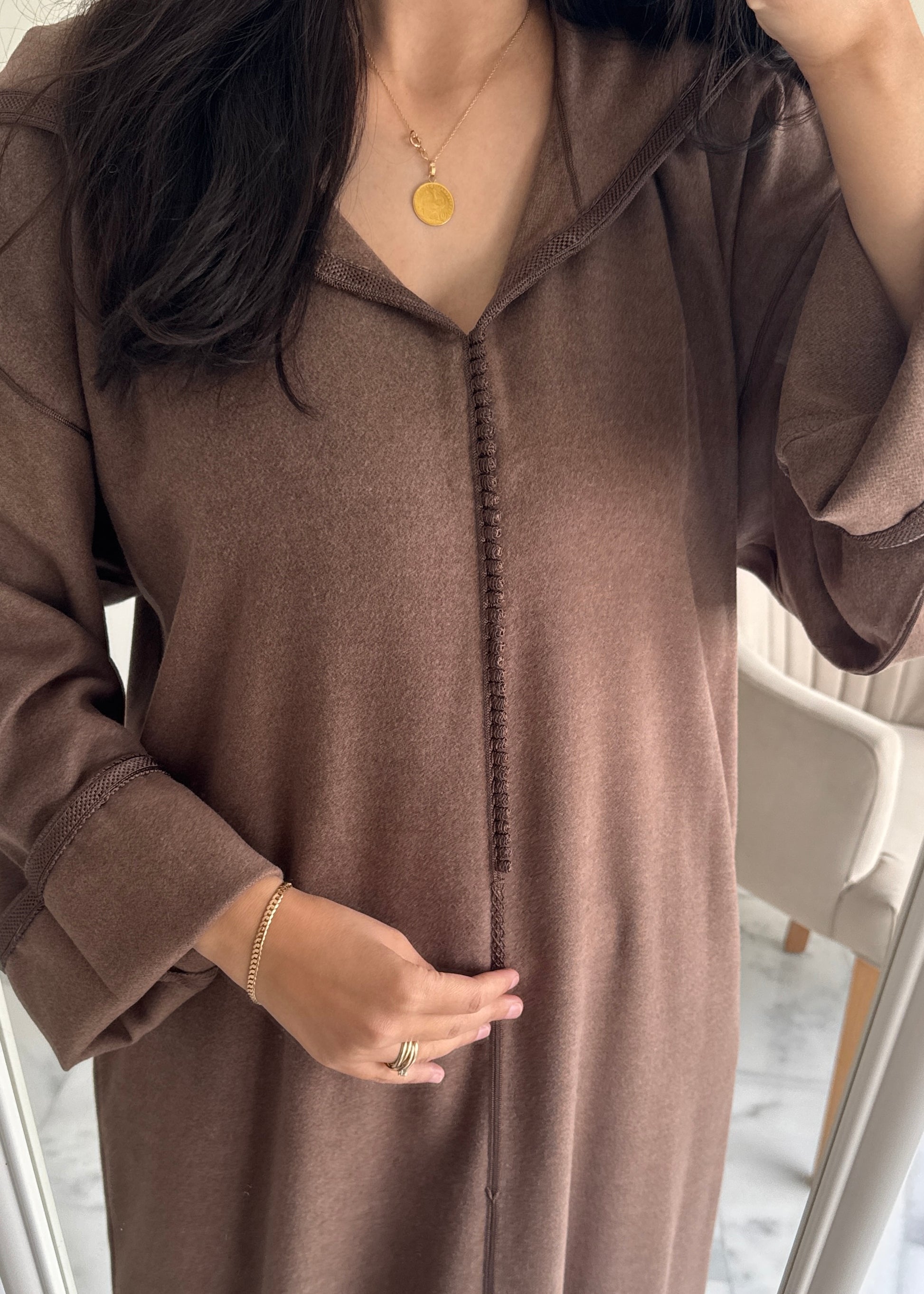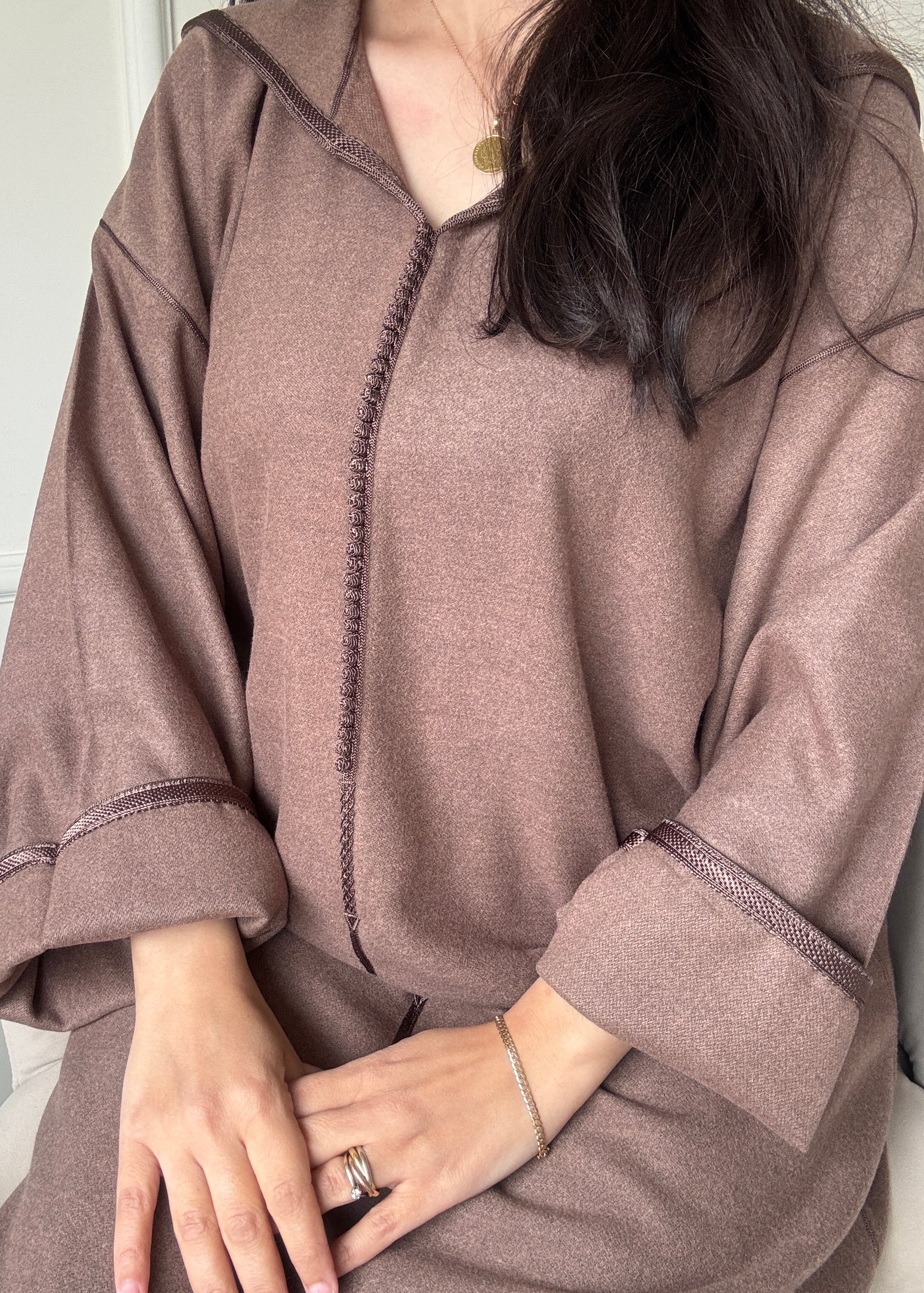 Description : Jellaba en tissu mlifa cachemire, minutieusement confectionnée à la main avec berchmane (Qtib).