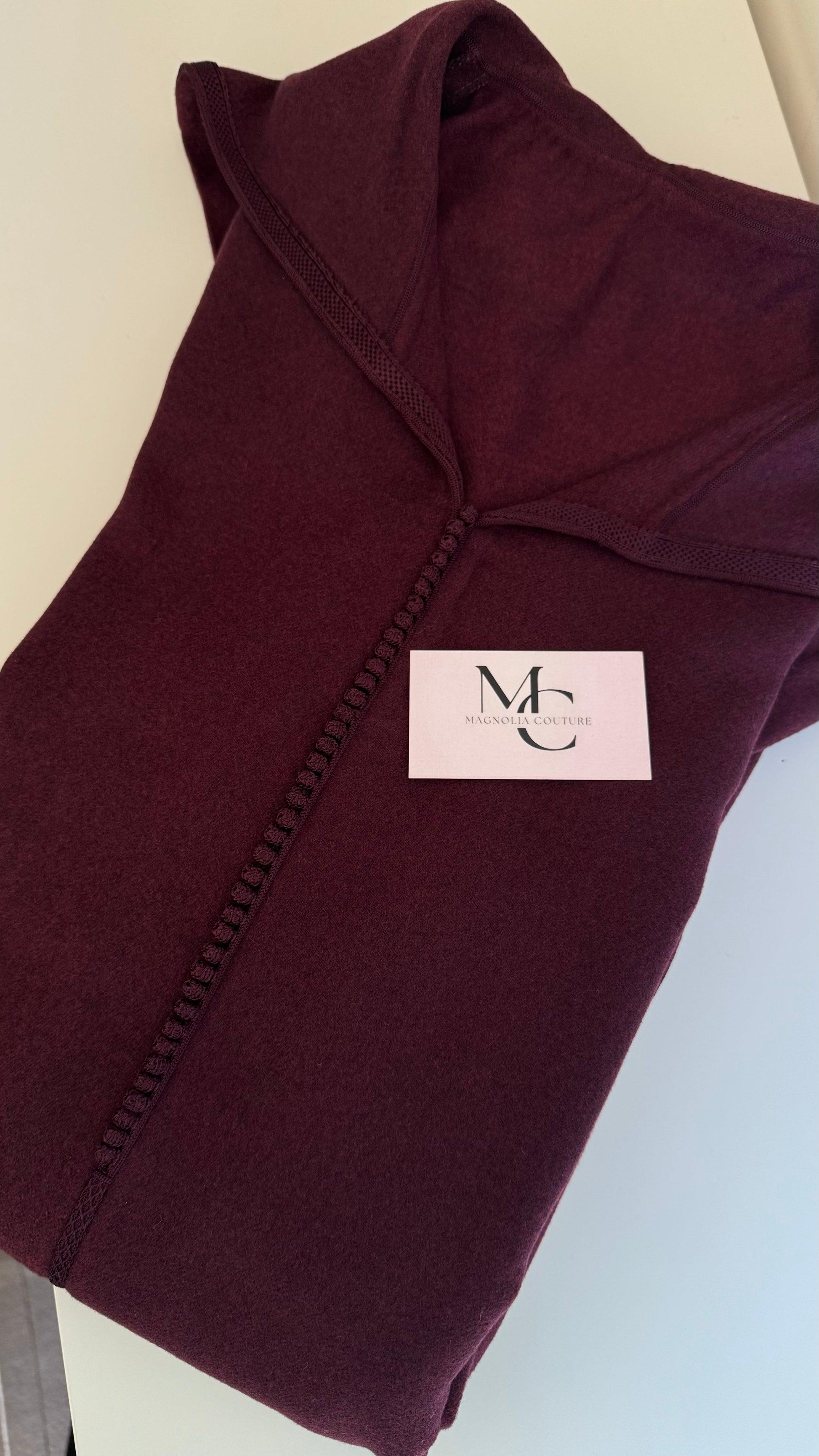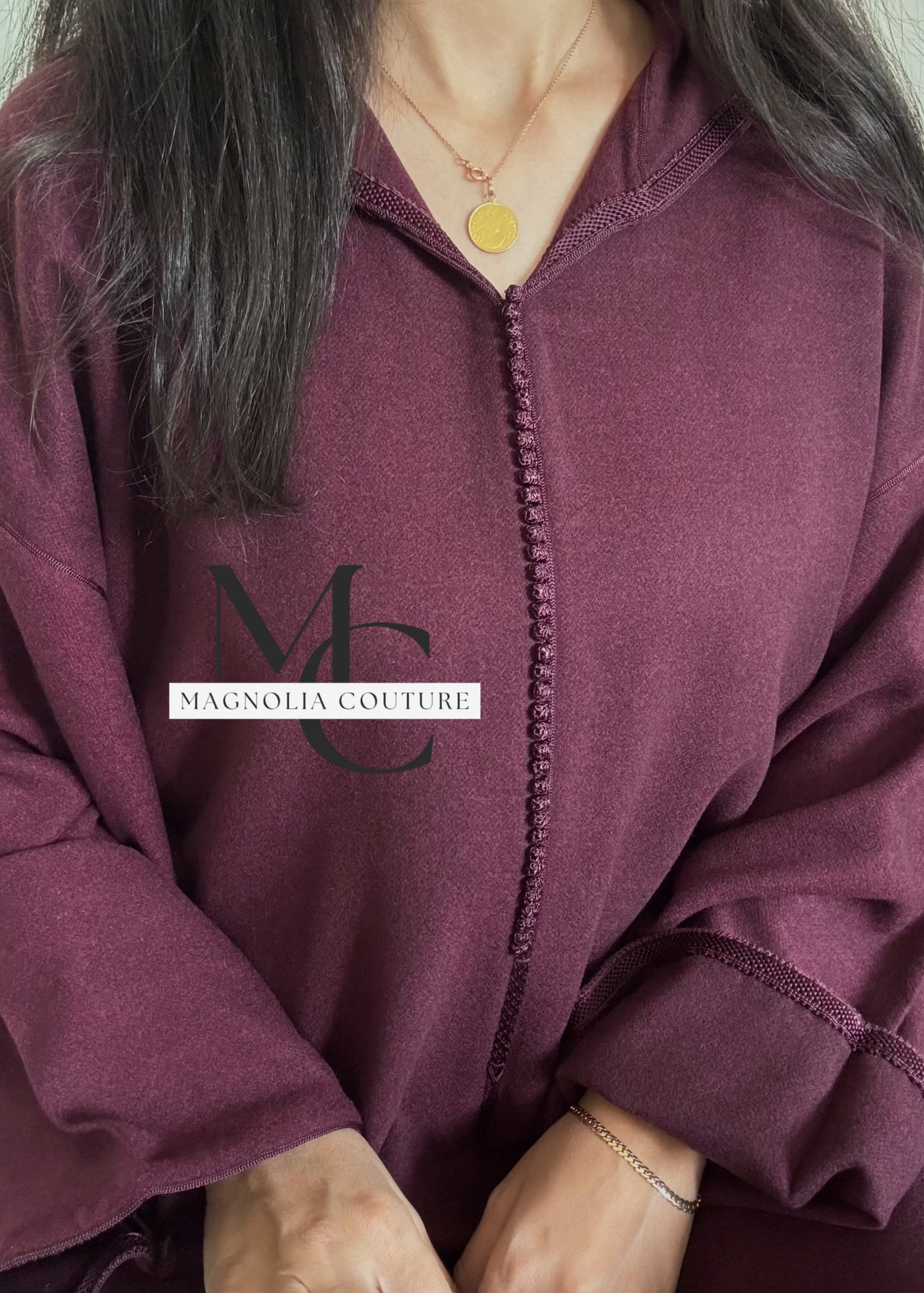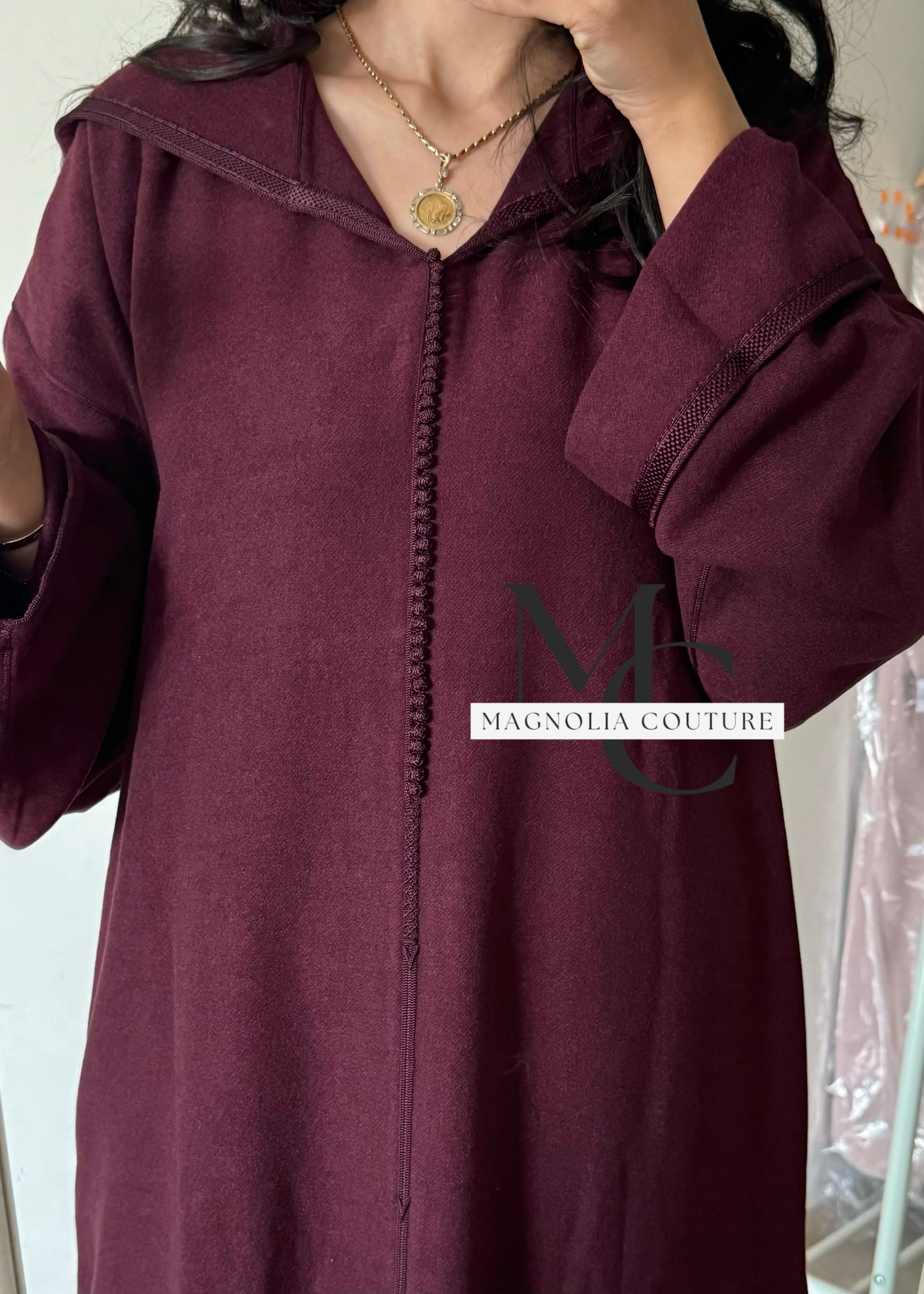 Description : Djellaba en tissu mlifa cachemire, minutieusement confectionnée à la main avec berchmane. Un must-have pour l’hiver.