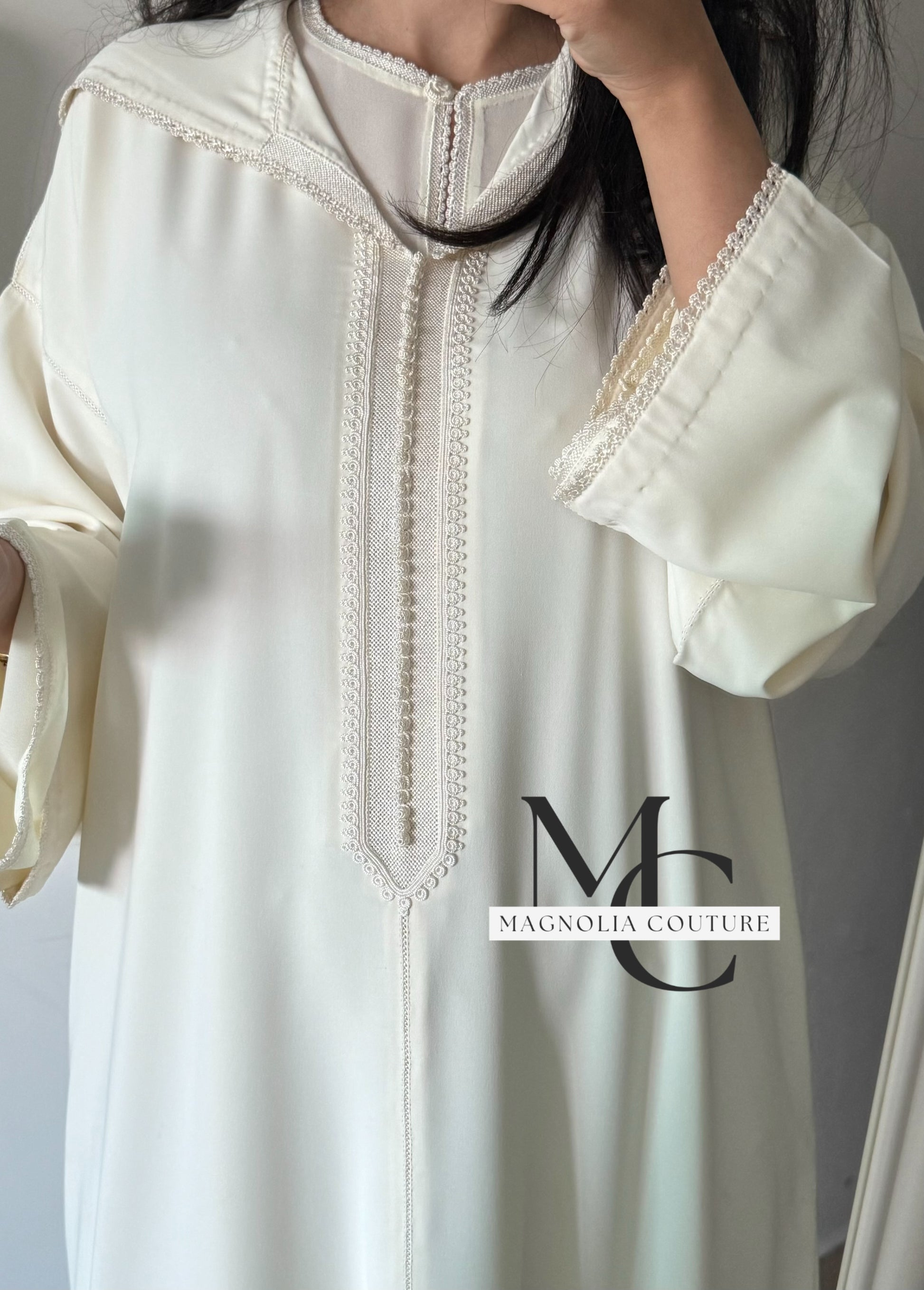 Cette jellaba deux pièces fusionne harmonieusement le travail raffiné de malam et la randa. Confectionnée en crêpe de soie fluide avec une touche de mousseline, idéale pour Omra.