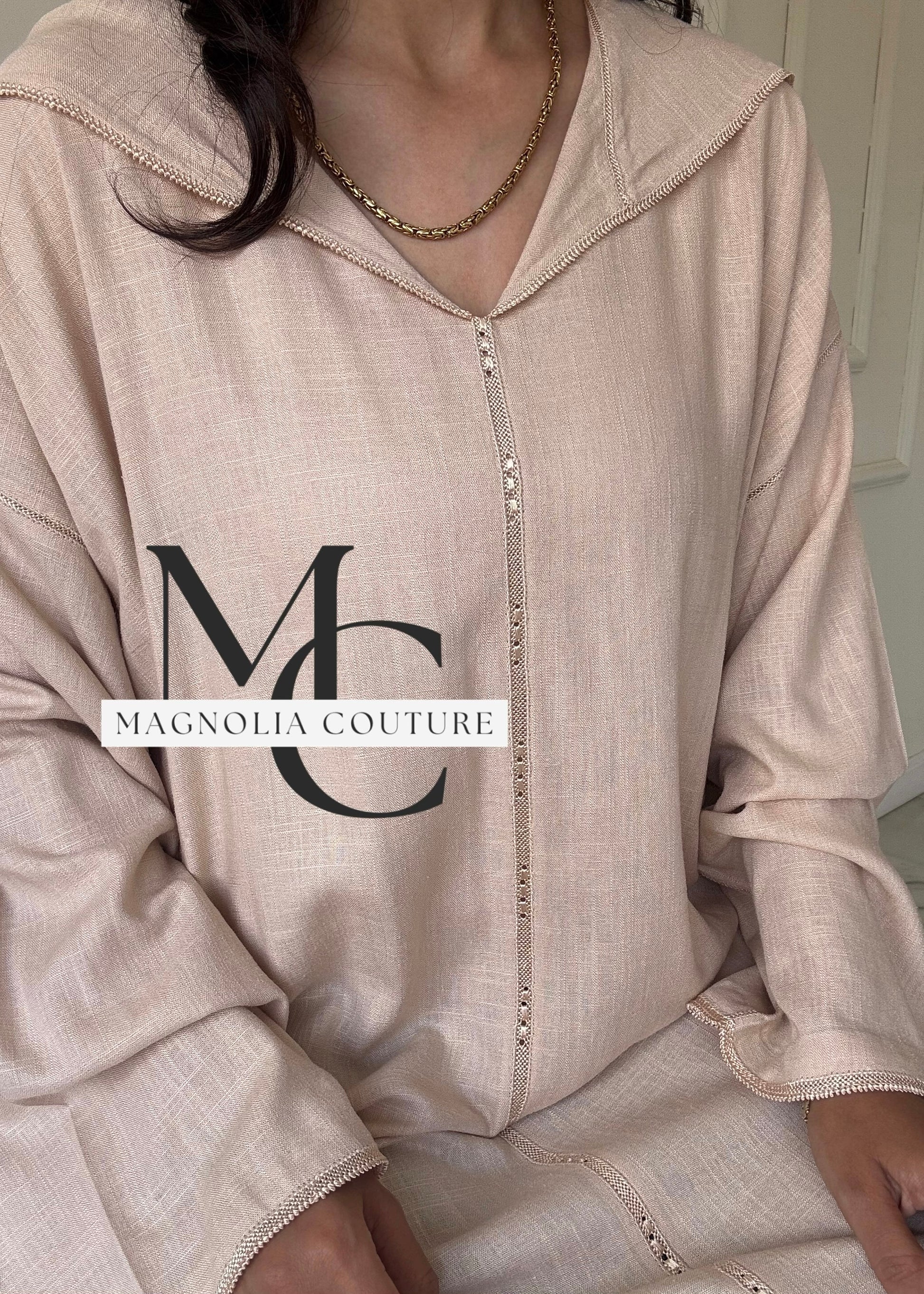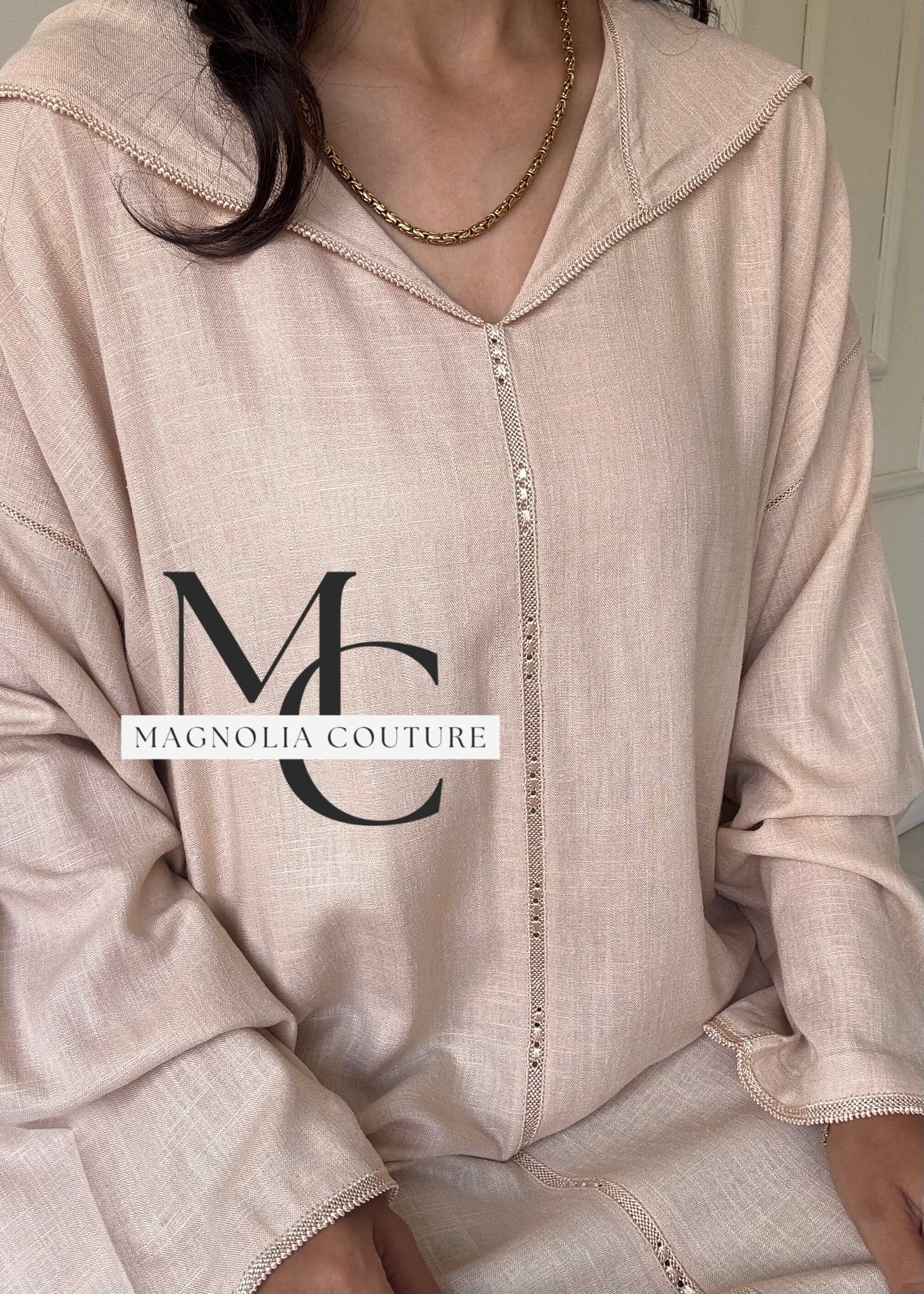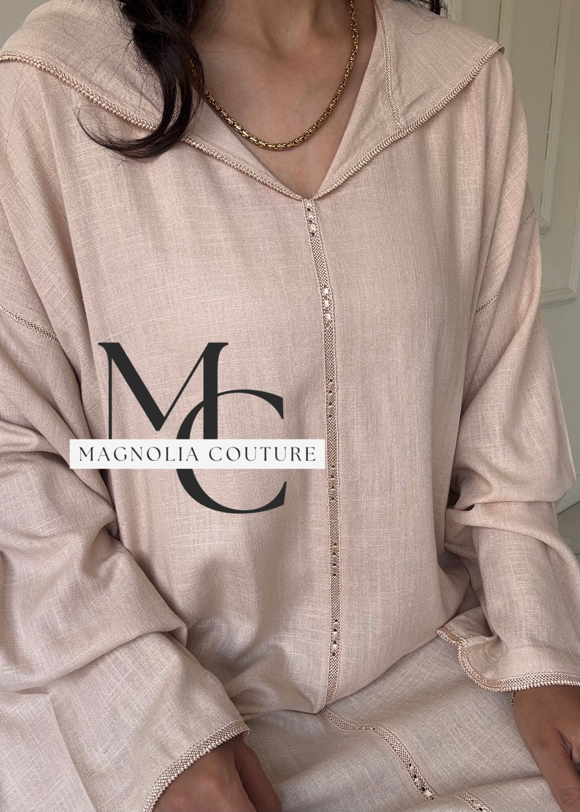 Jellaba en lin, sublimée par un travail raffiné de randa. Légère et respirante, idéale pour allier confort et élégance.