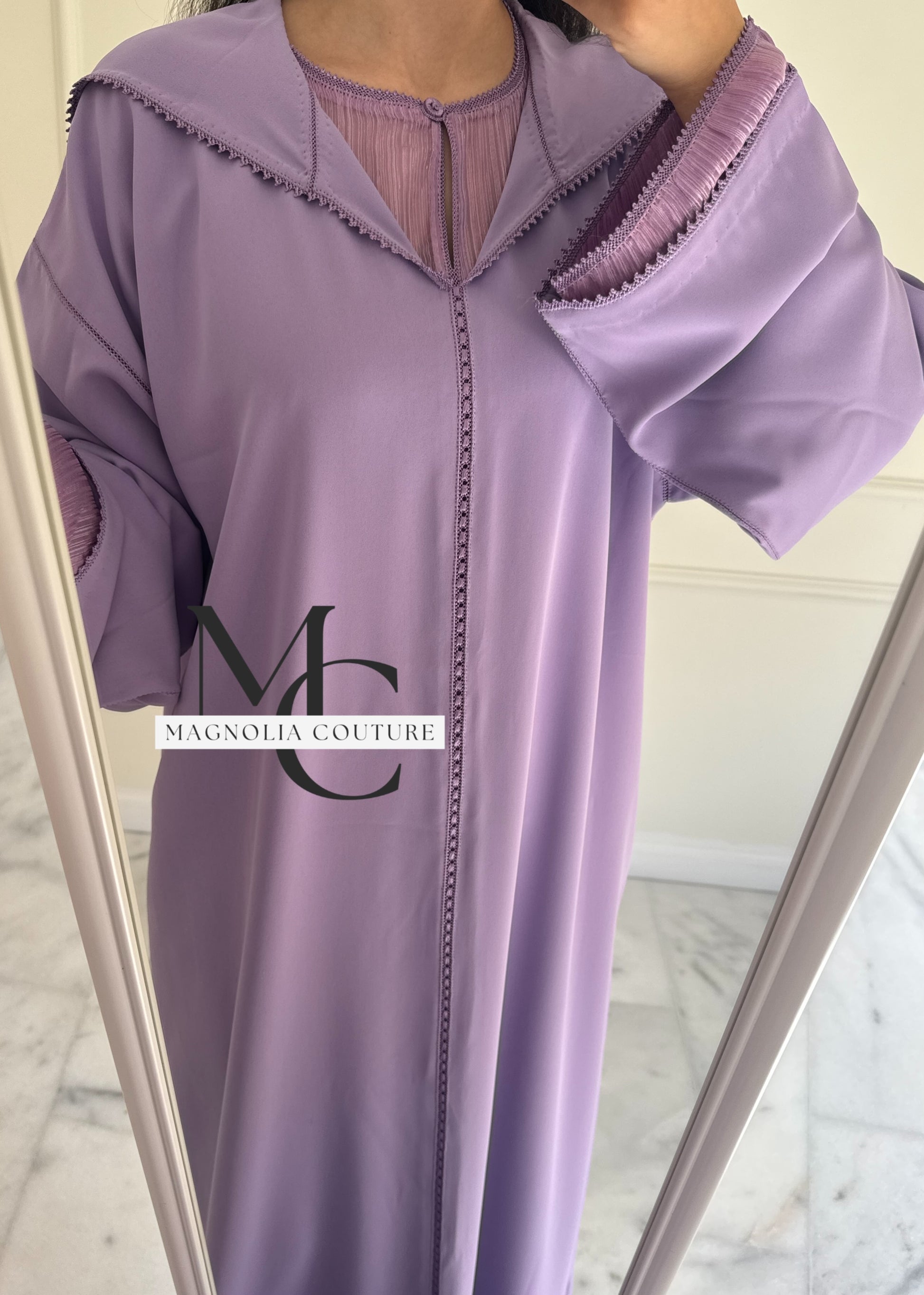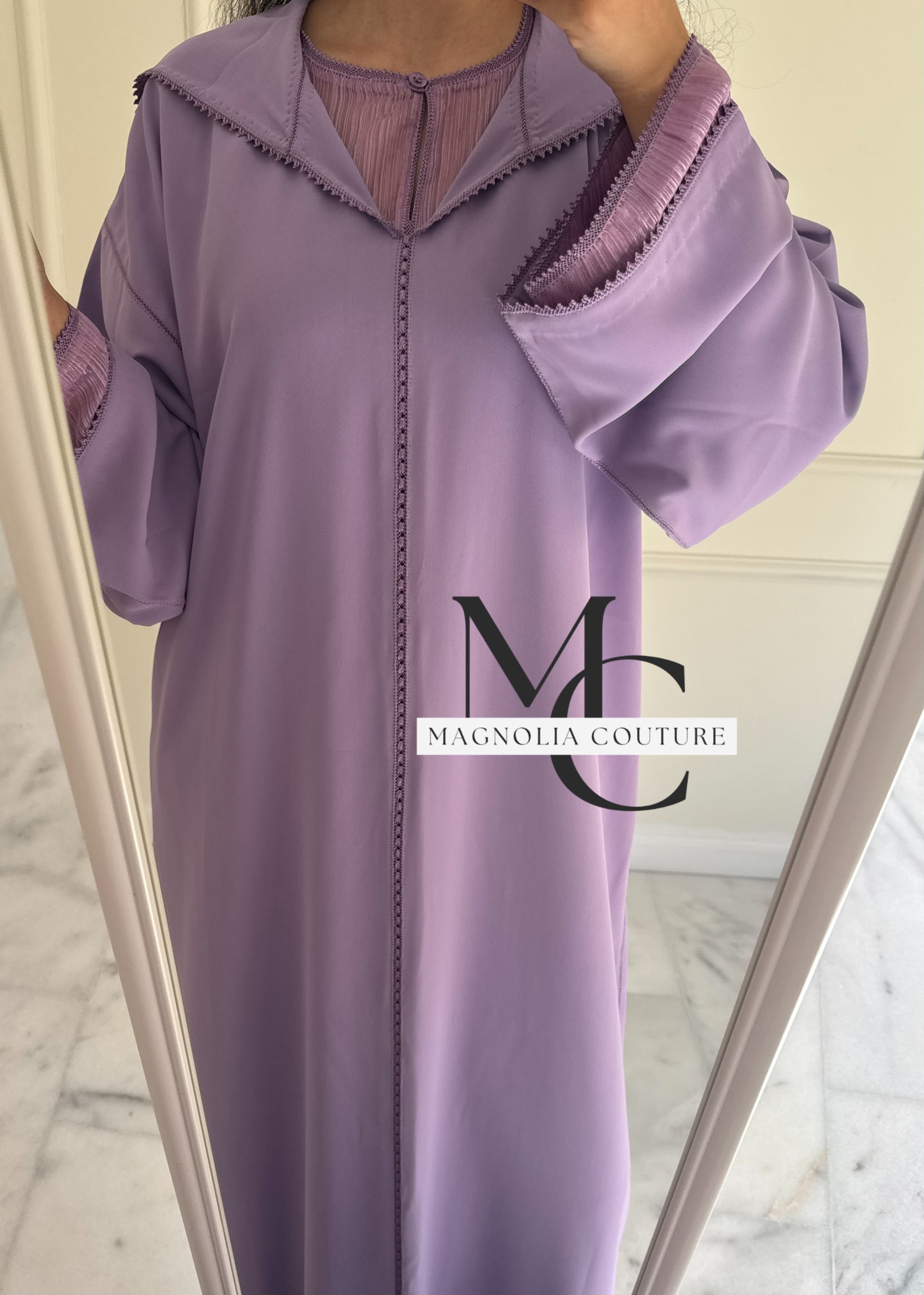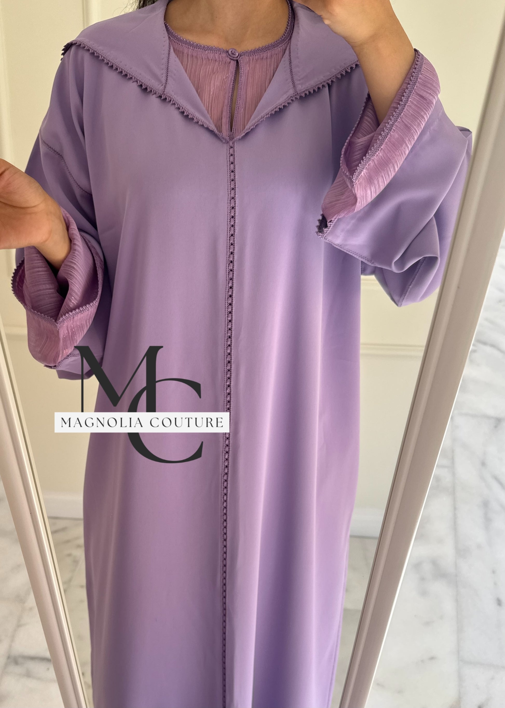 Description : La djellaba se compose de deux pièces, ornée d'une randa simple. Le qmiss en mousseline en dessous apporte légèreté et confort, fusionnant tradition et élégance dans cette tenue raffinée.