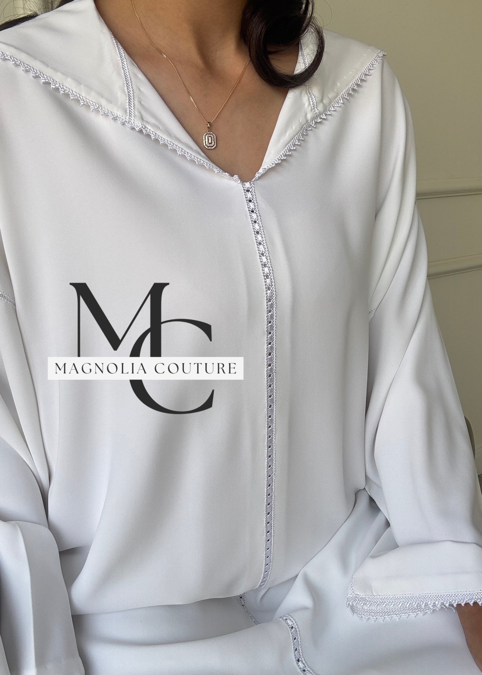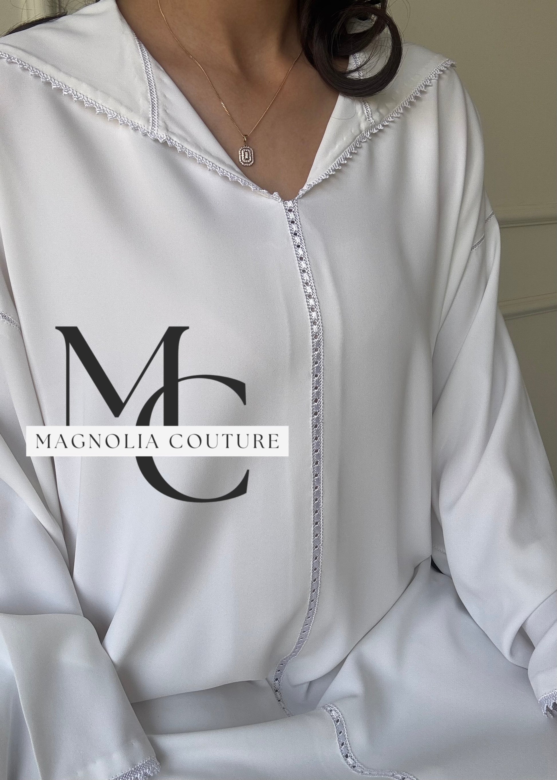 La djellaba est travaillée avec randa simple. Une tenue raffinée et élégante.