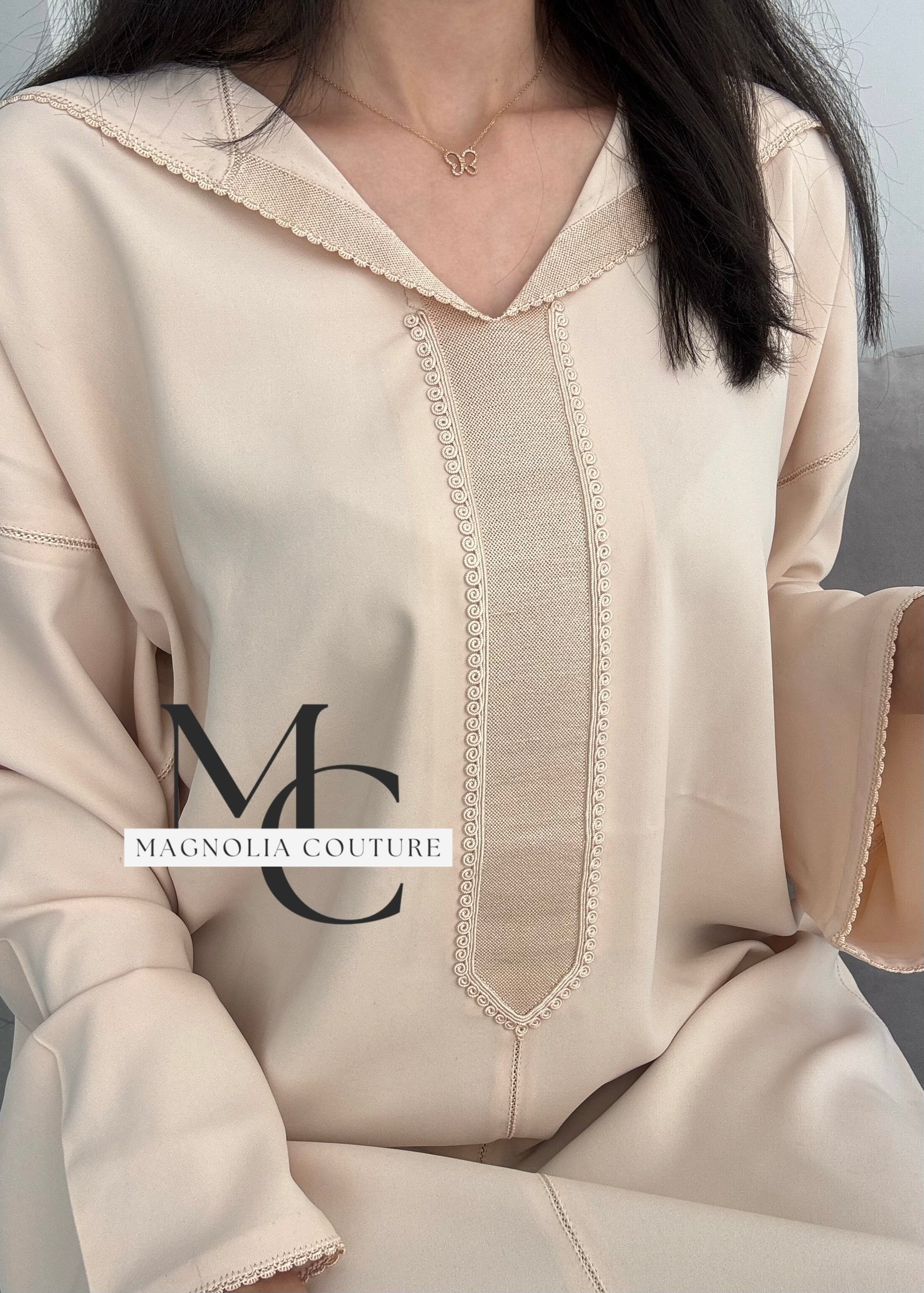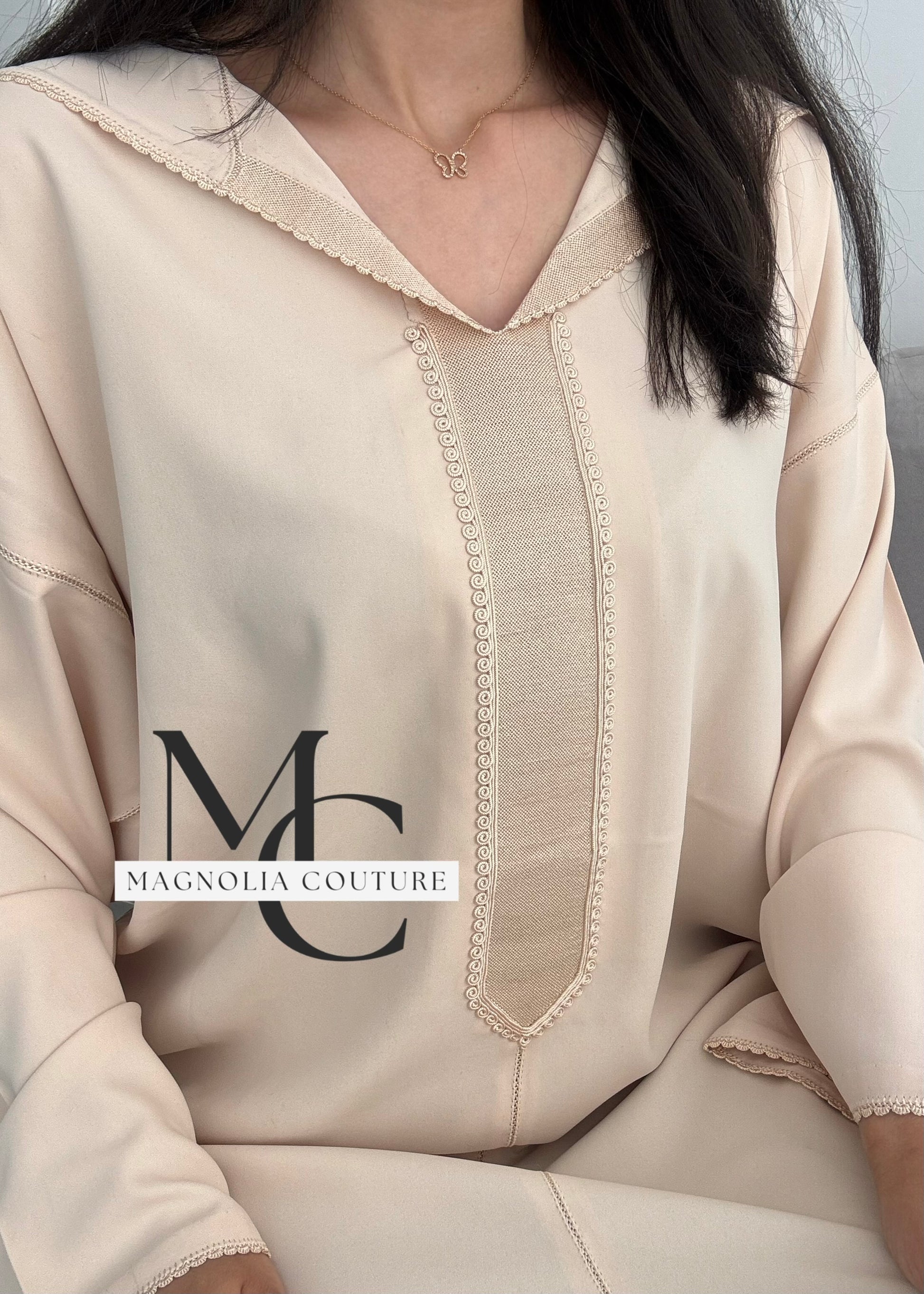 Description : Jellaba de la collection « Héritage » qui fusionne harmonieusement le travail délicat de malam et la finesse de la randa. Cette pièce est confectionnée entièrement à la main, raconte une histoire riche de tradition marocaine. Les heures d'artisanat passionné investies dans chaque détail font de cette jellaba une célébration vivante de l'héritage culturel.