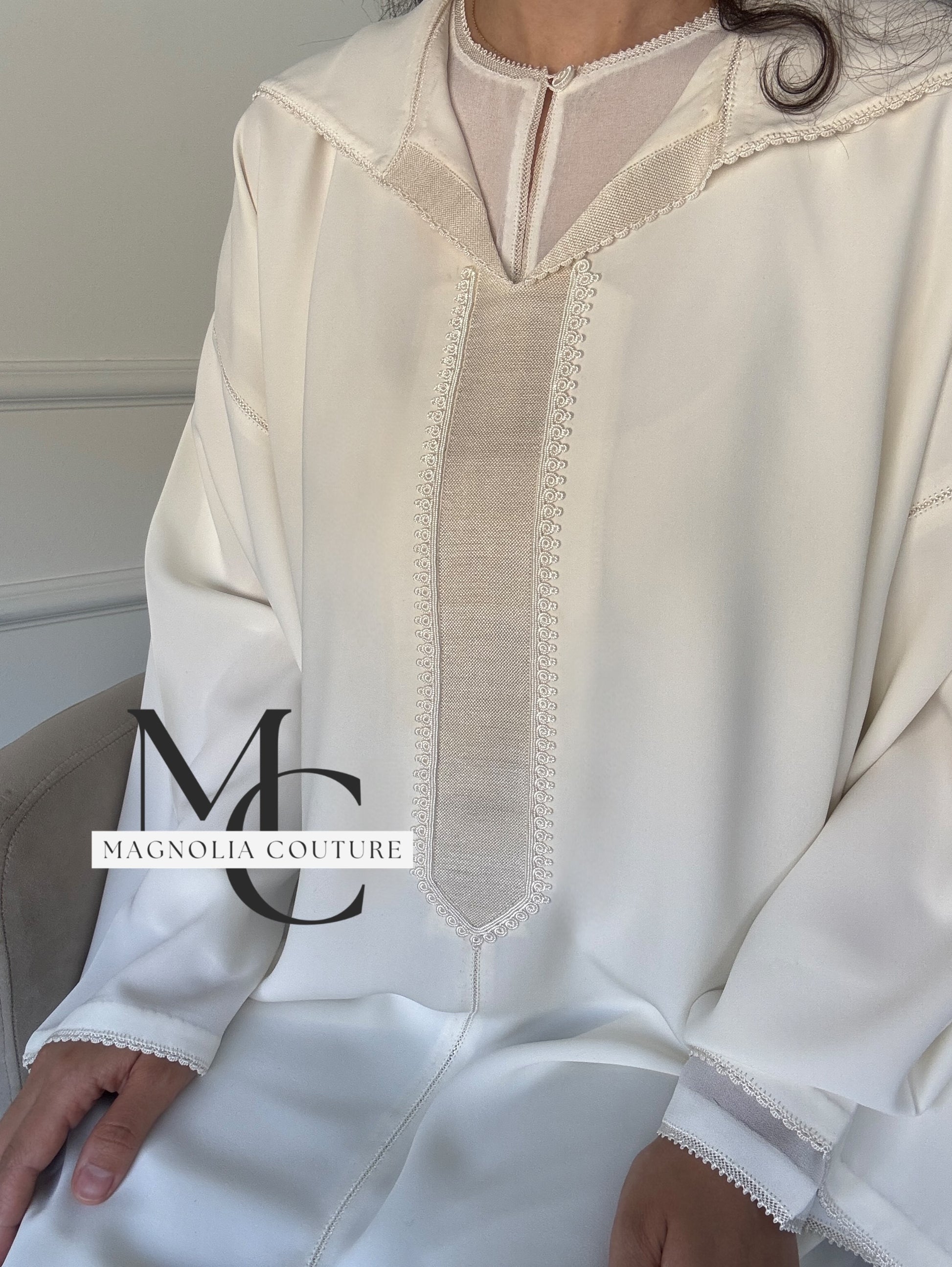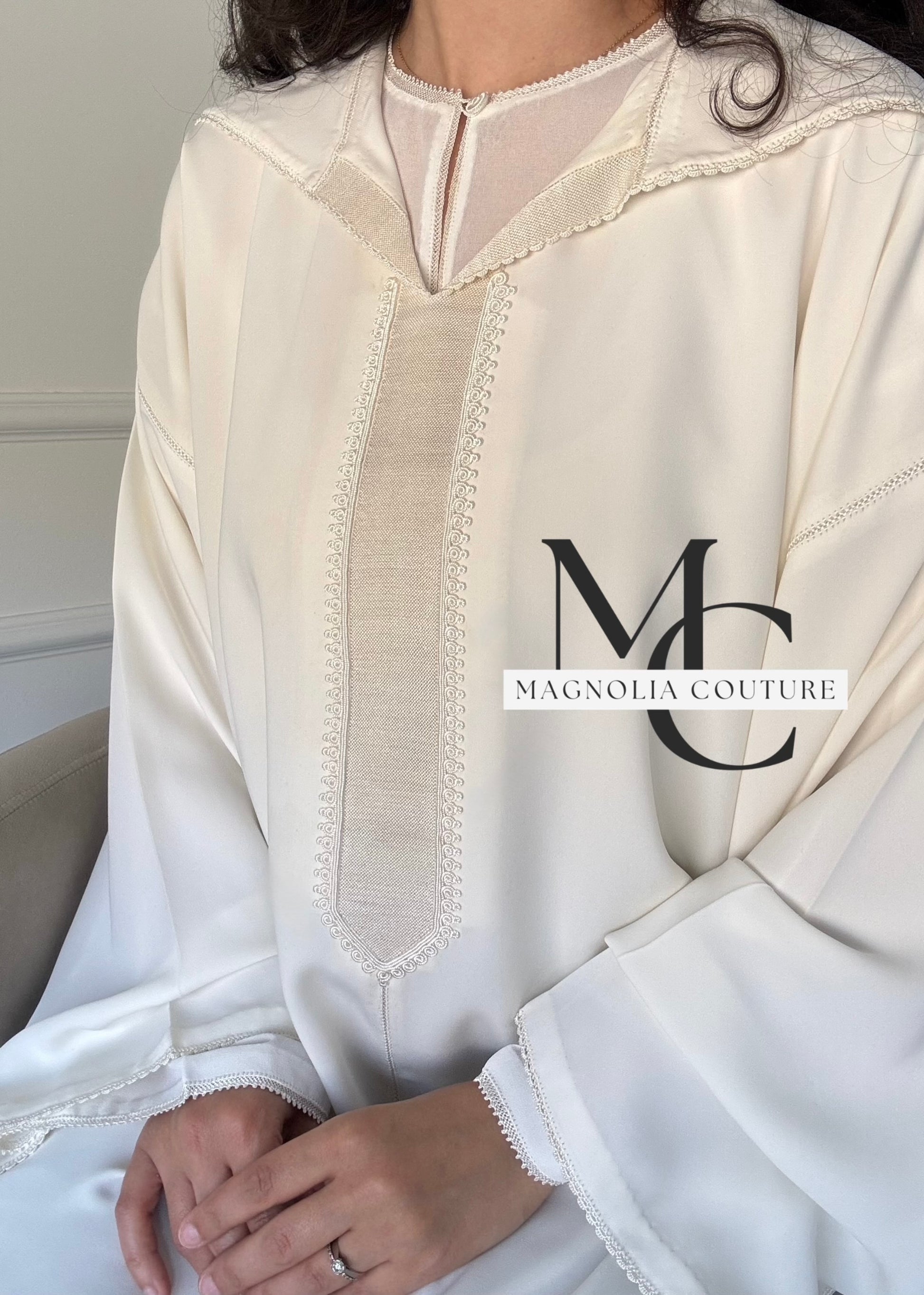Description : Jellaba de la collection « Héritage » qui fusionne harmonieusement le travail délicat de malam et la finesse de la randa. Cette pièce est confectionnée entièrement à la main, raconte une histoire riche de tradition marocaine. Les heures d'artisanat passionné investies dans chaque détail font de cette jellaba une célébration vivante de l'héritage culturel.