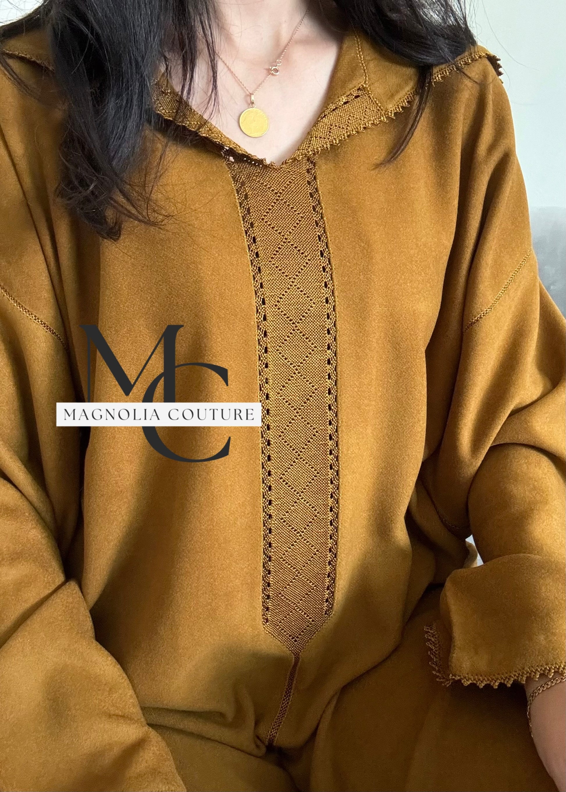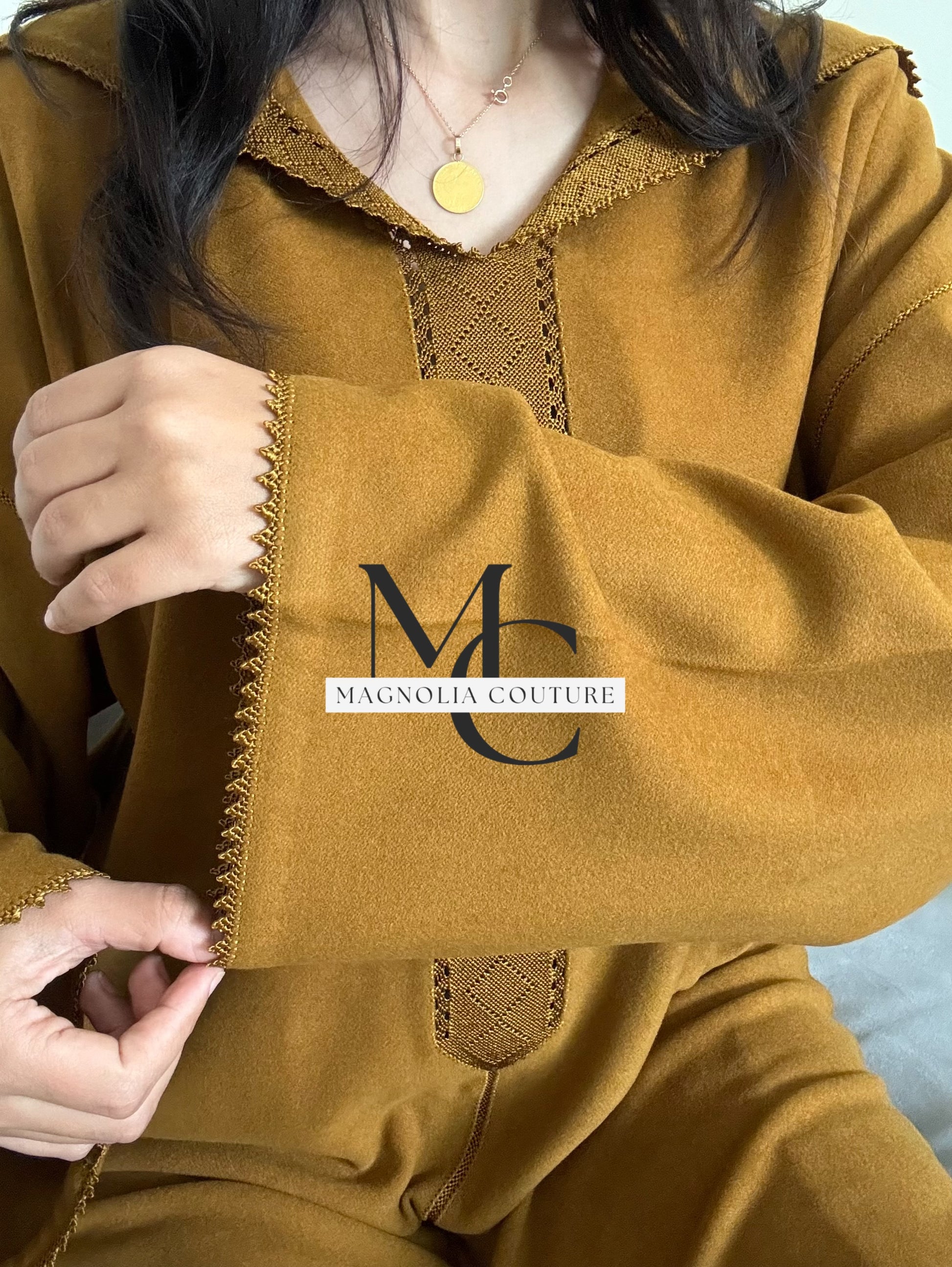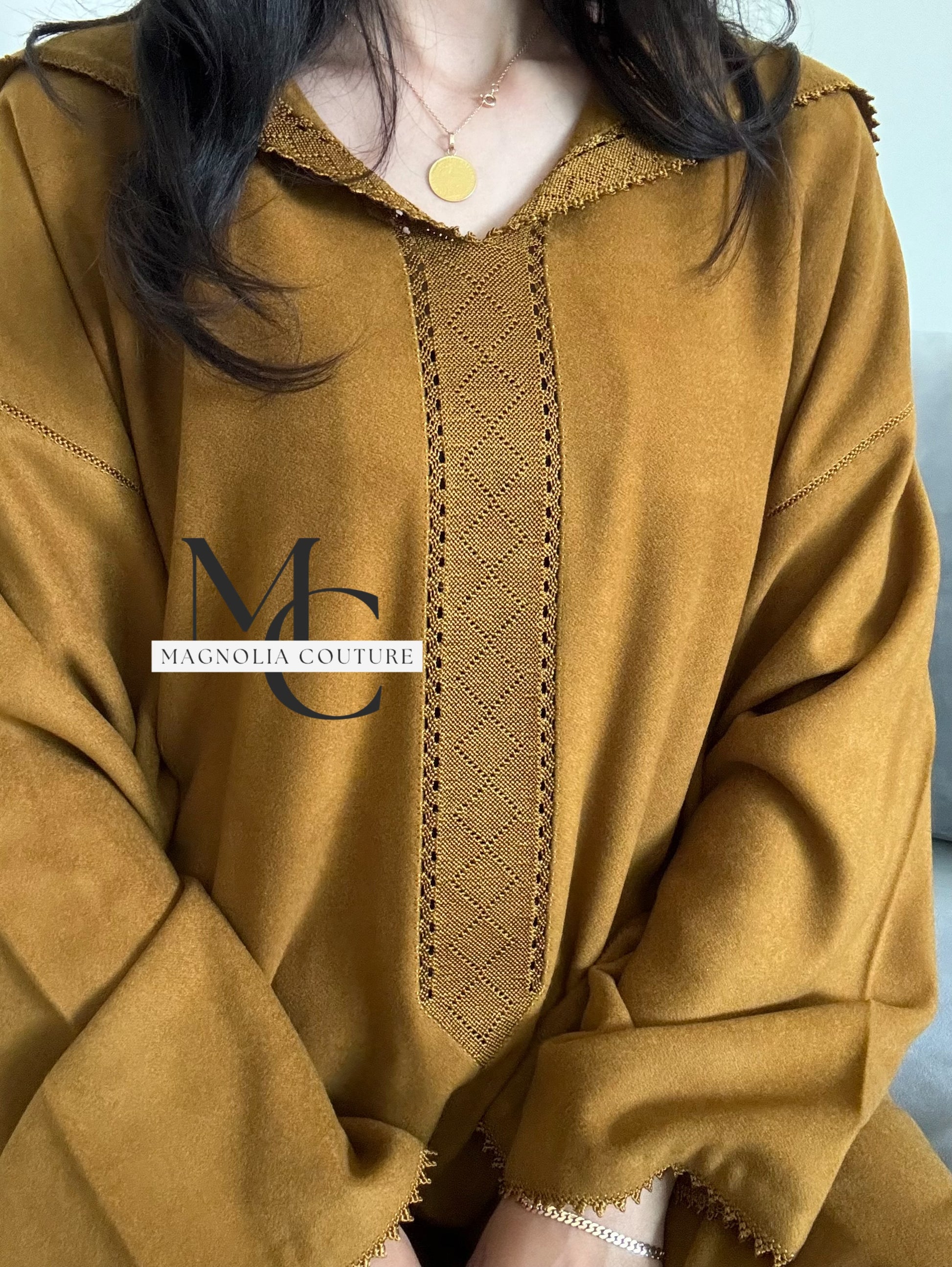 Description : La djellaba travaillée entièrement à la main avec randa hssira et décorée avec des gouzas.