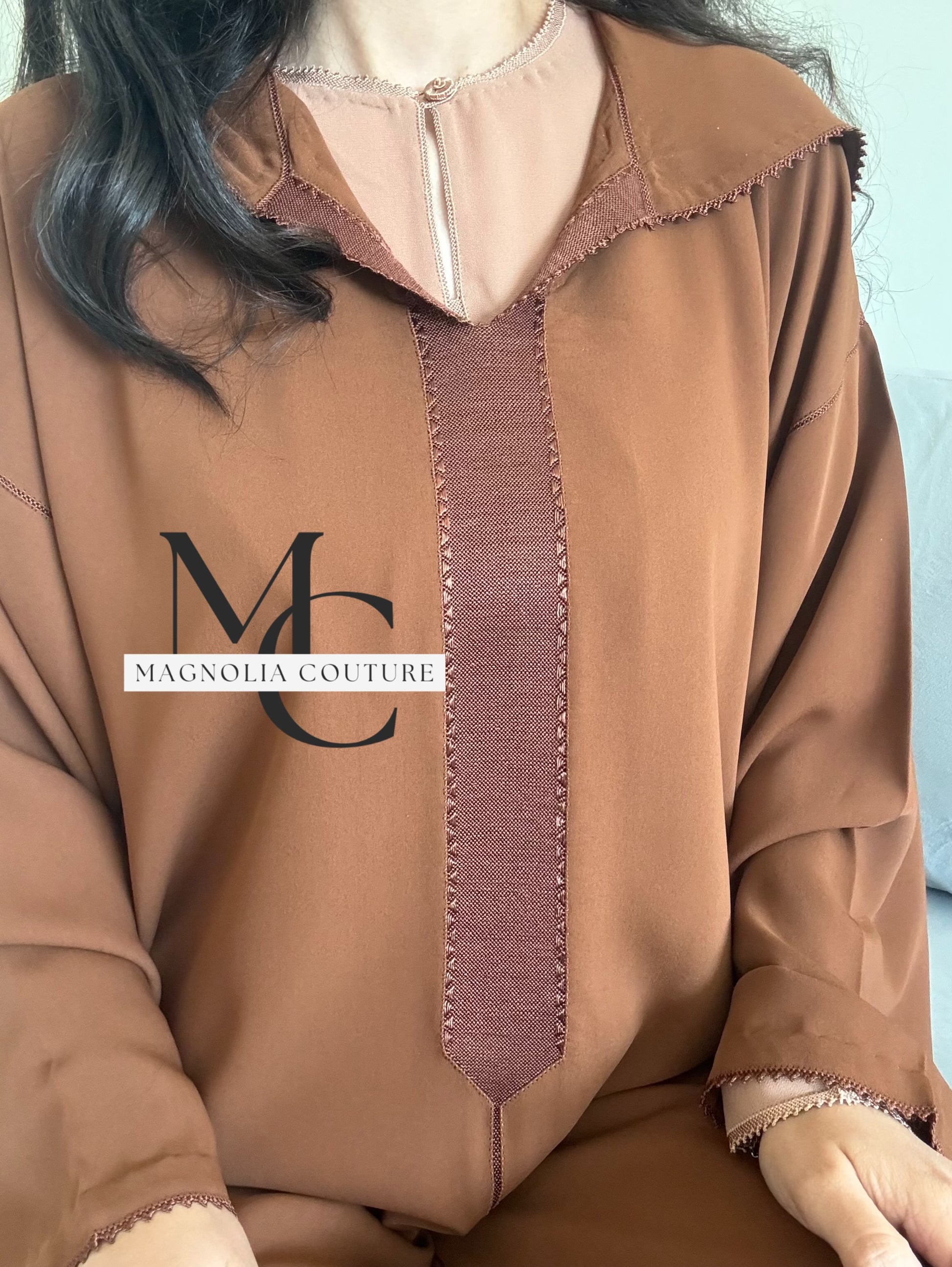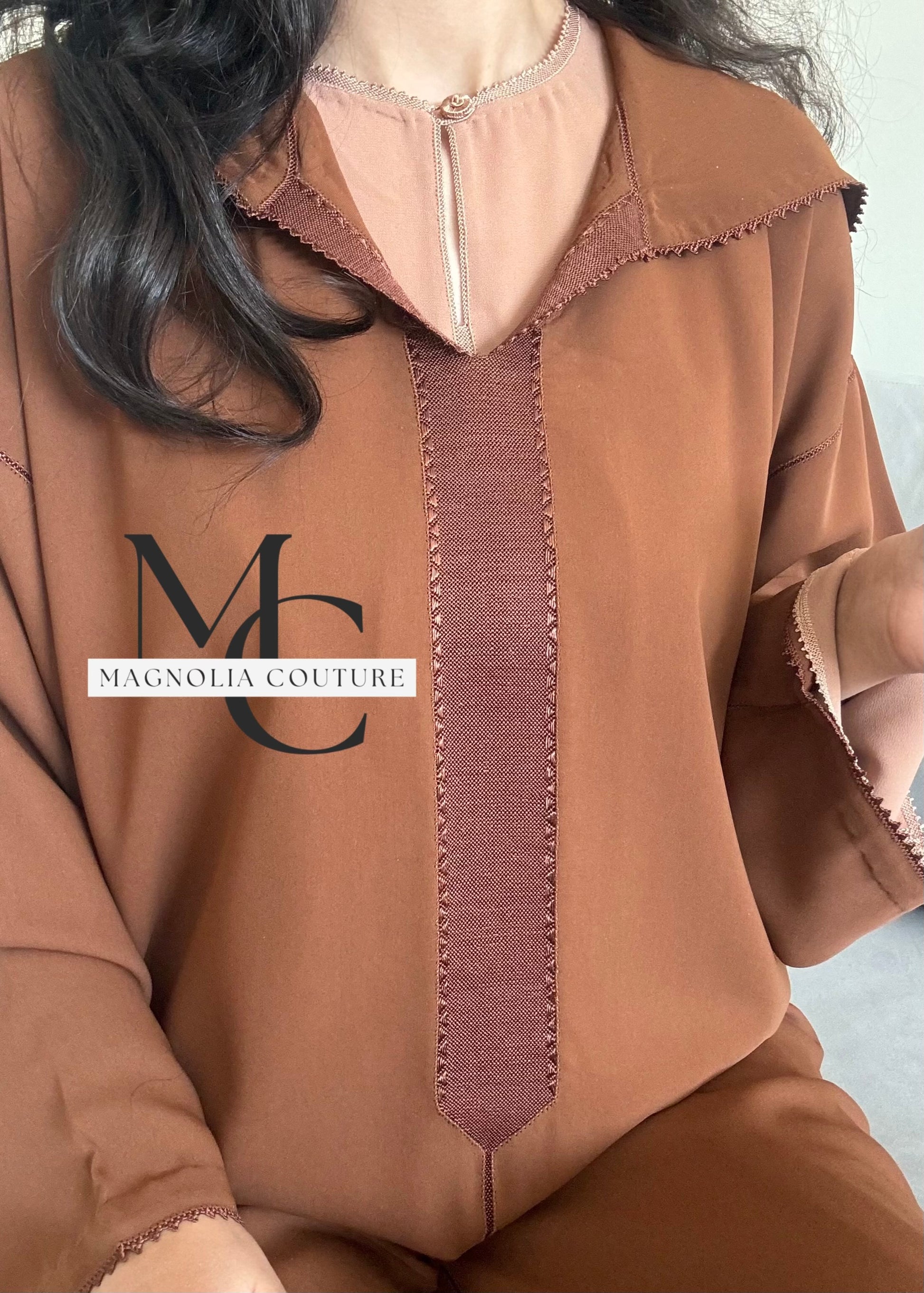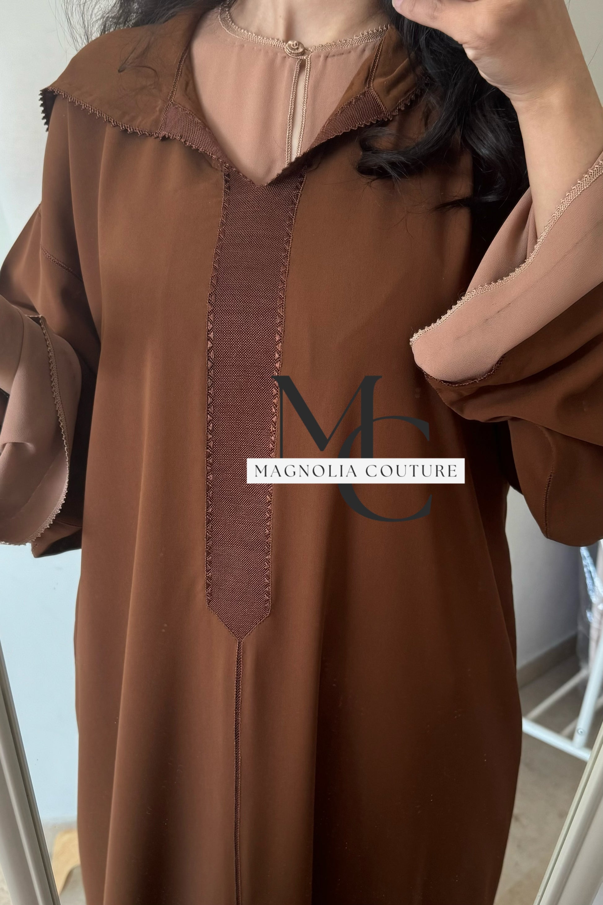 Description : La jellaba est confectionnée avec randa Hssira à la main et brodée, cette pièce incarne l'artisanat raffiné et le charme traditionnel marocain.