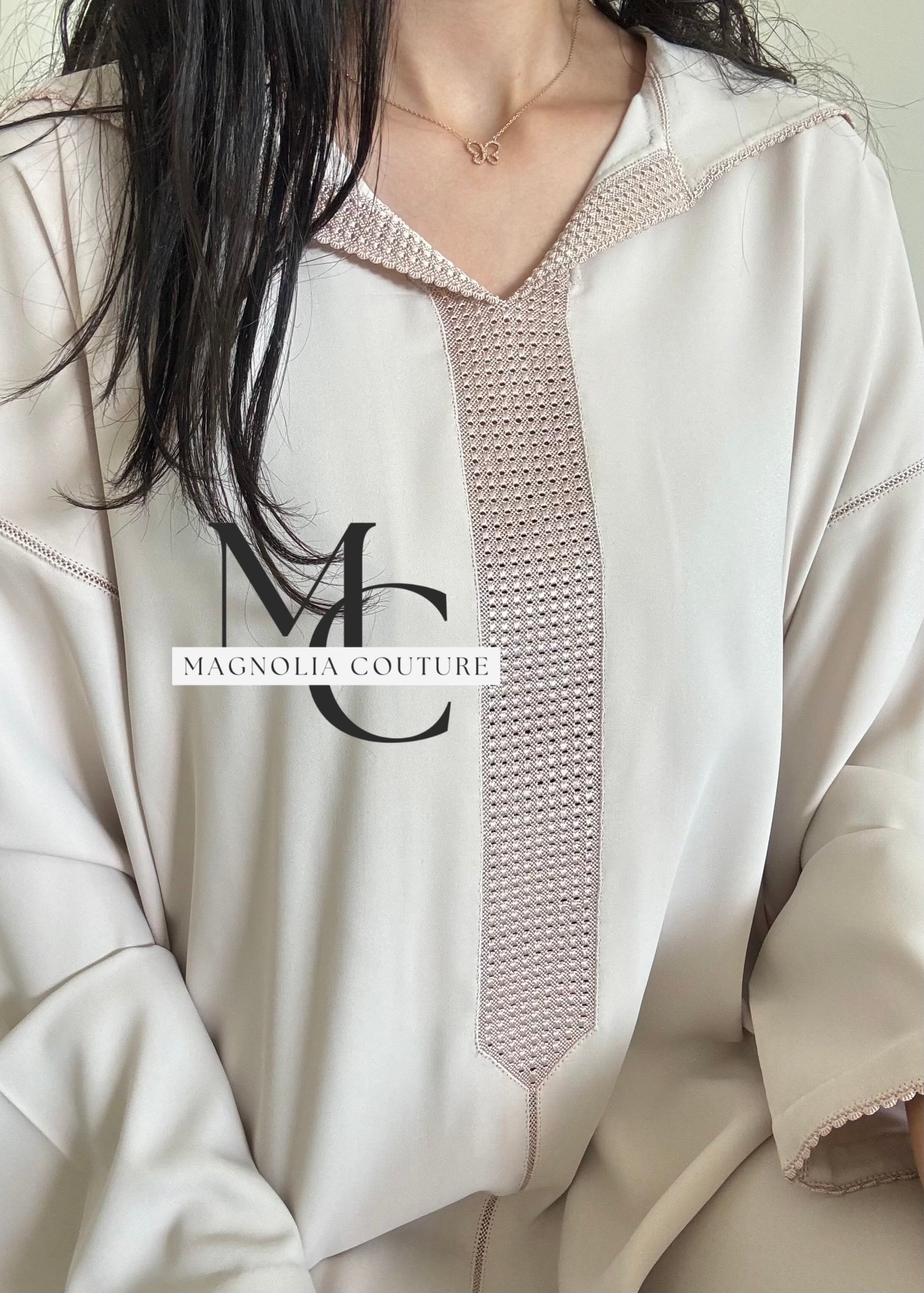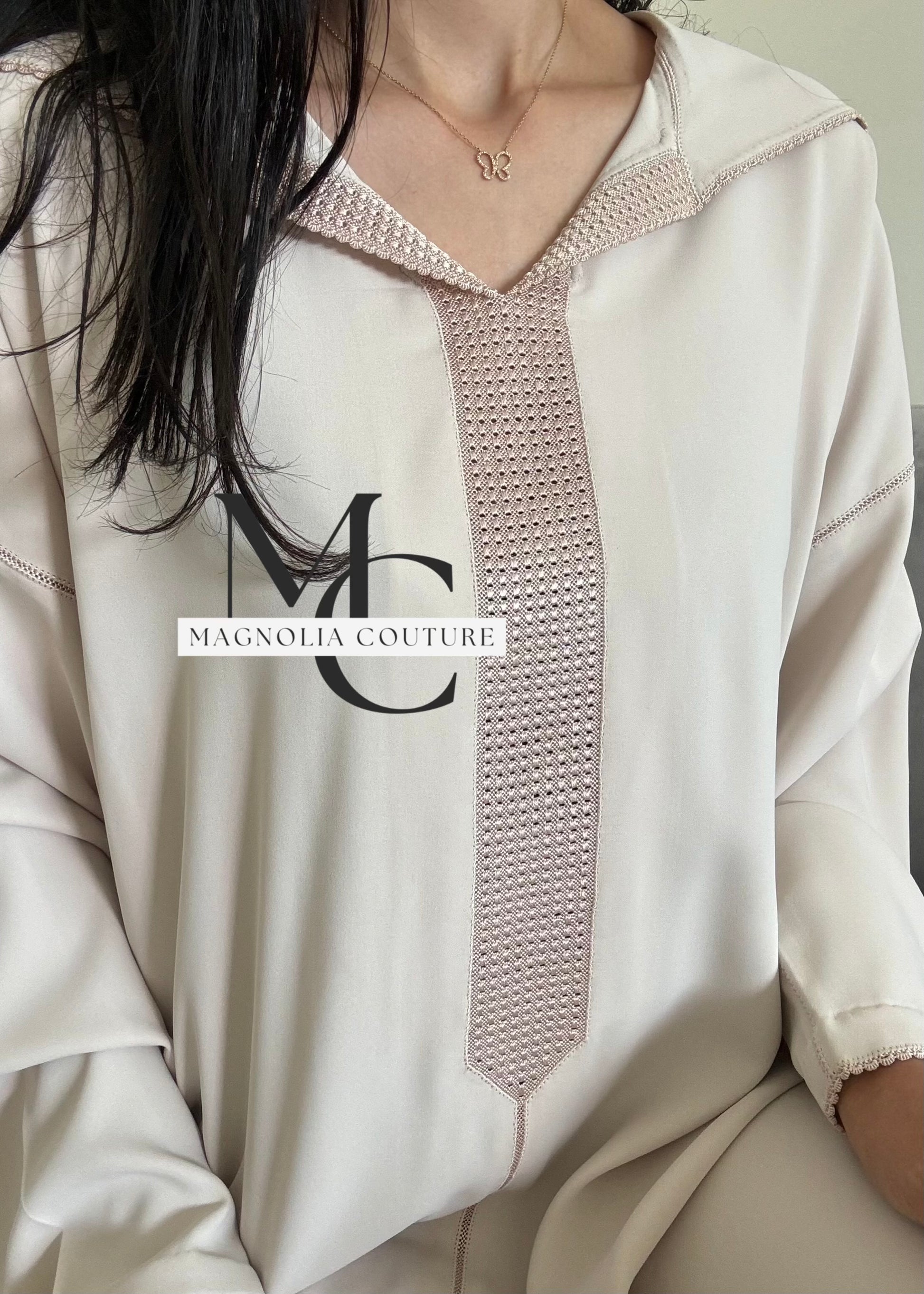 Description : La jellaba travaillée finement avec randa hssira et plusieurs gourmettes, réalisée avec soin et finesse.