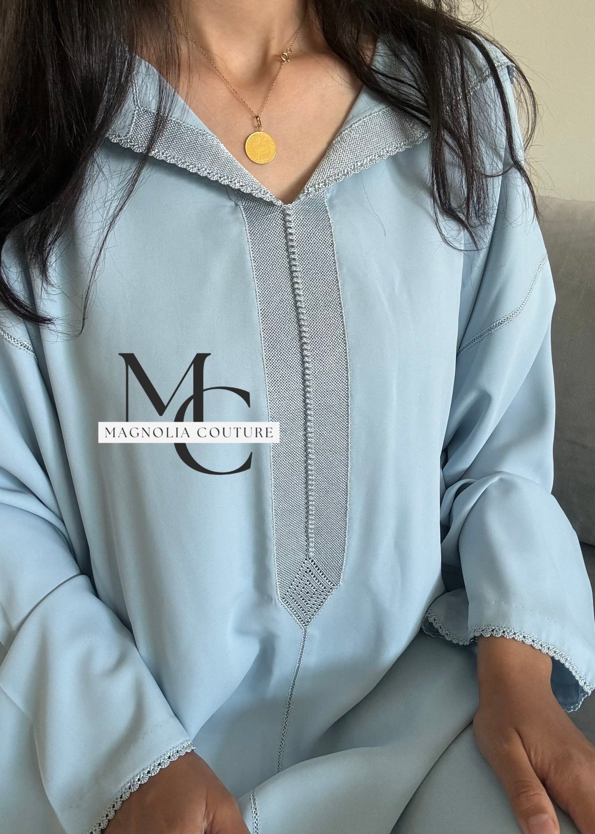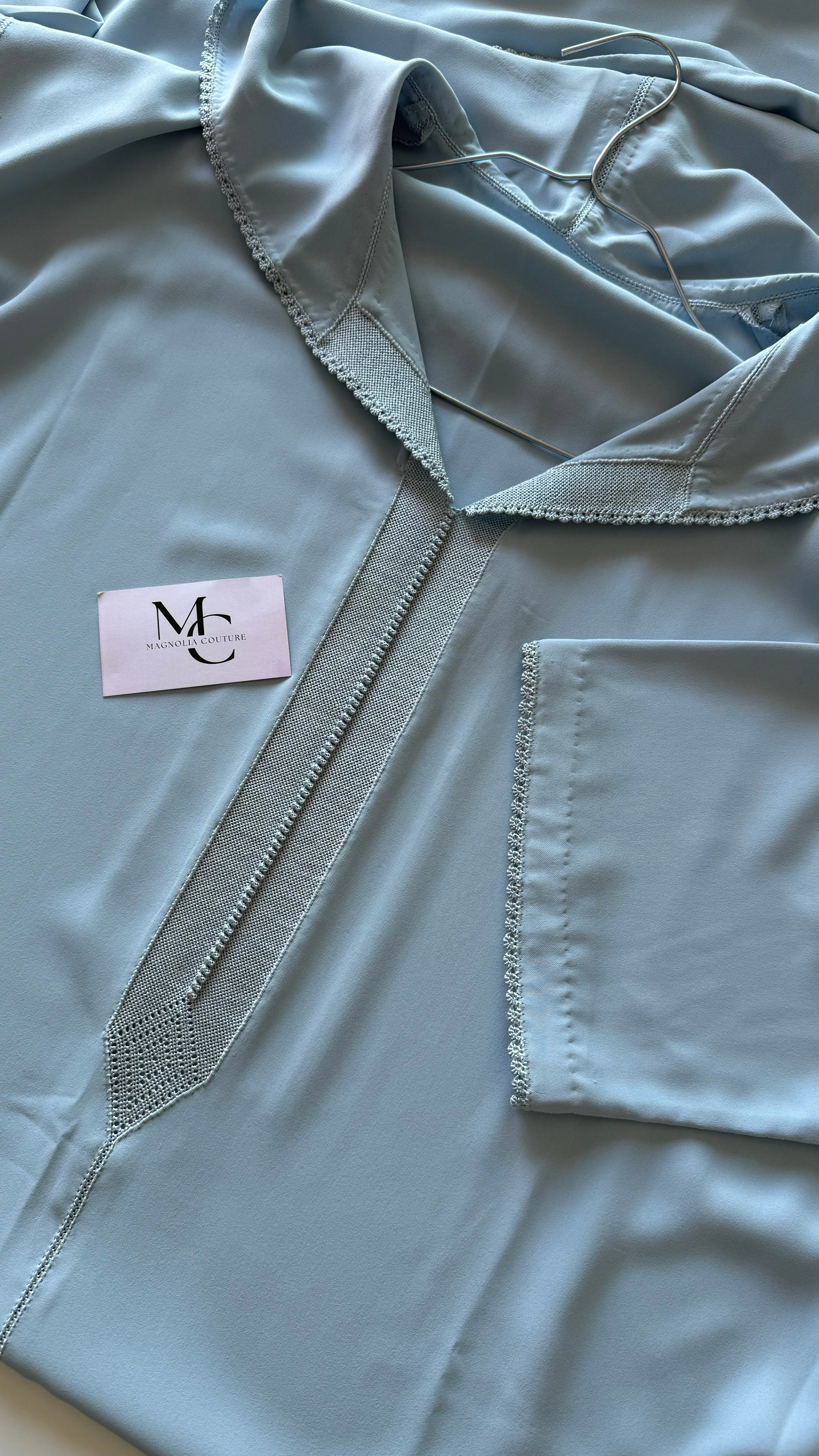 Description : La jellaba travaillée entièrement à la main avec randa et décorée avec aqidates randa et gouza.
