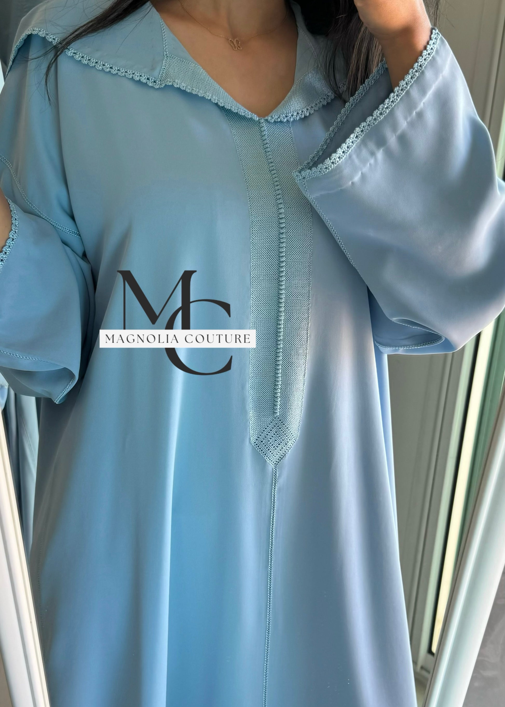 Description : La jellaba travaillée entièrement à la main avec randa et décorée avec aqidates randa et gouza.