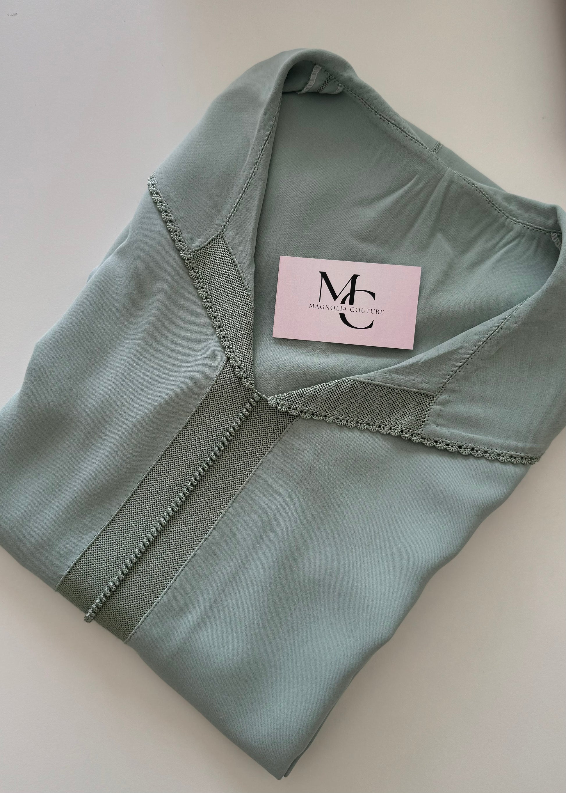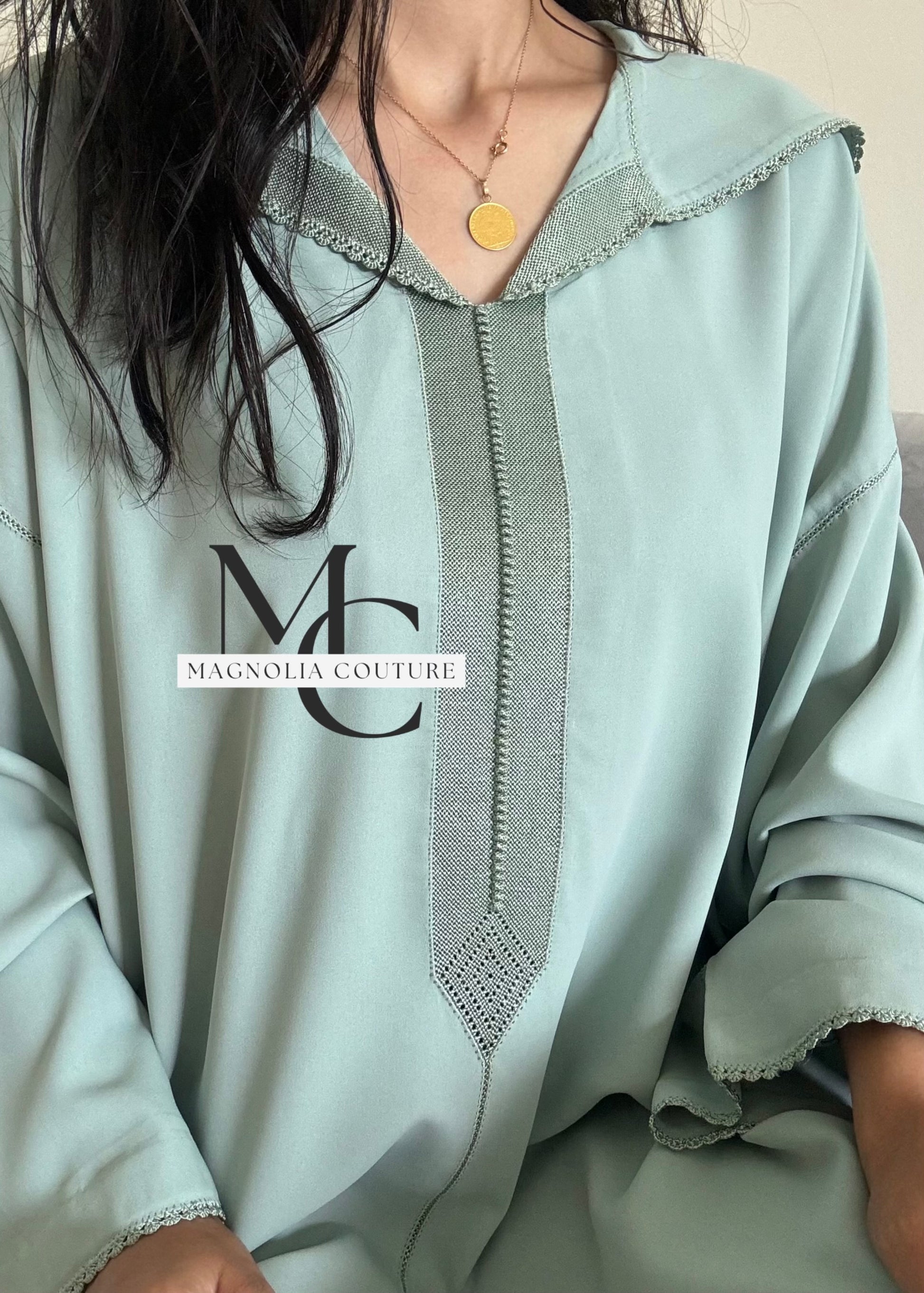 Description : La jellaba travaillée entièrement à la main avec randa et décorée avec aqidates randa et gouza.