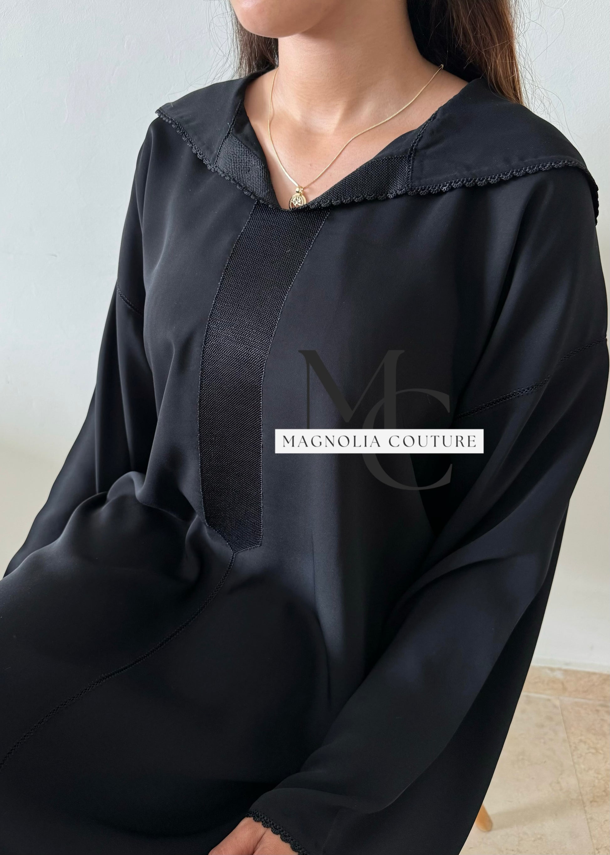 Description : La jellaba noire, une élégance intemporelle et classe qui incarne la simplicité, un modèle qui reste toujours chic et raffiné.