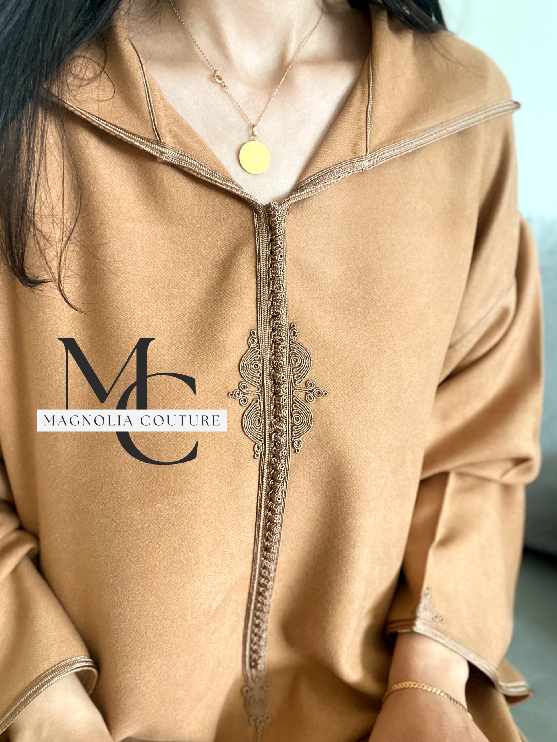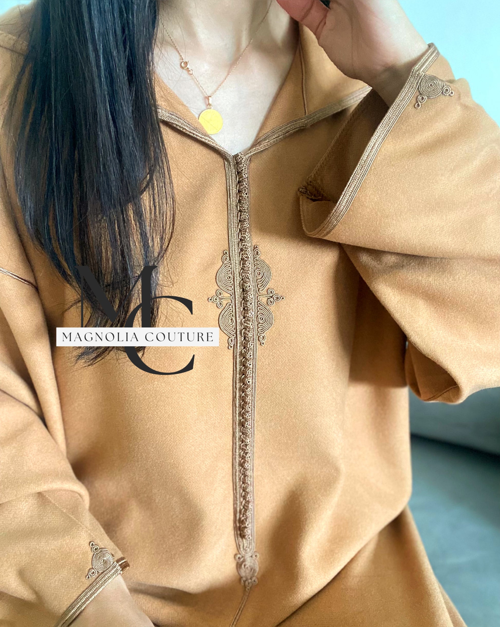 Description : Jellaba travaillée entièrement à la main sur un tissu en cachemire, avec des détails de zwaq malam.