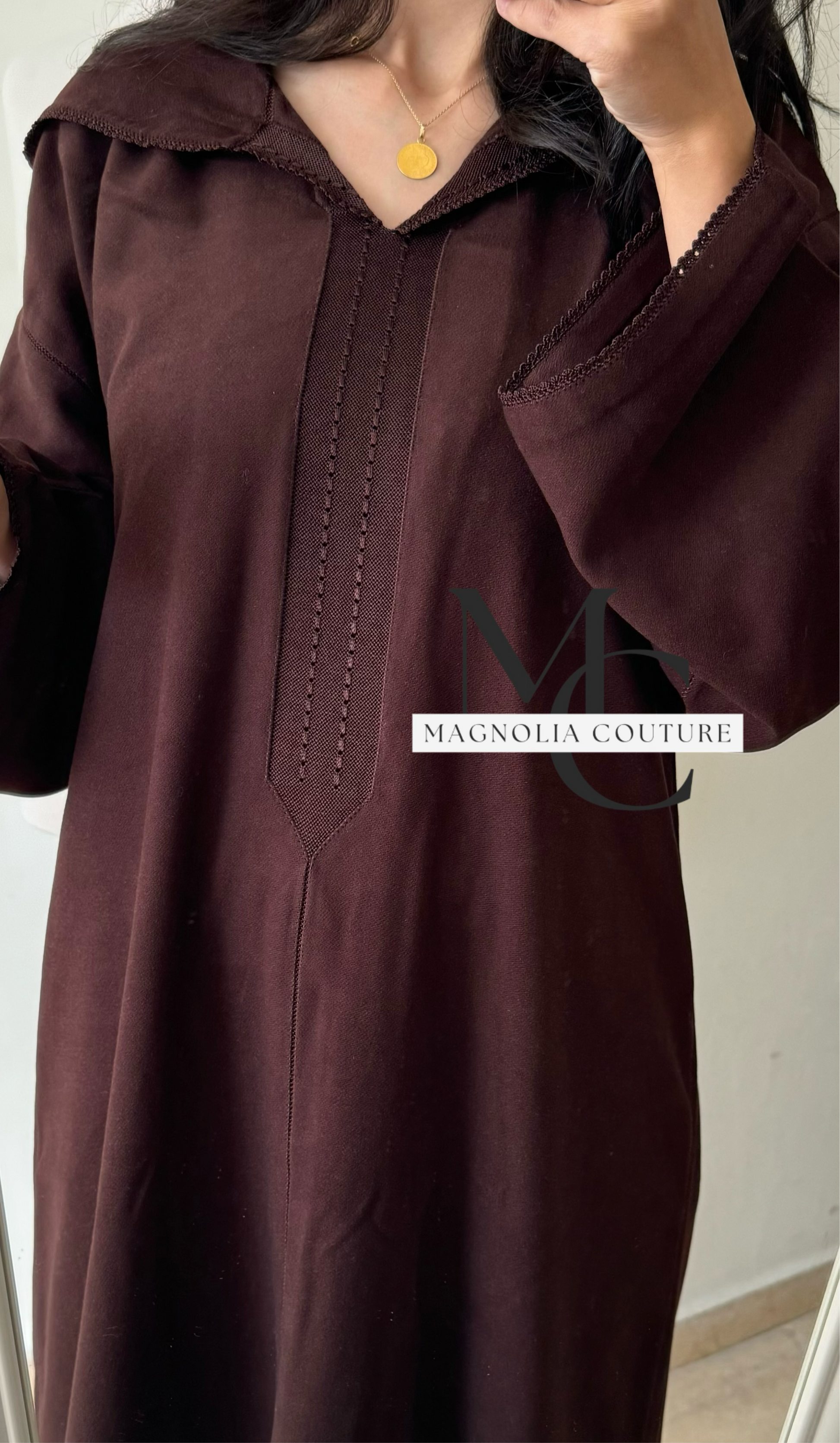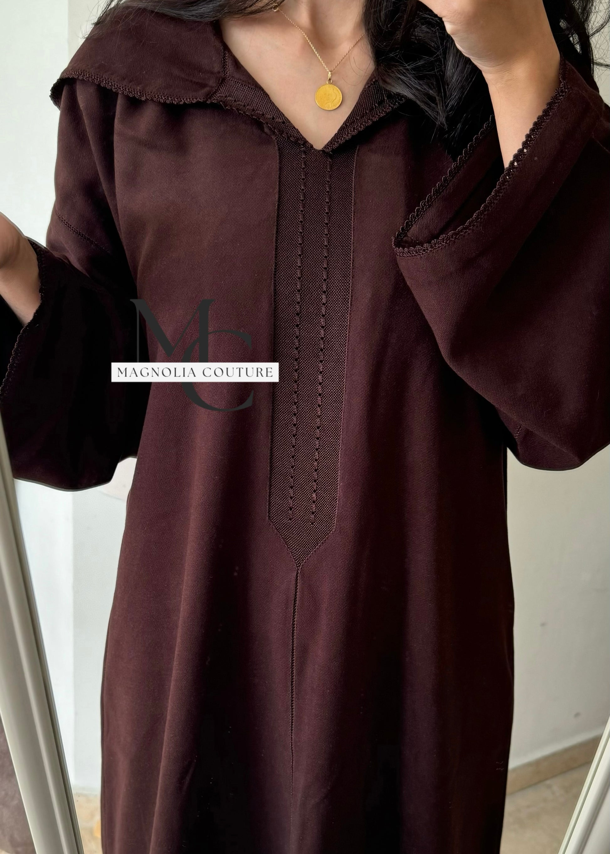 Description : La djellaba travaillée entièrement à la main avec randa hssira et décorée avec des gouzas.