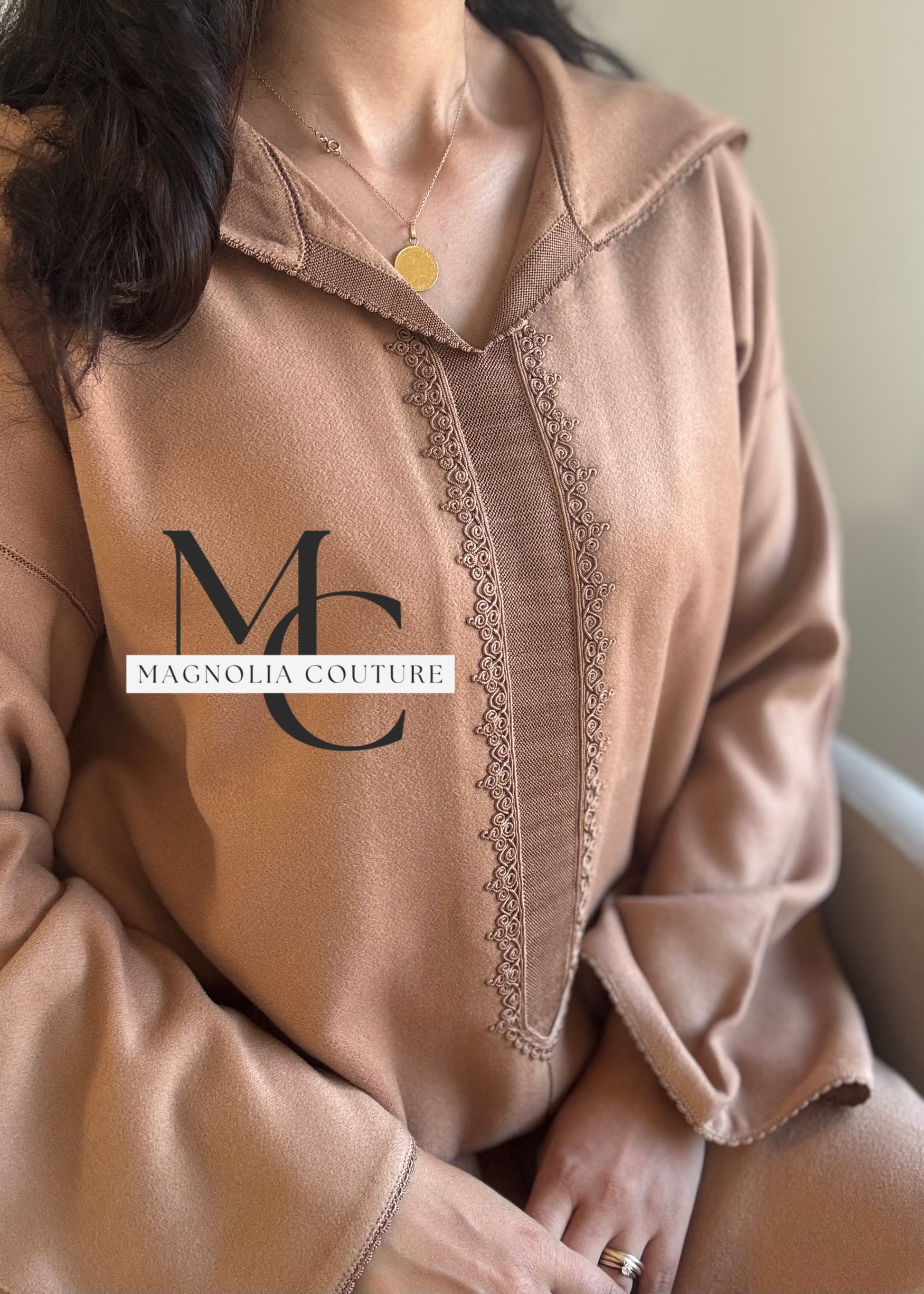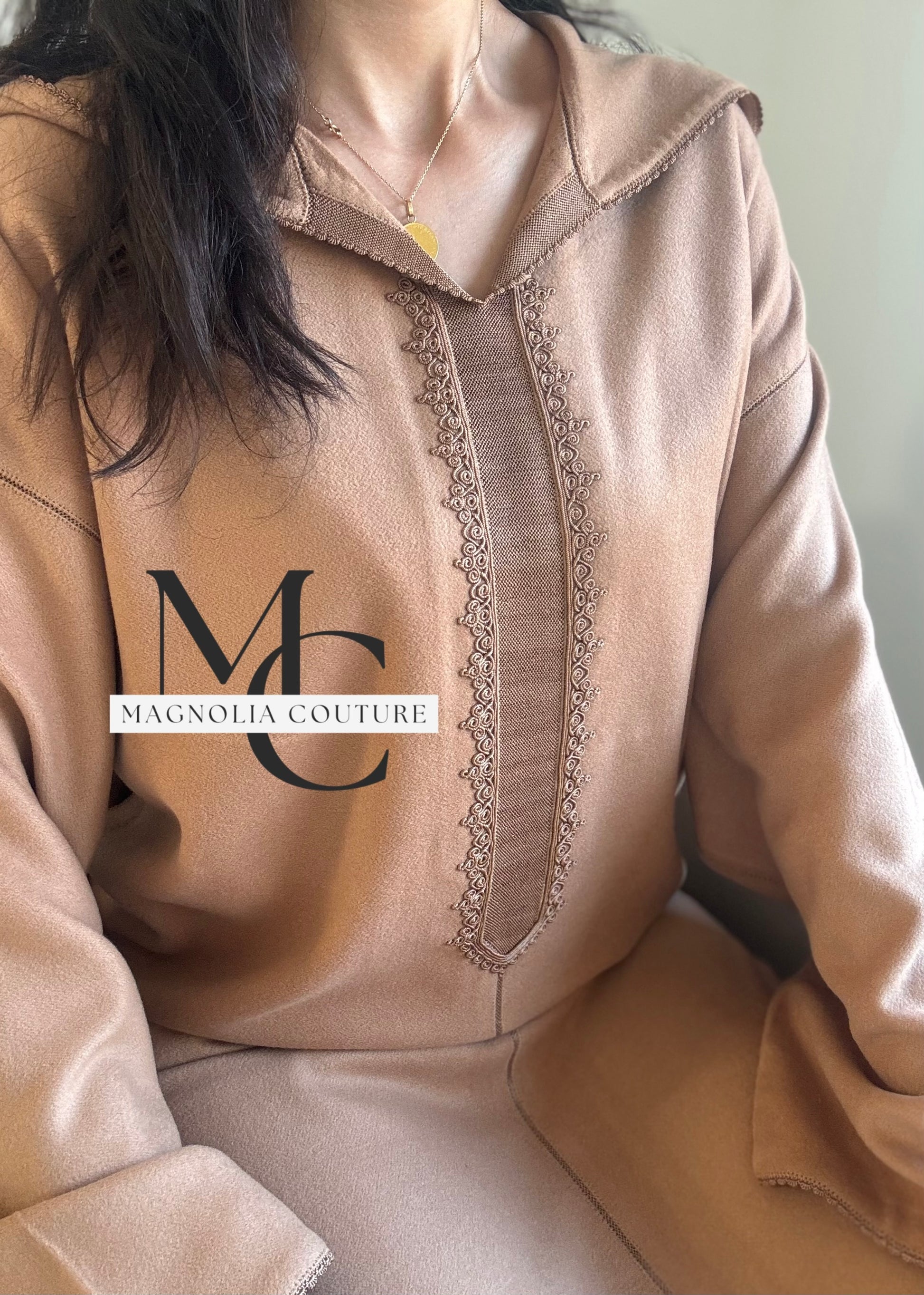 Description : Jellaba de la collection « Héritage » qui fusionne le travail de malam et la finesse de la randa. Cette pièce est confectionnée entièrement à la main, raconte une histoire riche de tradition marocaine. Les heures d'artisanat passionné investies dans chaque détail font de cette jellaba une célébration vivante de l'héritage culturel.